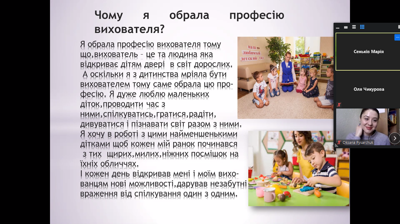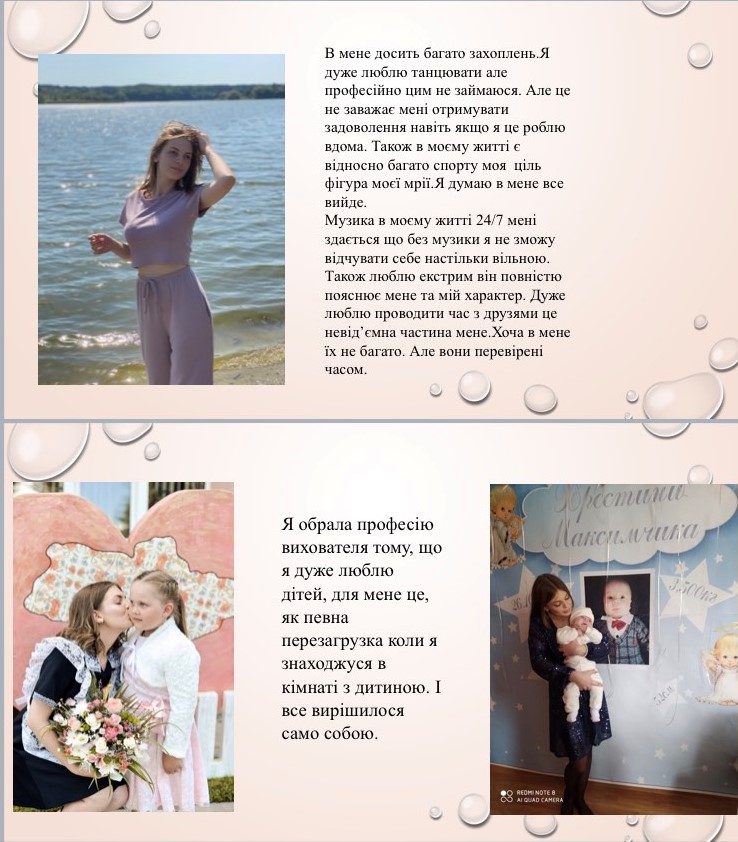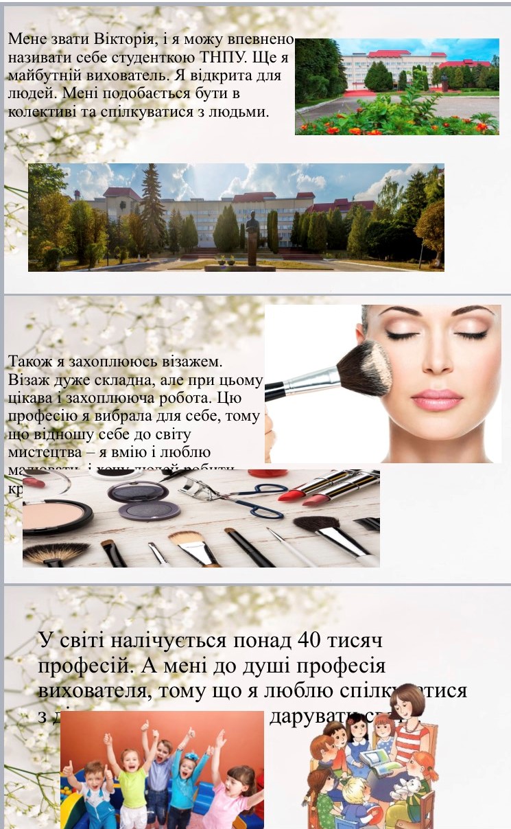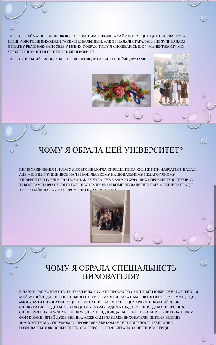 Цікаво сьогодні минула остання пара зі "Вступу до спеціальності" у групи ДО-11 під керівництвом викладачів О. Т. Писарчук та Н. О. Ратушняк. Студентки вчилися презентувати себе, використовуючи як словесні, так і візуальні форми. У позитивній та дружній атмосфері кожна студентка поділилася частинками своєї душі: захопленнями, інтересами, планами,мріями та чому обрали саме цю спеціальність. Малювання, бісероплетіння, хоровий спів, приготування смаколиків, макіяж - це та багато іншого вміють та люблять робити першокурсниці-майбутні виховательки. Впевнені, що ці багатогранні особистості точно зможуть зацікавити дошкільнят та заволодіти їхньою прихильністю.