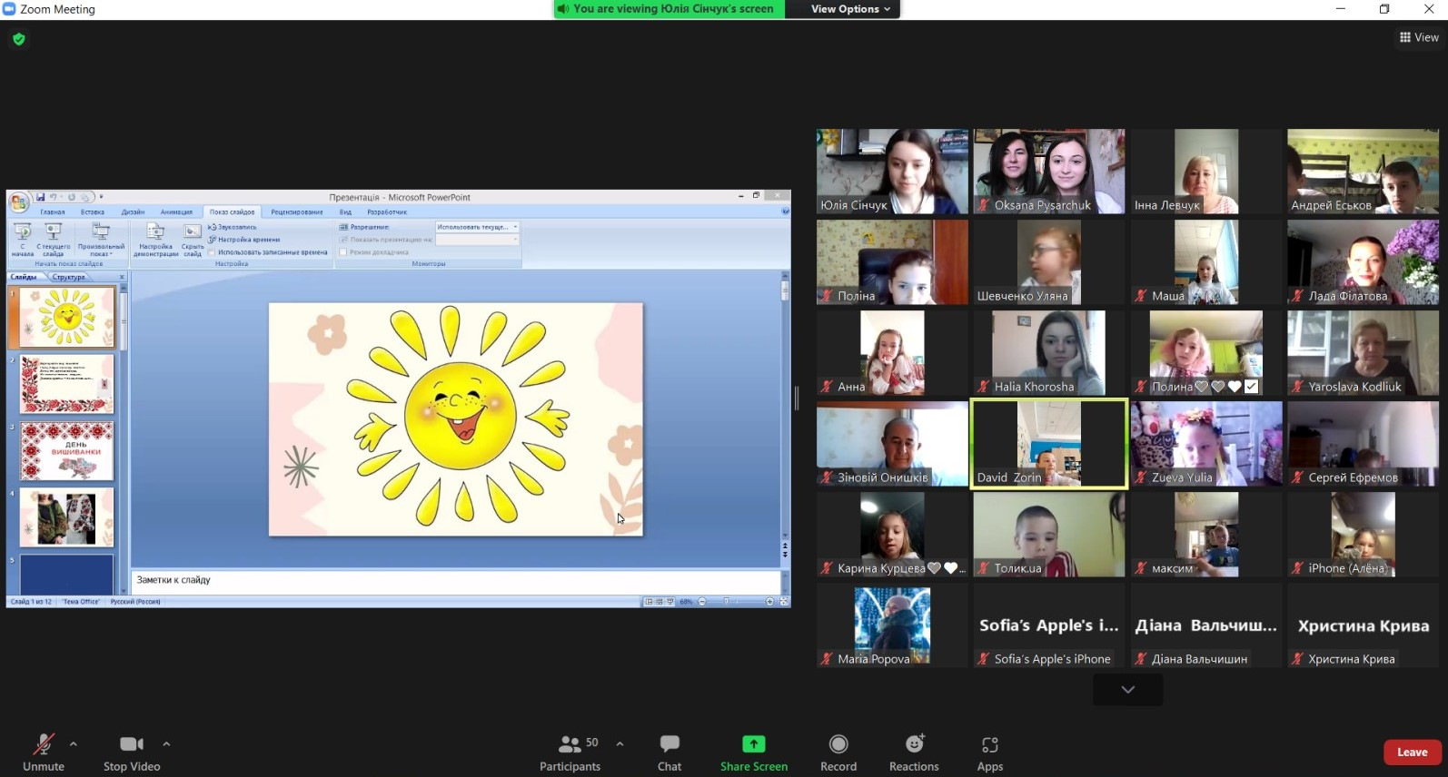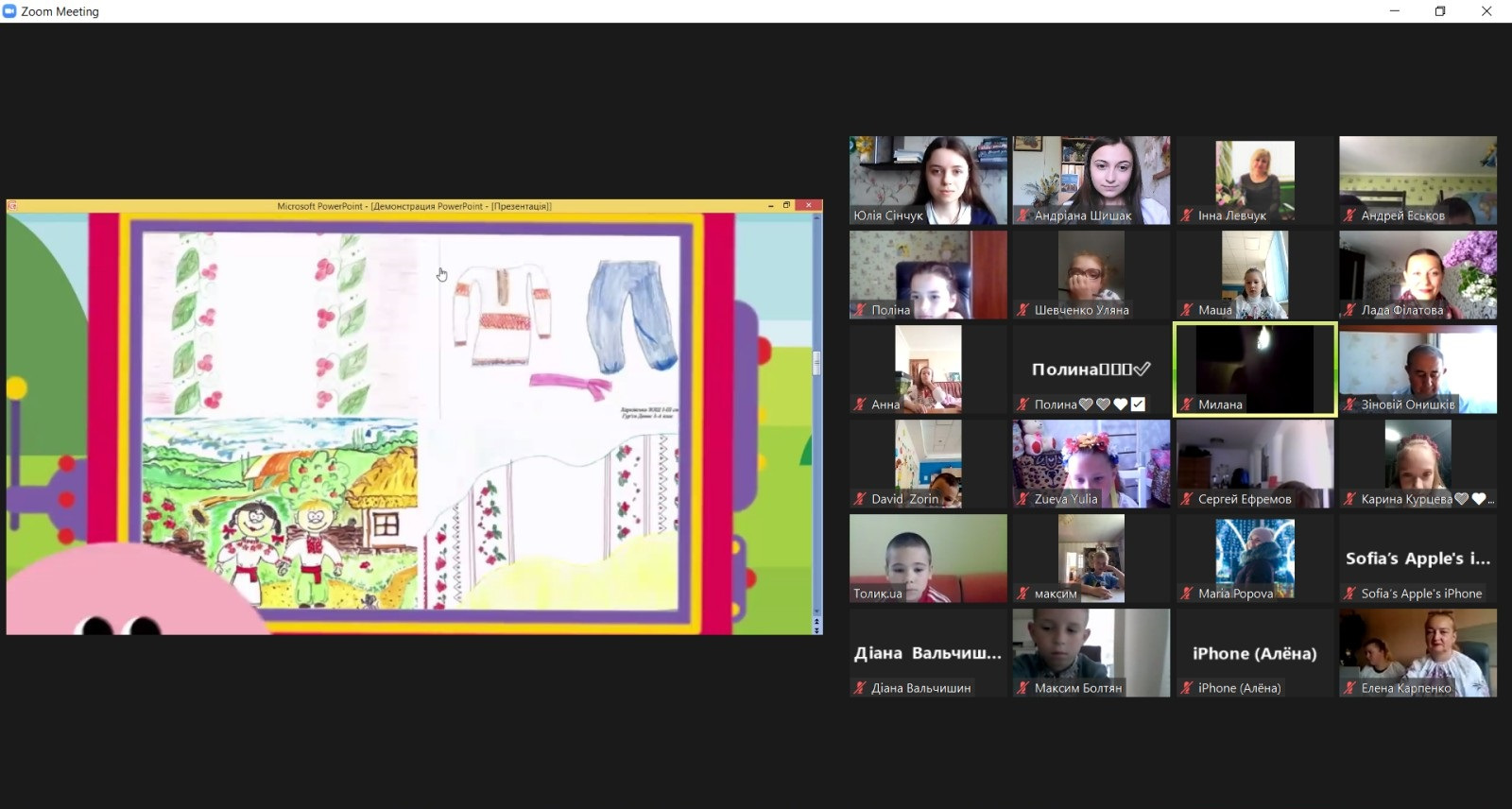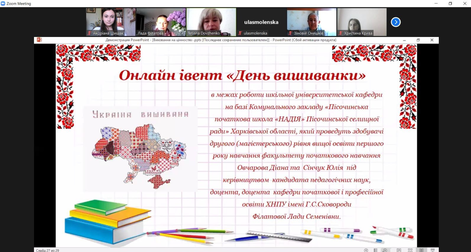 Одразу після лекції відбувся онлайн-івент «День вишиванки» в межах роботи шкільної університетської кафедри на базі Комунального закладу «Пісочинська початкова школа «НАДІЯ» Пісочинської селищної ради» Харківської області. Такий ціннісний захід у співпраці з учнями провели здобувачі другого (магістерського) рівня вищої освіти першого року навчання факультету початкового навчання Овчарова Діана та Сінчук Юлія під керівництвом кандидата педагогічних наук, доцента, доцента кафедри початкової і професійної освіти ХНПУ імені Г.С.Сковороди Філатової Лади Семенівни.