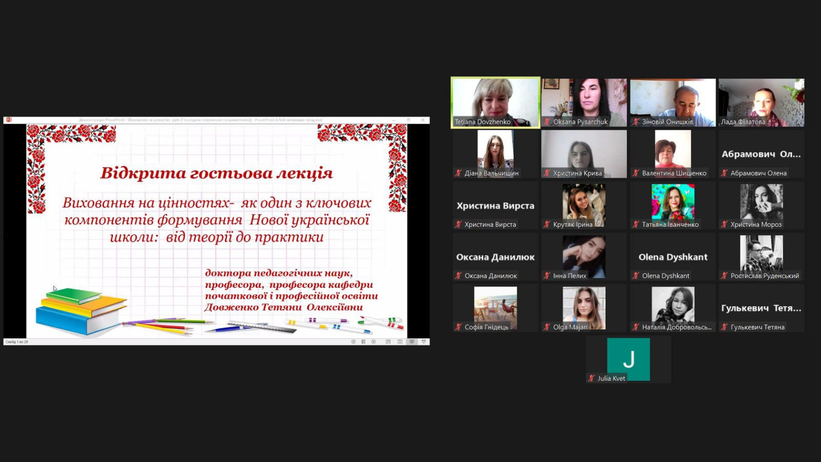 19.05.2022 року на факультеті педагогіки і психології для здобувачів другого (магістерського) рівня вищої освіти ОП «Початкова освіта» Тернопільського національного педагогічного університету імені Володимира Гнатюка відбулася відкрита гостьова лекція доктора педагогічних наук, професора, професора кафедри початкової і професійної освіти, декана факультету початкового навчання Харківського національного педагогічного університету імені Г.С.Сковороди Довженко Т. О.. Тетяна Олексіївна цікаво доповіла на тему «Виховання на цінностях – як один з ключових компонентів Нової української школи: від теорії до практики». На зустрічі також були присутні викладачі кафедри педагогіки і методики початкової та дошкільної освіти ТНПУ.