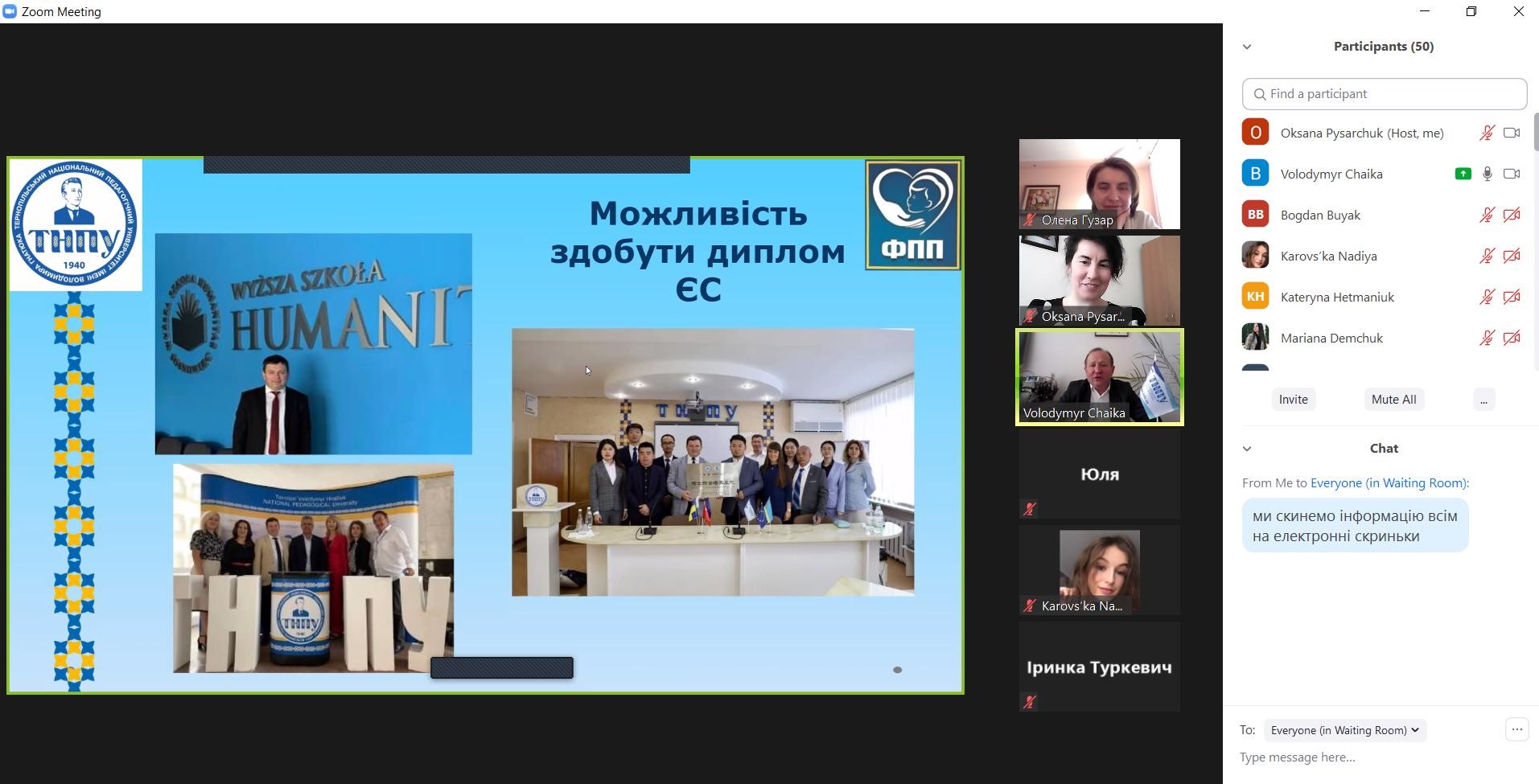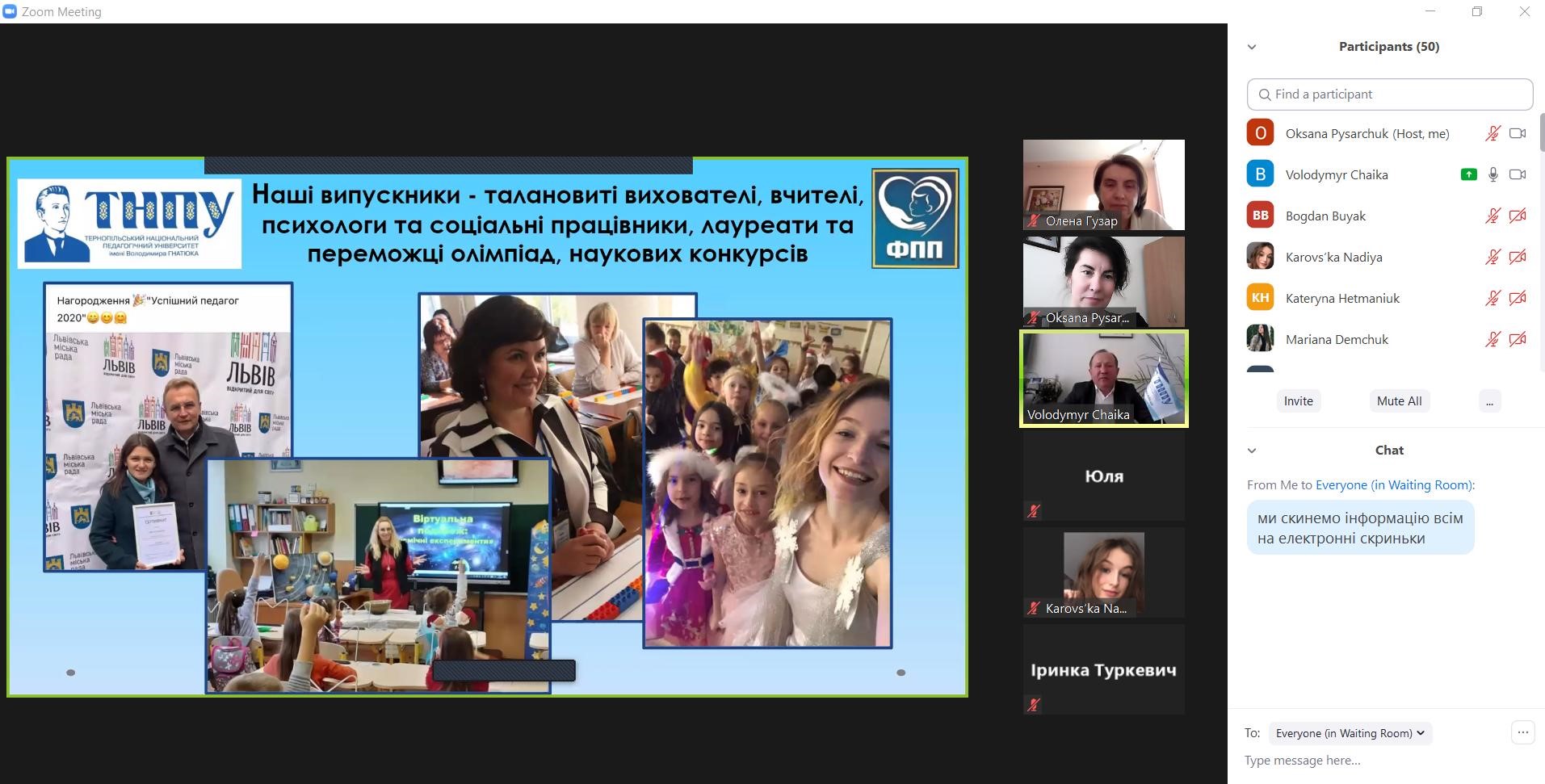 Із вітальним словом виступив ректор Б. Б. Буяк, розповівши присутнім про високий рівень та унікальність нашого університету. На питання щодо вступної компанії відповів секретар приймальної комісії Ю. Р. Древніцький. Із матеріально-технічною базою факультету, різноманіттям спеціальностей та особливостями вступу на них майбутніх студентів ознайомив незмінний модератор, декан факультету В. М. Чайка. Про освітні програми ("Дошкільна освіта", "Початкова освіта", "Психологія", "Психологія бізнесу і управління", "Соціальна робота", "Менеджмент соціокультурної діяльності", "Логопедія. Спеціальна психологія", "Менеджмент", "Соціальна робота (Соціальне адміністрування у громаді)", "Соціальна педагогіка", "Спеціальна освіта (Інклюзивна освіта)", "Психологія бізнесу і управління") розповіли заступники декана (О. Т. Писарчук та Г. Б. Чайковська), завідувачі кафедр (О. І. Янкович, О. В. Гузар, Г. М. Мешко, В. А. Поліщук, Г. К. Радчук), гарант ОП М. О. Орап.