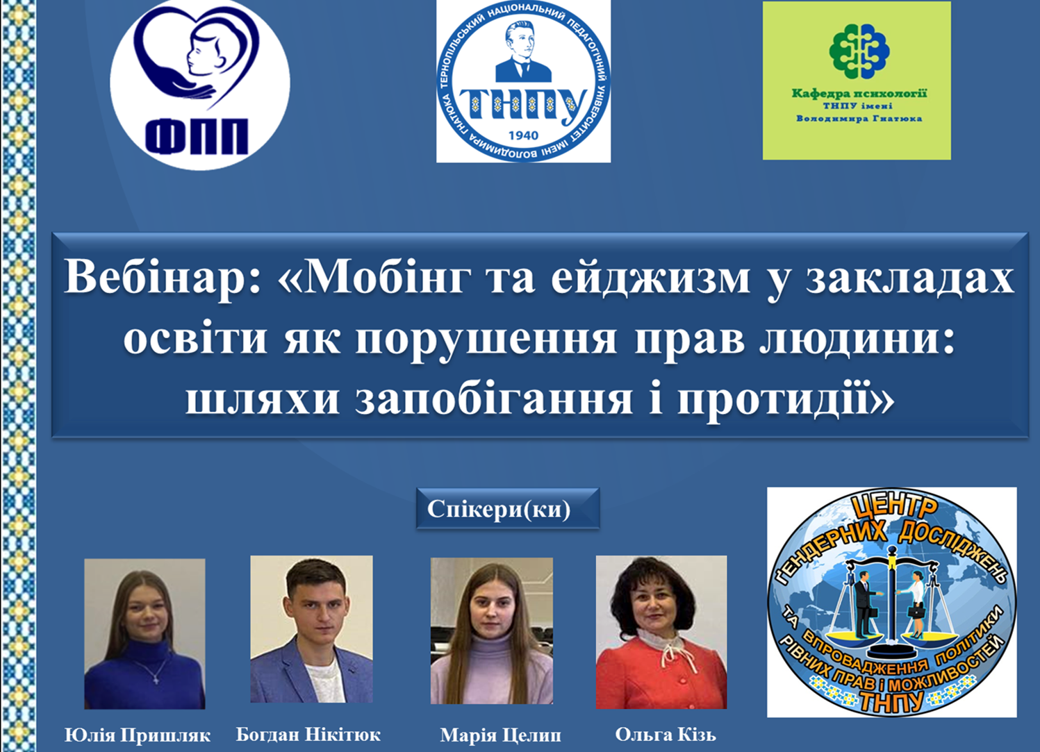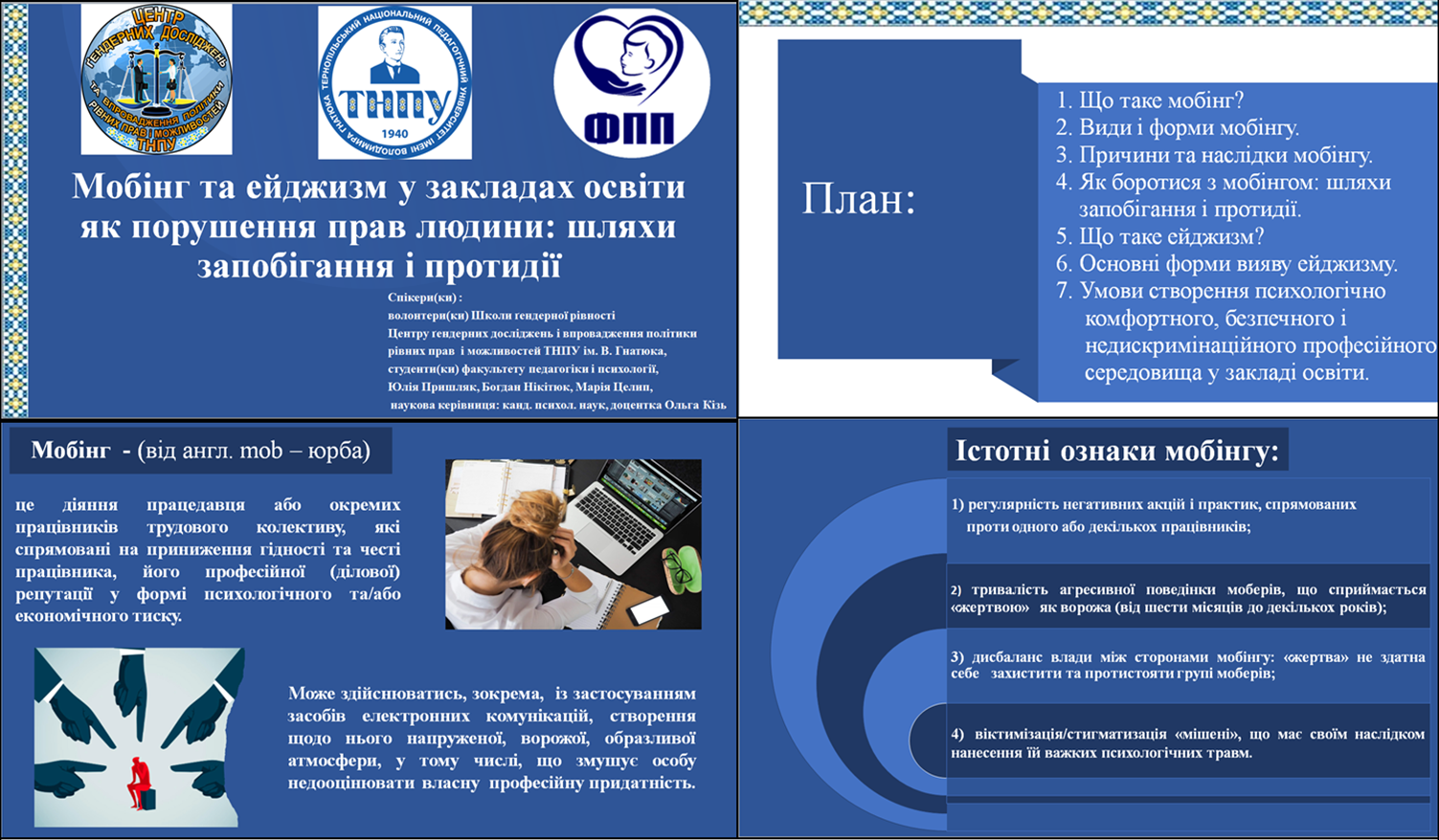 Волонтери та волонтерки Школи ґендерної рівності Центру ґендерних досліджень та впровадження політики рівних прав і можливостей ТНПУ у рамках Всеукраїнської акції «16 днів проти насильства» 2 грудня 2022 року провели вебінар «Мобінг та ейджизм у закладі освіти як порушення прав людини: шляхи запобігання і протидії». Захід відбувся в віртуальному освітньому просторі багаторічного партнера університету – Центру науки Тернополя, який у часі повномасштабної війни росії проти України став великим гуманітарним штабом, а віднедавна – Пунктом незламності із безперебійним доступом до інтернету.