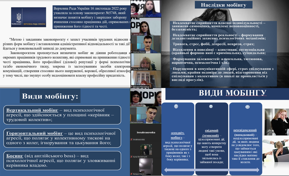 У ході вебінару здійснено ґрунтовний аналіз мобінгу та його видів, форм і способів вияву, проаналізовано причини та наслідки, означено шляхи запобігання і протидії.