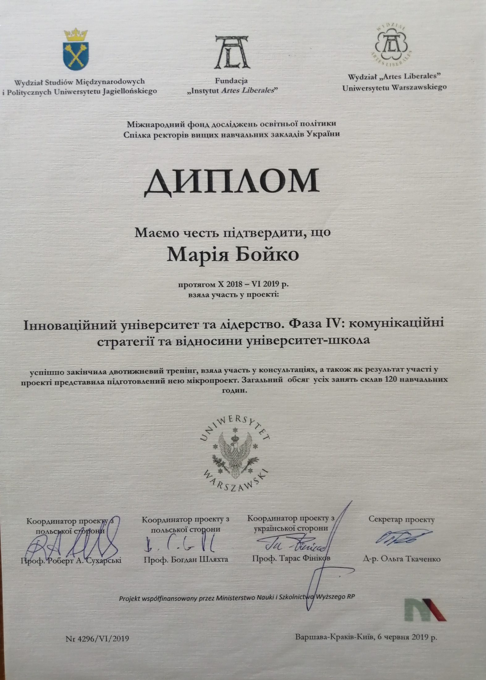 1. Бойко М.М. Якість професійної підготовки майбутнього вчителя як інформаційна детермінанта системи вищої освіти в Україні //Монографія «Edukacjaobywatelskadorosłychaspołeczeństwoobywatelskie» / redakcjanaukowaDorotaGierszewski, henrykA. Kretek. – Racibórz : WydawnictwoPaństwowejWyższejSzkołyZawodowejwRaciborzu, 2015. – S. 264-271.