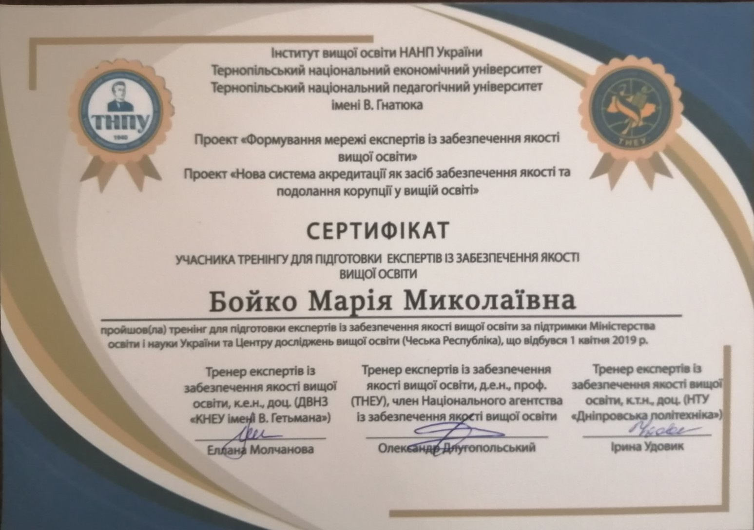 5. Бойко М.М.Система внутрішнього забезпечення якості освіти в педагогічному університеті // Гуманітарний вісник ДНВЗ «Переяслав-Хмельницький» Державний педагогічний університет ім. Г. Сковороди дод.1 до випуску 36, том 2 (62): Тематичний випуск «Вища освіта України у контексті інтеграції до європейського освітнього простору» : К.: Гнозиз. 2015,- С. 46-59
