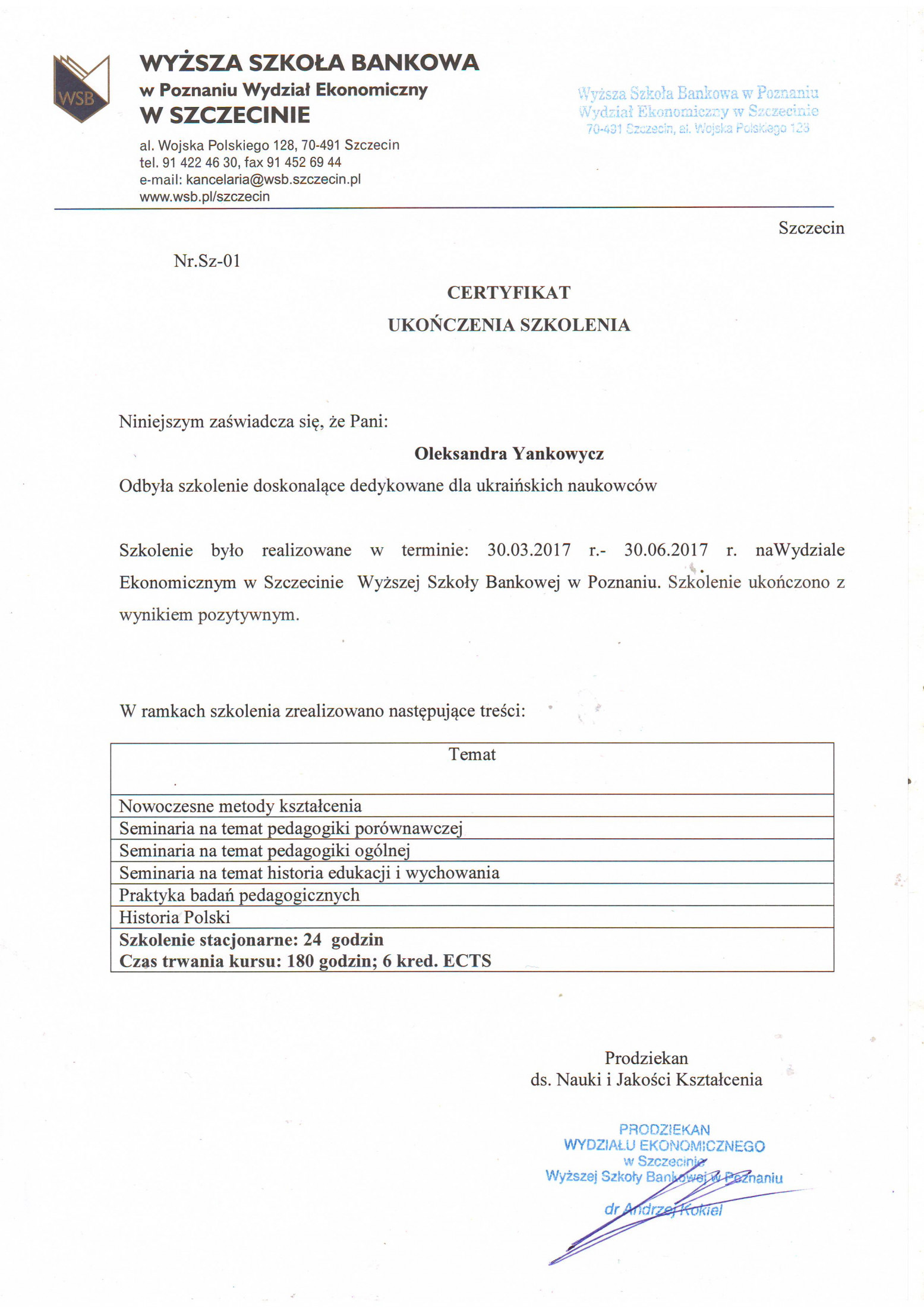 З 2014 р. і до тепер – доктор хабілітований, професор закладу початкової та дошкільної освіти Куявсько-Поморської вищої школи (м. Бидгощ, Польща).