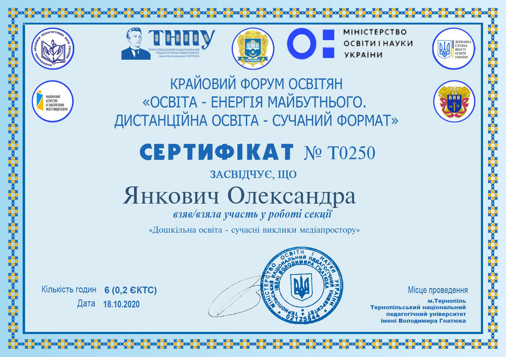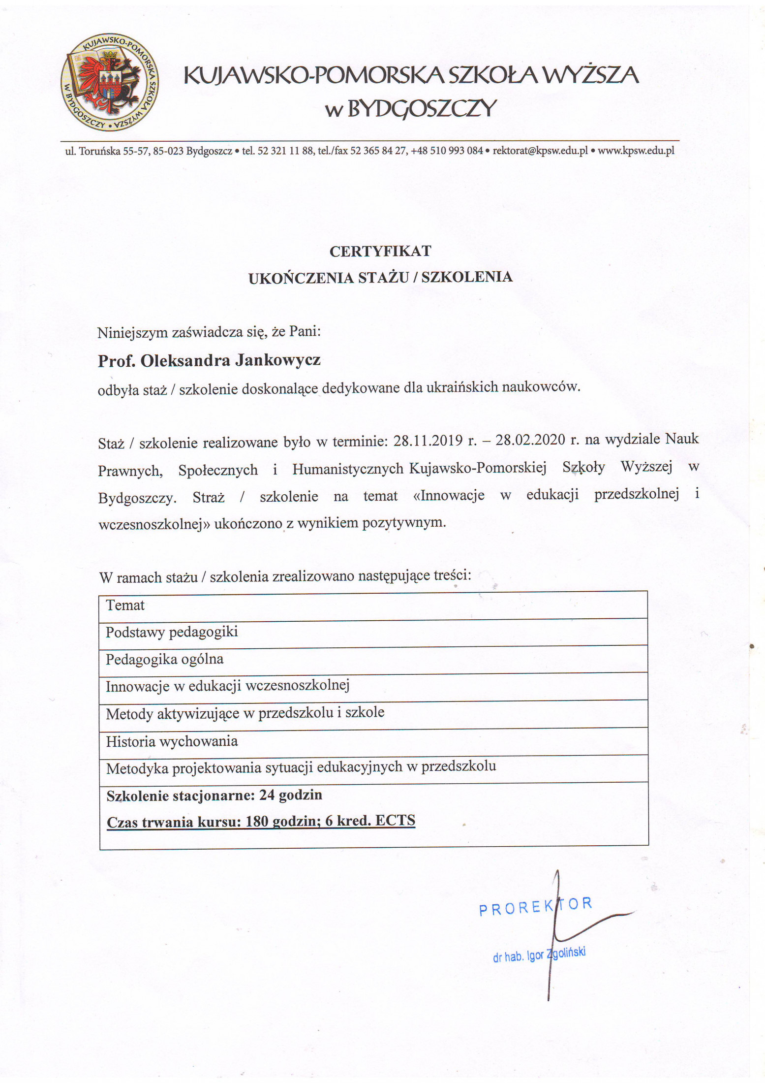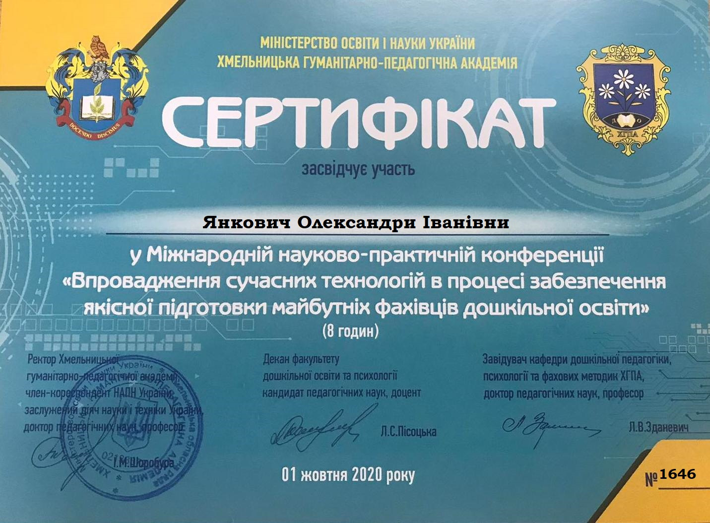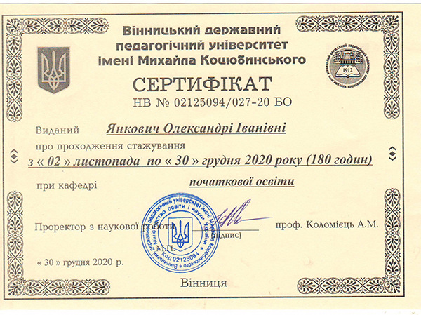 Янкович О. І. Підготовка майбутніх фахівців дошкільної освіти в університетах України та Польщі до реалізації здоров’язбережувальних рухових технологій. Забезпечення якісної підготовки майбутніх фахівців дошкільної освіти в процесі використання сучасних технологій:збірник наукових праць / за заг. редакцією проф. Л. В.Зданевич, доц. Л. С. Пісоцької, Н. М. Миськової. Хмельницький: ХГПА, 2018. С. 333-337.