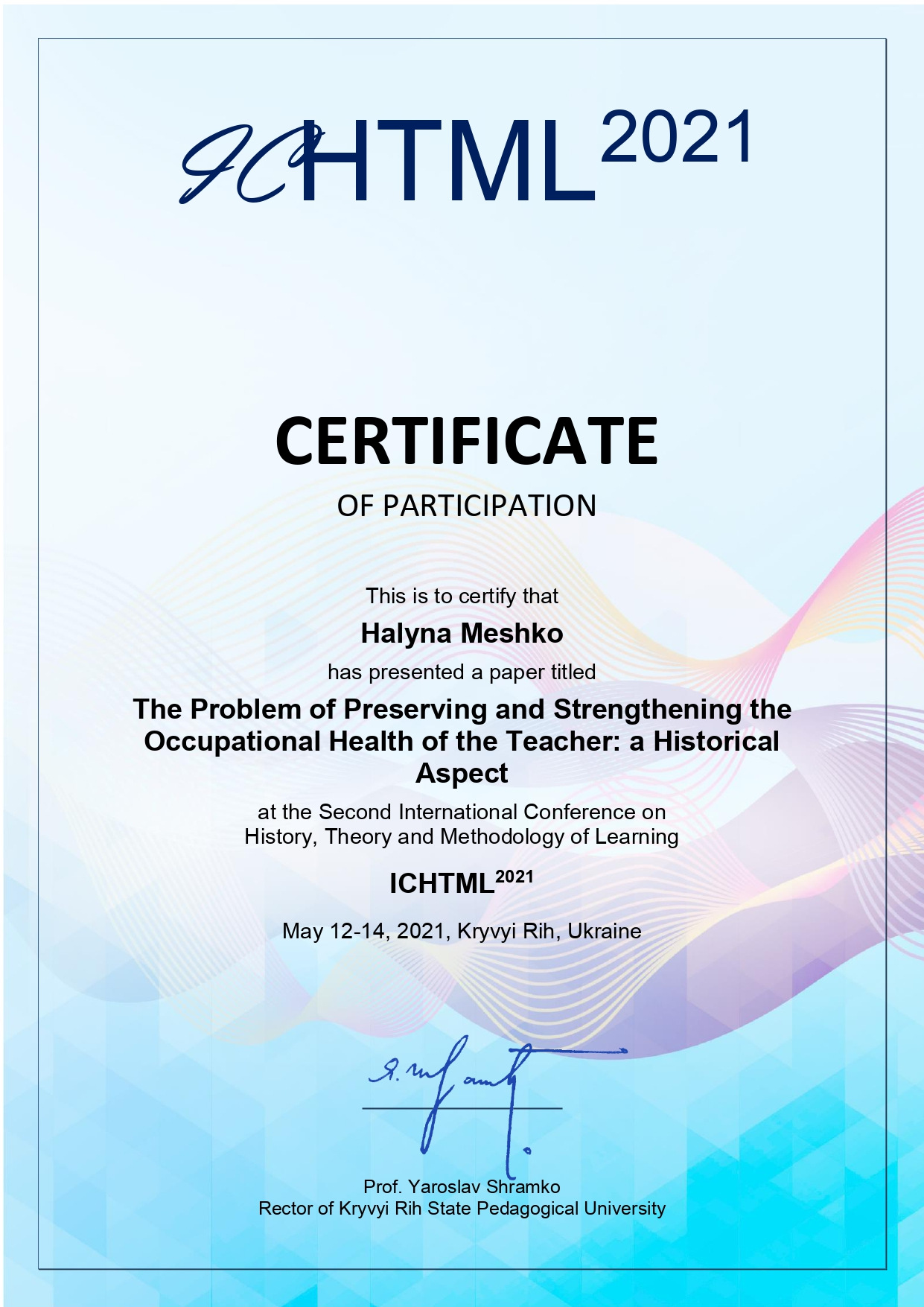 Tereshchuk, G., Meshko, H., Meshko, O., Prochazka, M., & Radchuk, H. The problem of preserving and strengthening the occupational health of the teacher: a historical aspect. SHS Web of Conferences. Volume 104, 01003, 2021. DOI: https://doi.org/10.1051/shsconf/202110401003 Web of Science