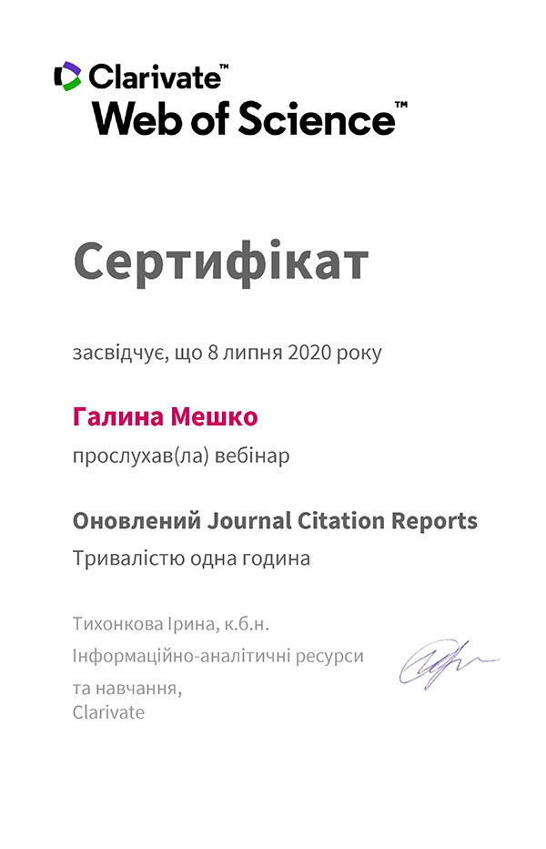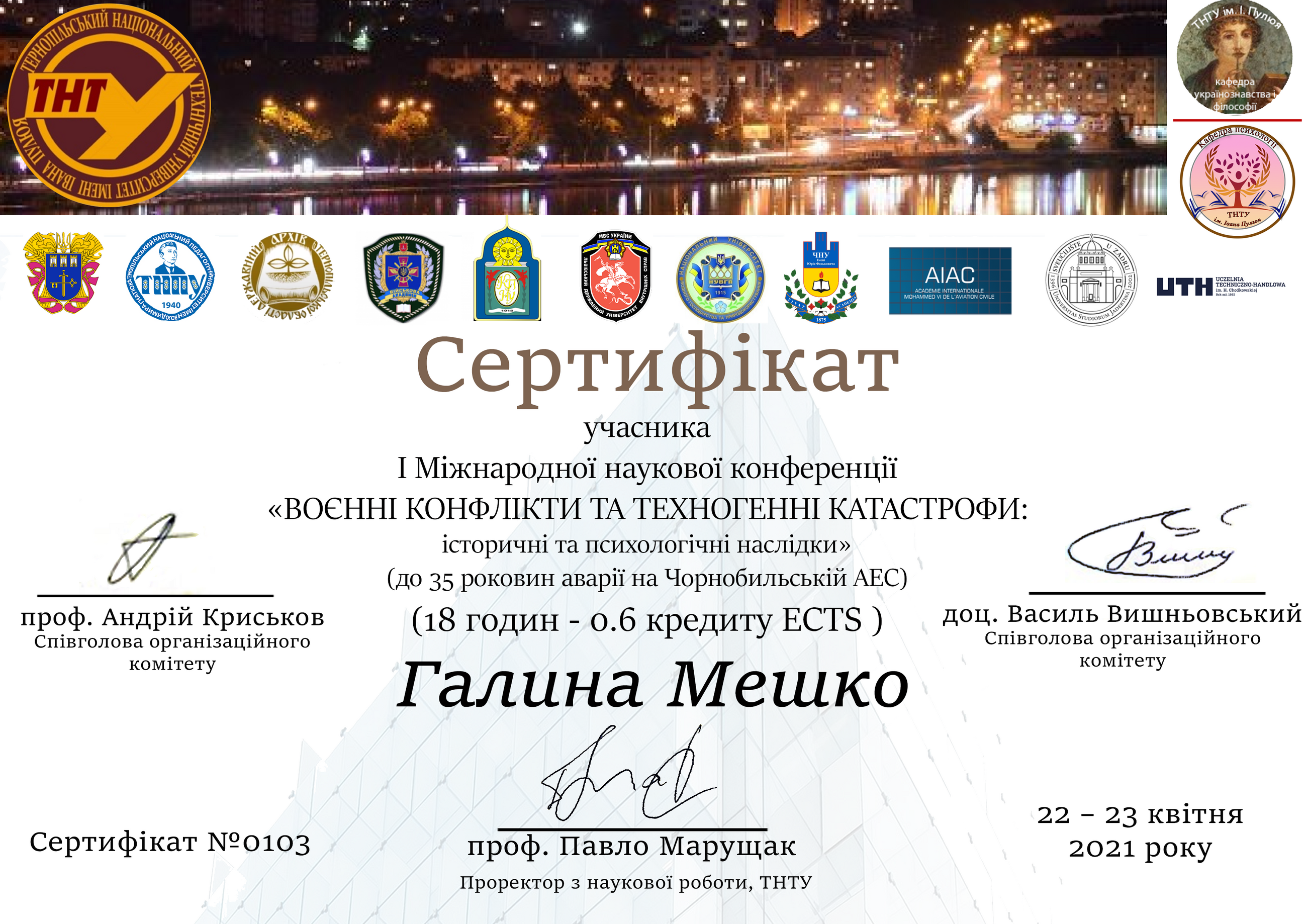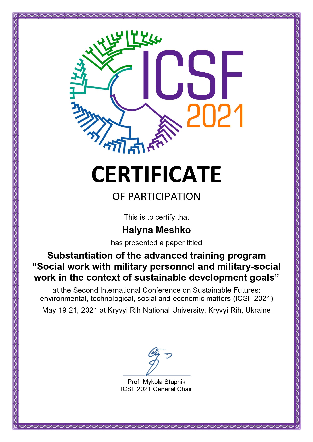 Meshko H.. V. Habrusieva N., A. Kryskov A. Research of professional responsibility of students of technical specialities by means of information and communication technologies Journal of Physics: Conference Series Vol. 1840, Issue 1. URL. : https://www.scopus.com/record/display.uri?eid=2-s2.0-85103501852&origin=resultslist Scopus