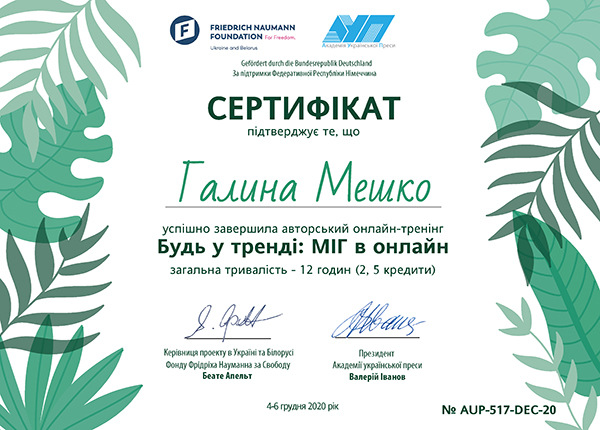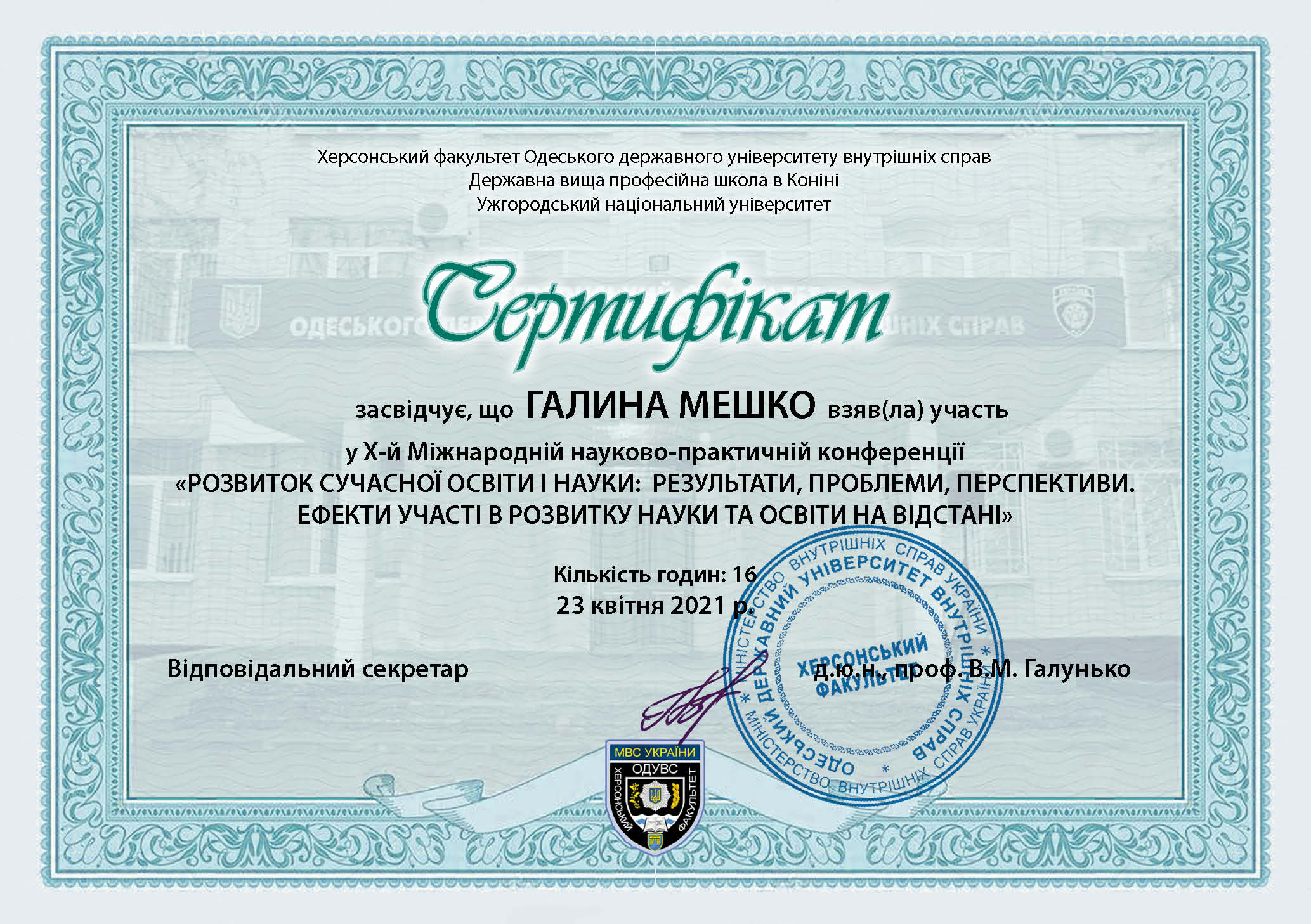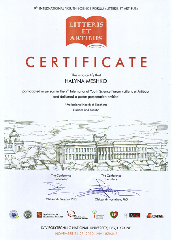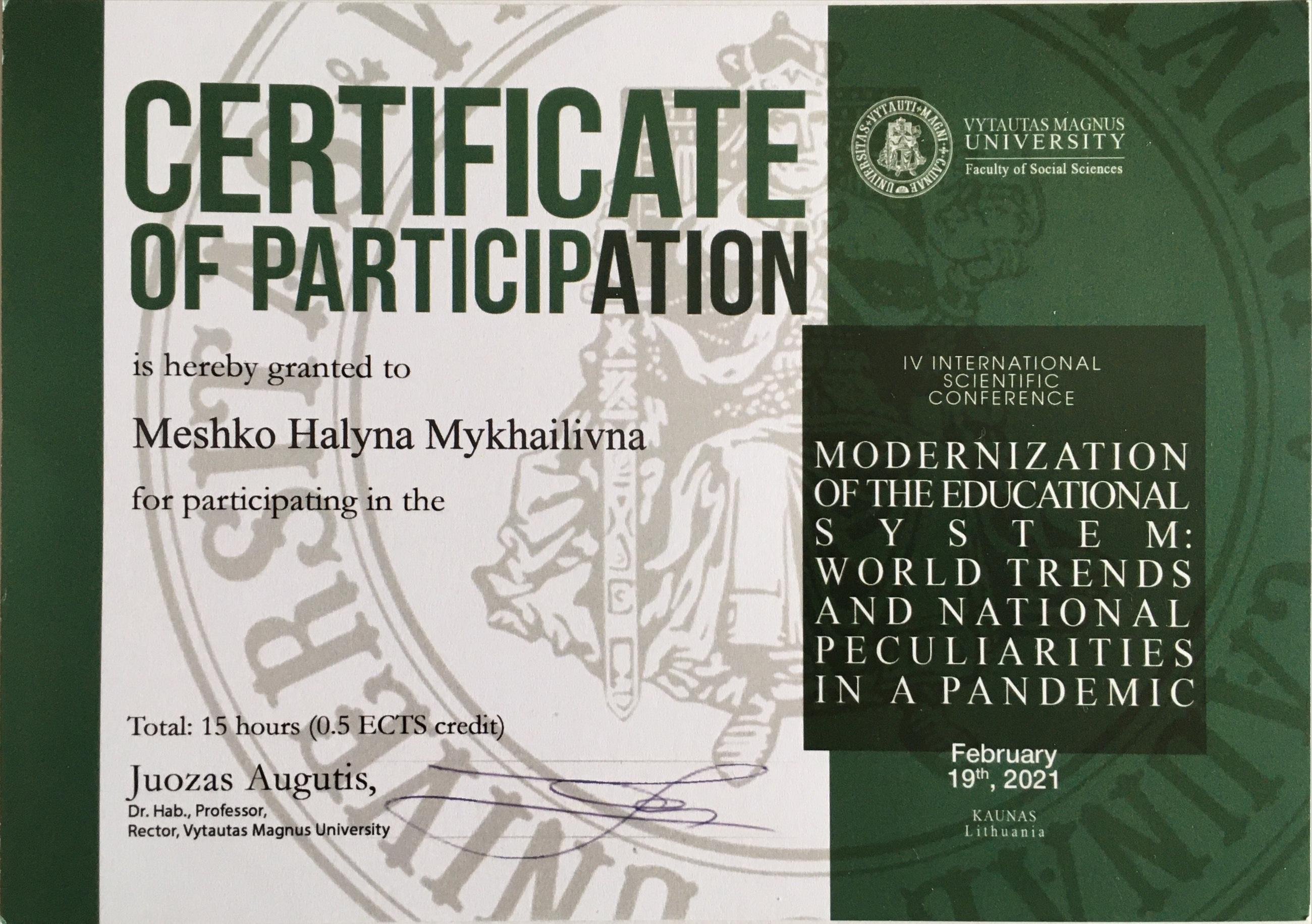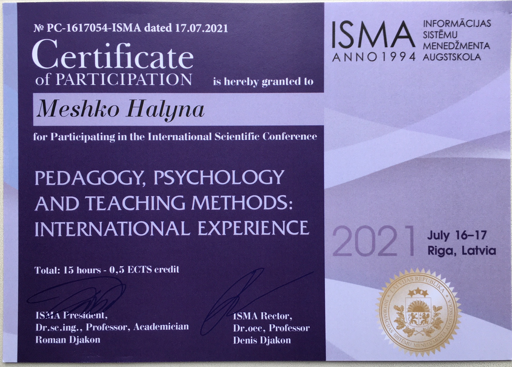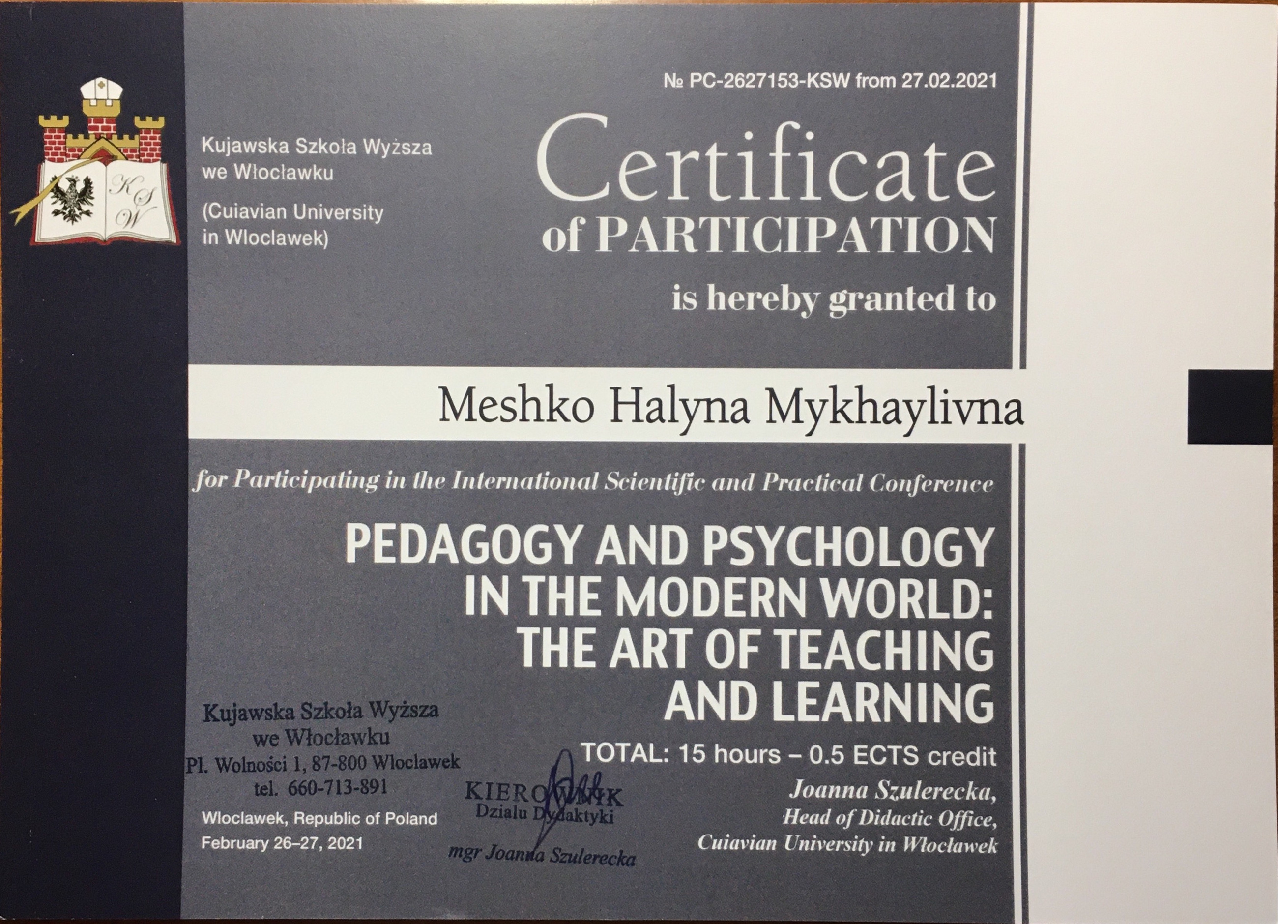 Міжнародне підвищення кваліфікації в Куявській Вищій Школі (Влоцлавек, Польща), тема: «Pedagogy and Psychology in the Modern World: the Art of Teaching and Learning», сертифікат, 2021 р.