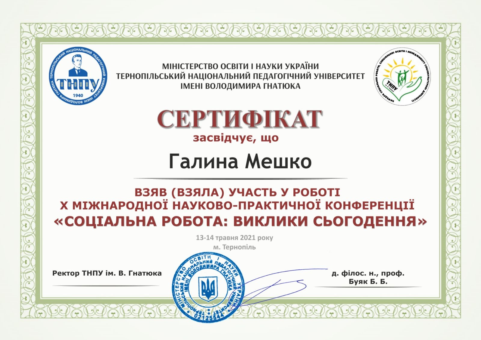 Мешко Г.М. – керівник науково-дослідної роботи «Теоретичні та методичні засади підготовки педагогічних та наукових кадрів до інноваційної діяльності в закладах освіти» (державний реєстраційний номер 0120U101844). Виконавець завдань перспективного плану розвитку наукового напряму «Суспільні науки» Тернопільського національного педагогічного університету імені Володимира Гнатюка. Вона є організатором та співорганізатором міжнародних, всеукраїнських, регіональних науково-практичних конференцій. Учасник проєкту Інституту розвитку освіти «Новій українській школі – новий учитель» (за підтримки фонду «Відродження», Представництва «Фонду Фрідріха Науманна за Свободу» в Україні) (2019-2021).