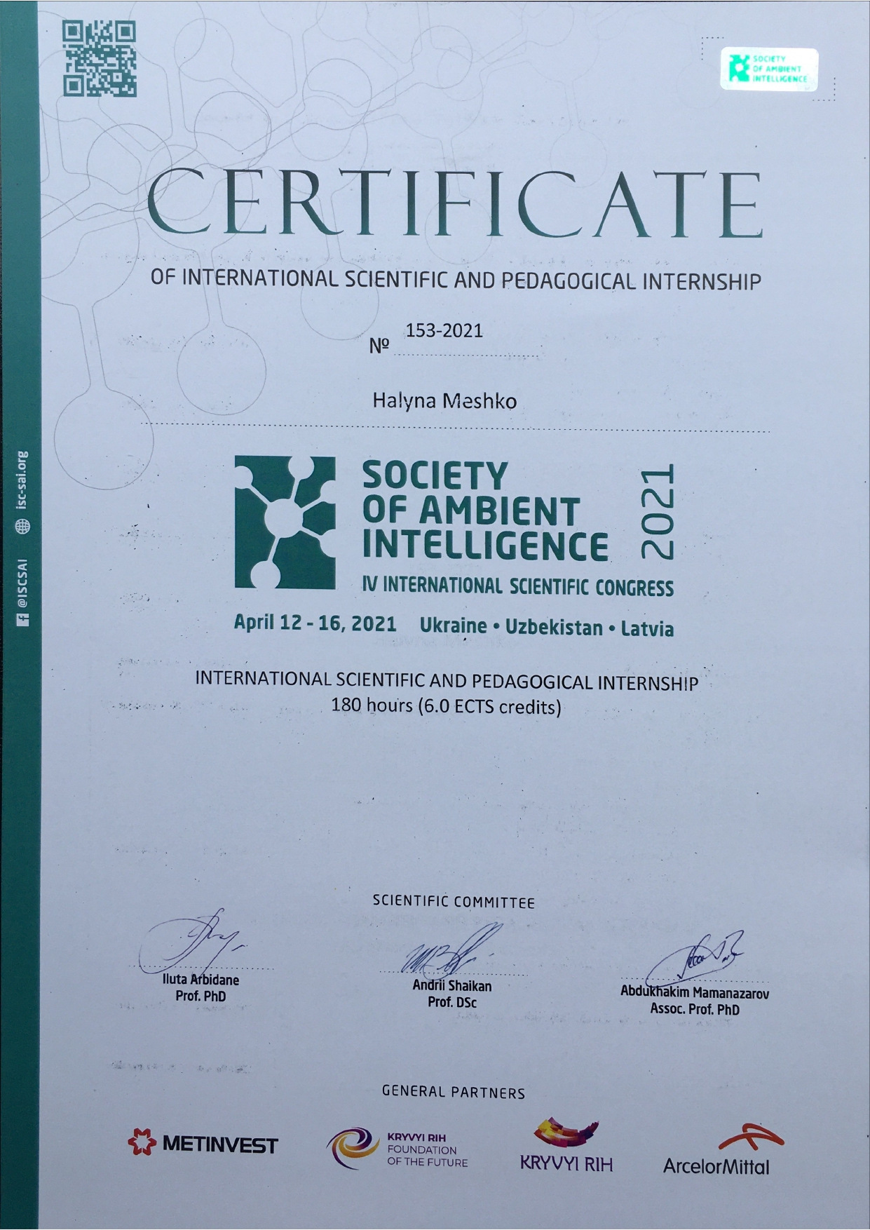Міжнародне науково-педагогічне стажування (Україна-Узбекистан-Латвія), тема стажування: «Society of Ambient Intelligence – 2021», сертифікат, 2021 р.
