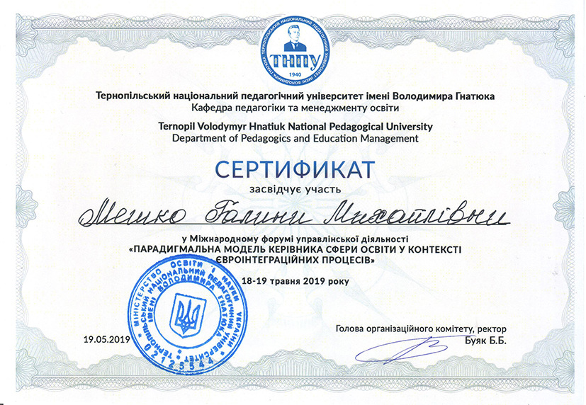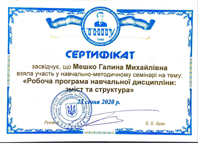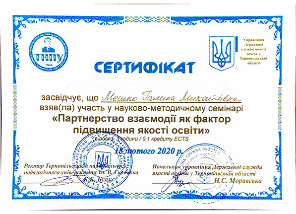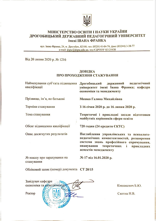 стажування в Дрогобицькому державному педагогічному університеті імені Івана Франка на кафедрі економіки та менеджменту, тема стажування: «Теоретичні і прикладні засади підготовки майбутніх керівників сфери освіти», 2020 р.