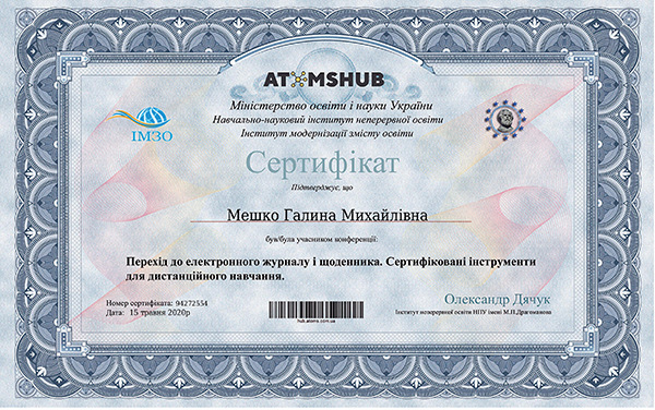Trubavina I., Dotsenko S., Naboka O., Chaikovskyi M., Meshko H. Developing digital competence of teachers of Humanitarian disciplines in the conditions of COVID-19 quarantine measures. Journal of Physics: Conference Series : Vol. 1840, Issue 1. URL. : https://www.scopus.com/record/display.uri?eid=2-s2.0-85103480694&origin=resultslist Scopus