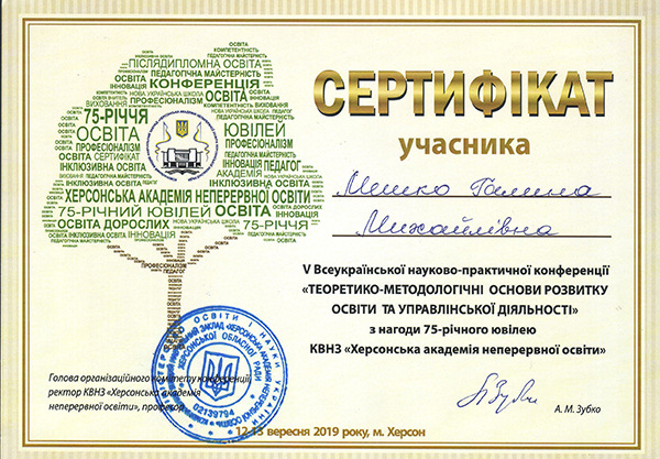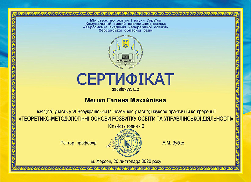 Мешко Г.М Мешко О.І. Управління процесом формування соціально-психологічного клімату в педагогічному колективі загальноосвітнього навчального закладу. Педагогічний альманах :збірник наукових праць / редкол. В.В. Кузьменко (голова) та ін. Херсон : КВНЗ «Херсонська академія неперервної освіти», 2017. Випуск 33. С. 237–243.
