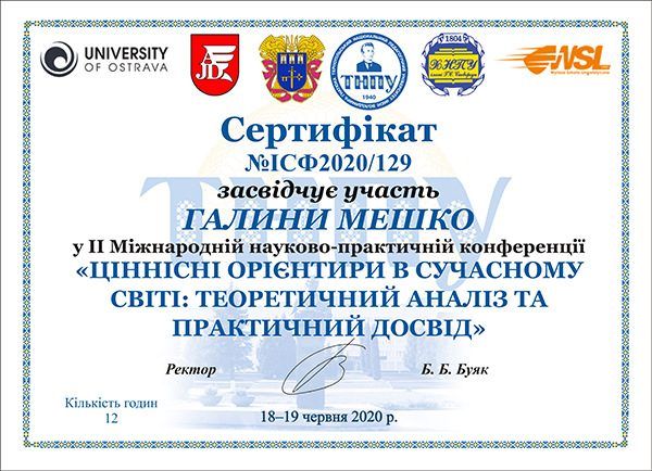 INTERNATIONAL SCIENTIFIC AND PEDAGOGICAL INTERNSHIP (Ukraine • Uzbekistan • Latvia • Portugal • India), тема стажування: «International scientific-research and educational activity as an integral part of functioning of new generation universities», сертифікат, 2022 р.