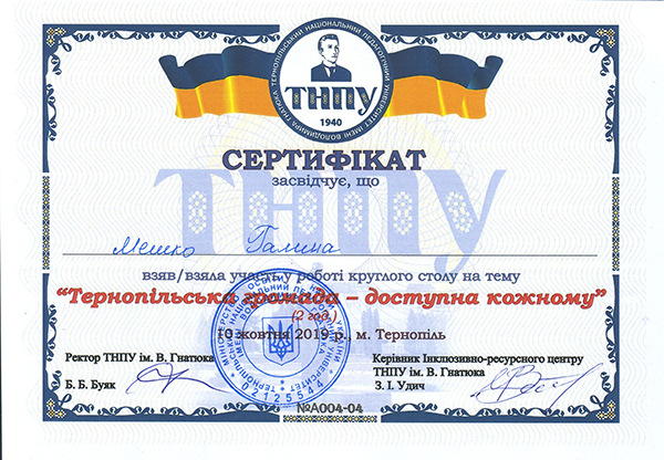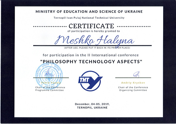 Міжнародне підвищення кваліфікації в Інституті Науково-дослідиому Люблінського науково-технологічного парку (Польща), тема стажування: «Distance Tools on the Example of Zoom and Moodle Platform», сертифікат, 2021р.
