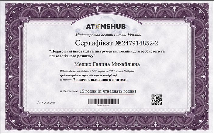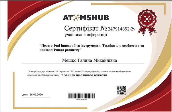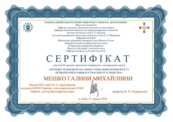 Halyna Meshko, Oleksandr Meshko, Halyna Meshko, Myroslava Chorniy. Technology of formation of psychologically safe educational environment in institution of general secondary education // Modern Technologies in the Education System. Series of monographs Faculty of Architecture, Civil Engineering and Applied Arts Katowice School of Technology. Monograph 26. Katowice: Wydawnictwo Wyzszej Szkoly Technicznej w Katowicach, 2019. P. 113-121. http://dspace.tnpu.edu.ua/handle/123456789/13318