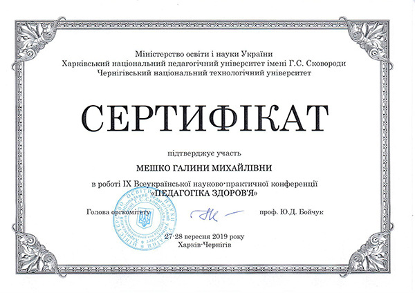 Meshko H., Meshko O. Scientific-methodological Foundations of Future Teachers’ Health Culture Forming. Theory and Practice of Future Teacher’s Training for Work in New Ukrainian School: monograph / Edit. I.F. Prokopenko, I.M. Trubavina. Prague: OKTAN PRINT s.r.o., 2020. P. 112-125. DOI: https://doi.org/10.46489/TAPOFT-1