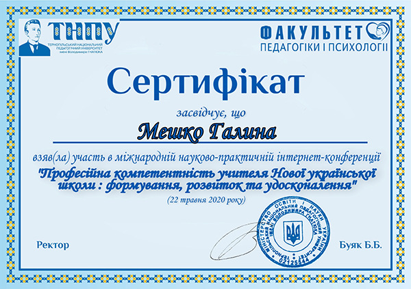 Мешко Г.М. Мешко О.І. Формування психічного здоров’я учнів у сучасній школі. Науковий вісник Ужгородського університету. Серія: «Педагогіка. Соціальна робота»: зб. наук. пр. / ред. кол.: Козубовська І.В. (гол.ред.) та ін. Ужгород : Вид-во УжНУ «Говерла», 2018. Випуск 2 (43). С. 177–181.