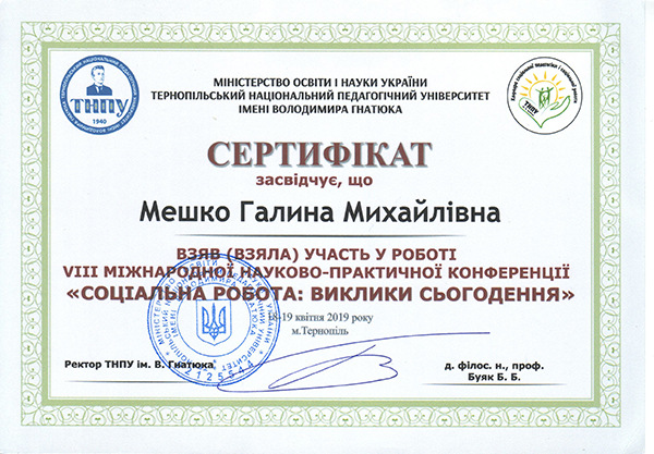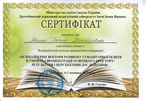 Мешко Г.М., Мешко О.І. Формування психотерапевтичної позиції майбутнього вчителя як основи реалізації валеологічних технологій педагогічної взаємодії. Науковий вісник Ужгородського університету : збірник наукових праць. Серія «Педагогіка. Соціальна робота» / гол. ред. І.В. Козубовська. Ужгород, 2015. Випуск 37. С. 113–116.
