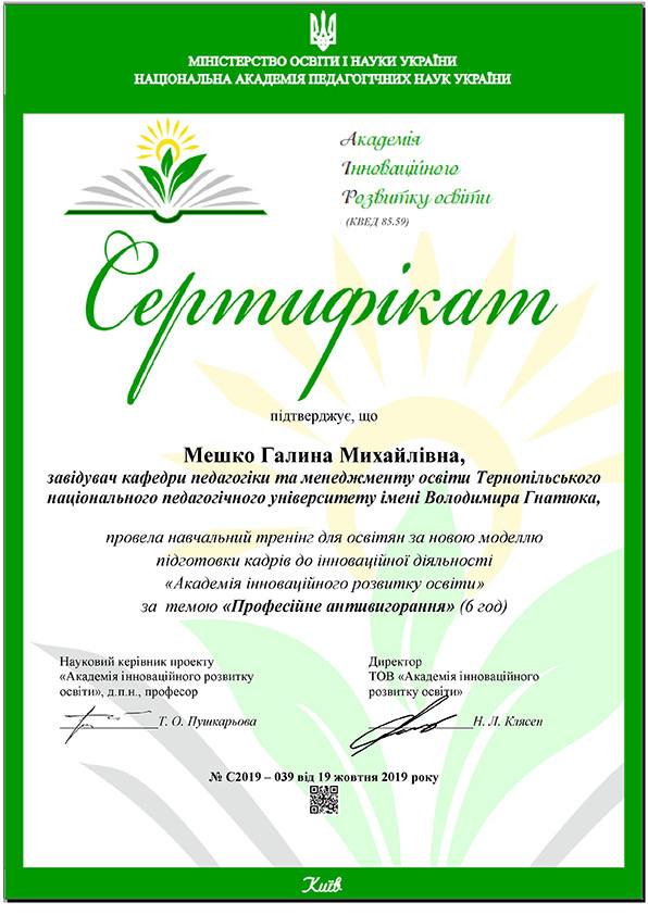 Мешко Г.М. Антистресові саногенні психотехнології в підготовці майбутніх учителів до збереження і зміцнення професійного здоров’я // Сучасні здоров’язбережувальні технології : монографія / за заг. ред. проф. Ю.Д. Бойчука. Харків : Оригінал, 2018. С. 466-474.