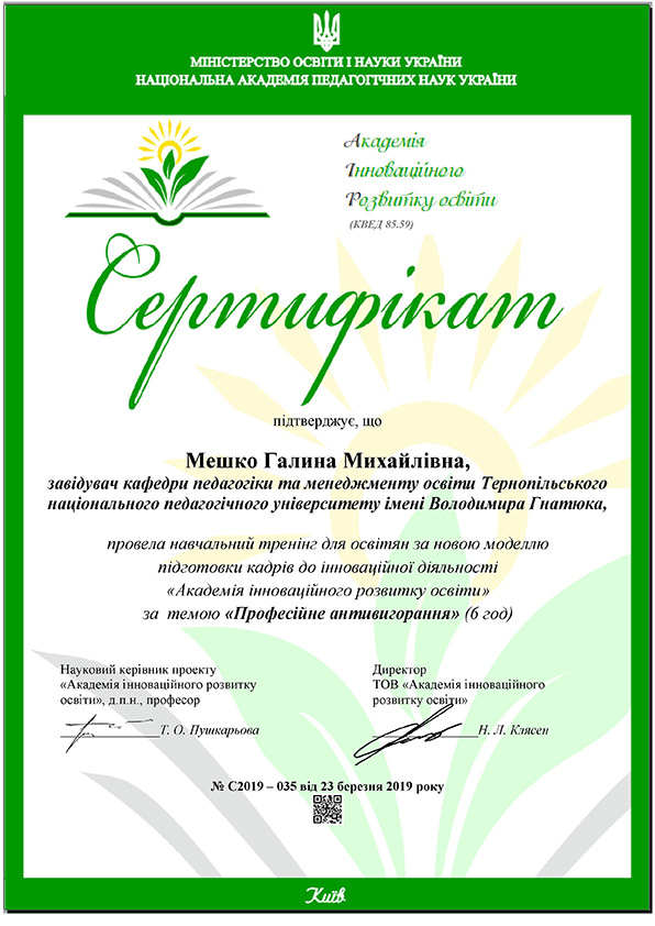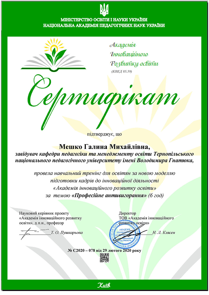 Meshko H., Meshko O., Drobyk N., Mikheienko O. Psycho-pedagogical training as a mean of forming the occupational stress resistance of future teachers. E3S Web of Conferences. Volume 166 (2020). https://www.scopus.com/record/display.uri?eid=2-s2.0-85084954153&origin=resultslist&sort=plf-f Scopus
