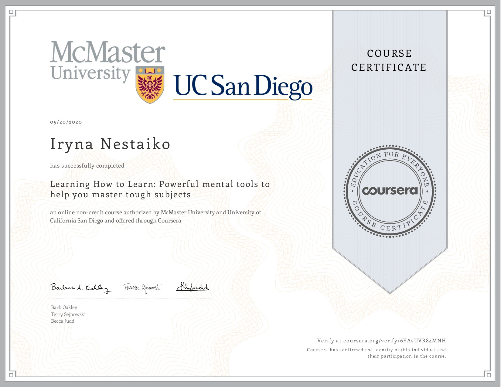- Coursera «Learning How to Learn: Powerful mental tools to help you master tough subjects». (7.05-20.05.2020)