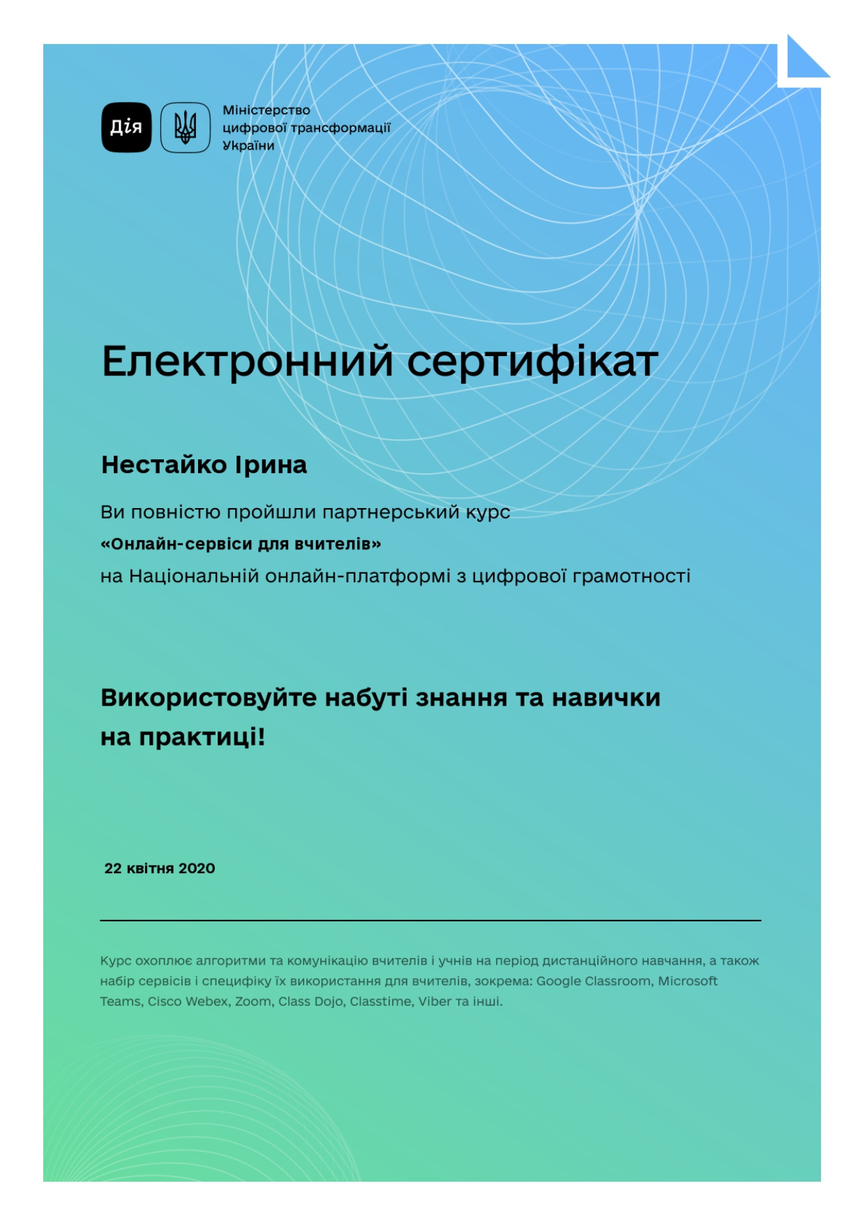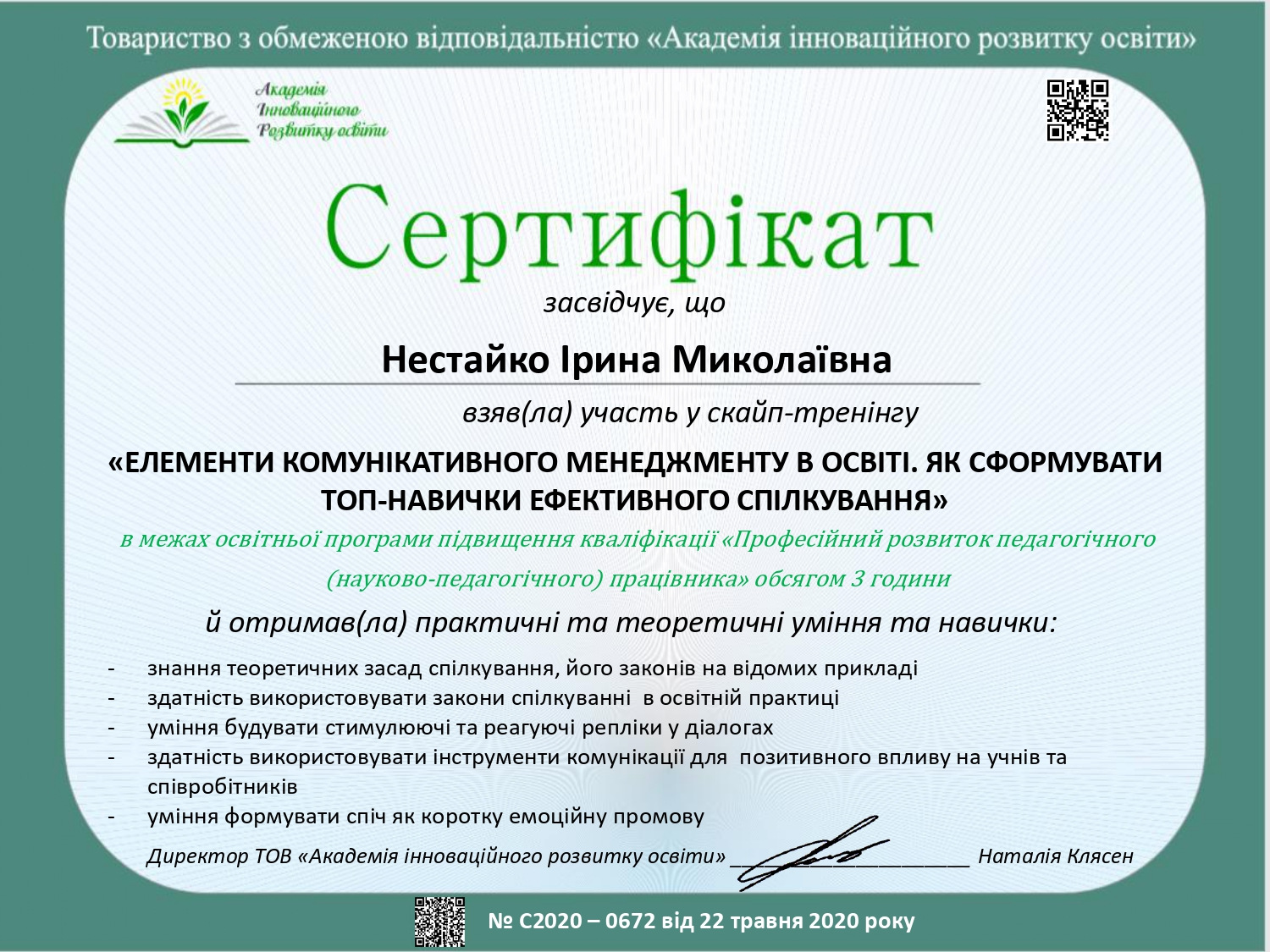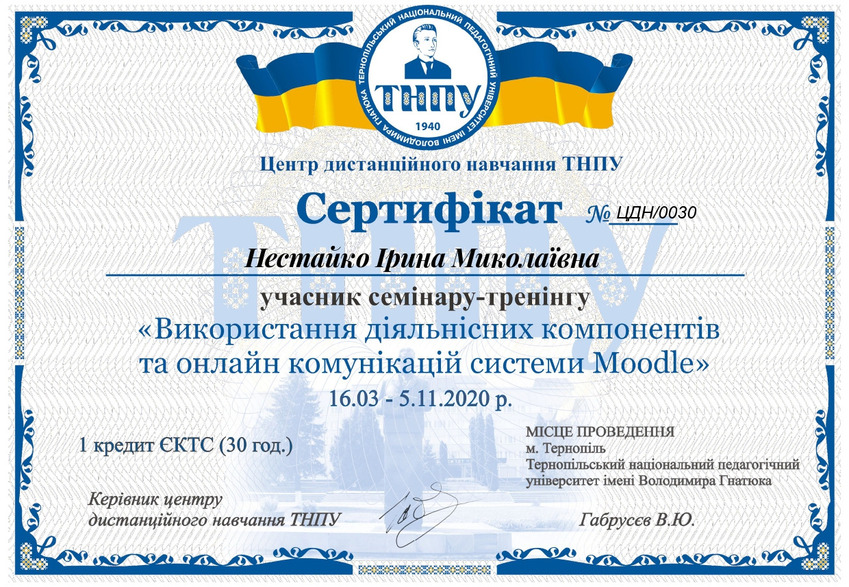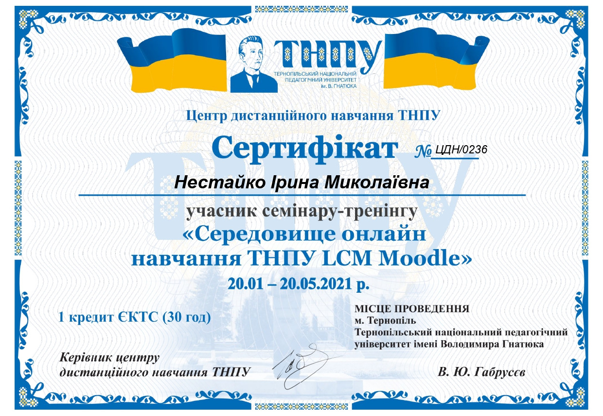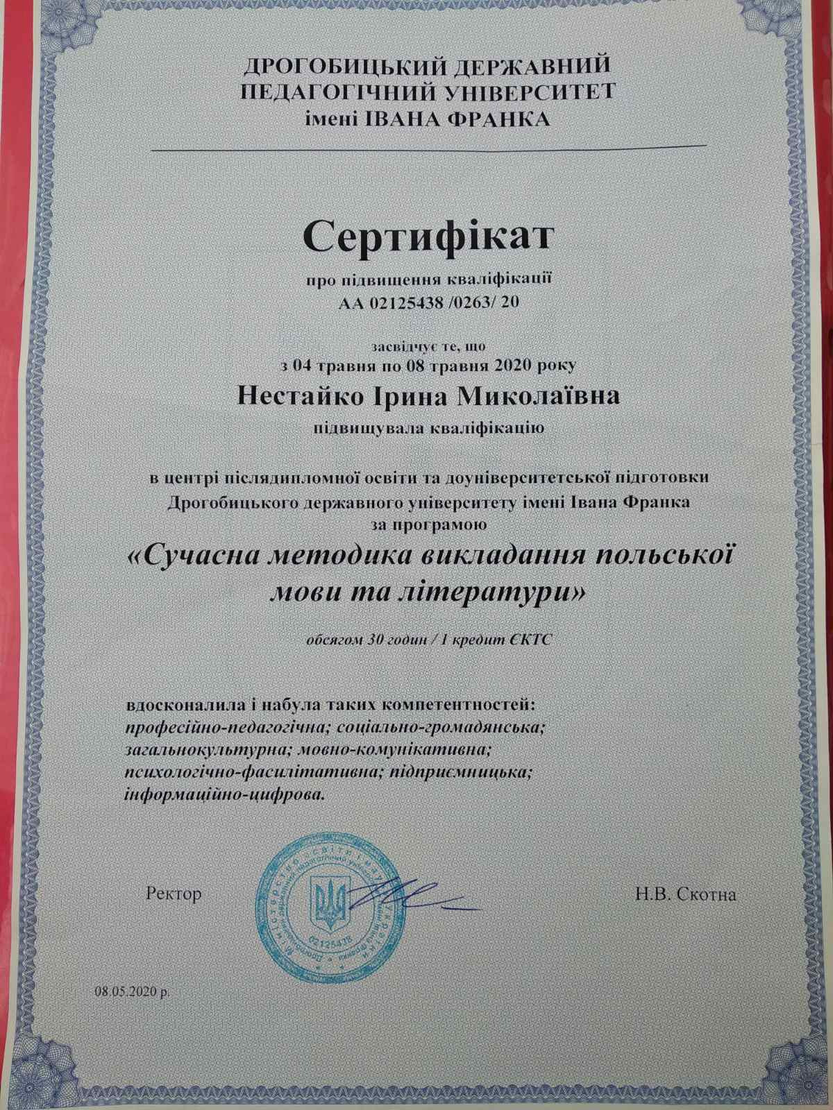- Нестайко І.М. Kompetencje nauczyciela współczesnej szkoły. Матеріали міжнародної науково-практичної інтернет-конференції «Професійна компетентність учителя Нової української школи: формування, розвиток та удосконалення». Тернопіль: ТНПУ. 2020. 162с.