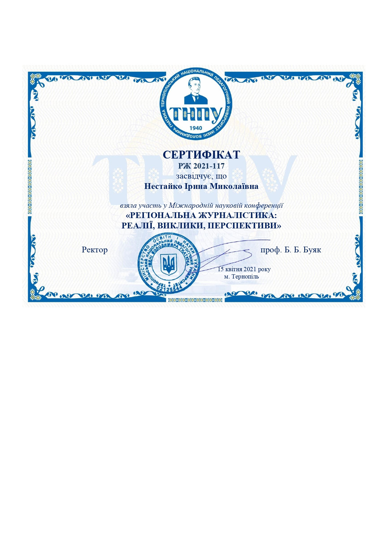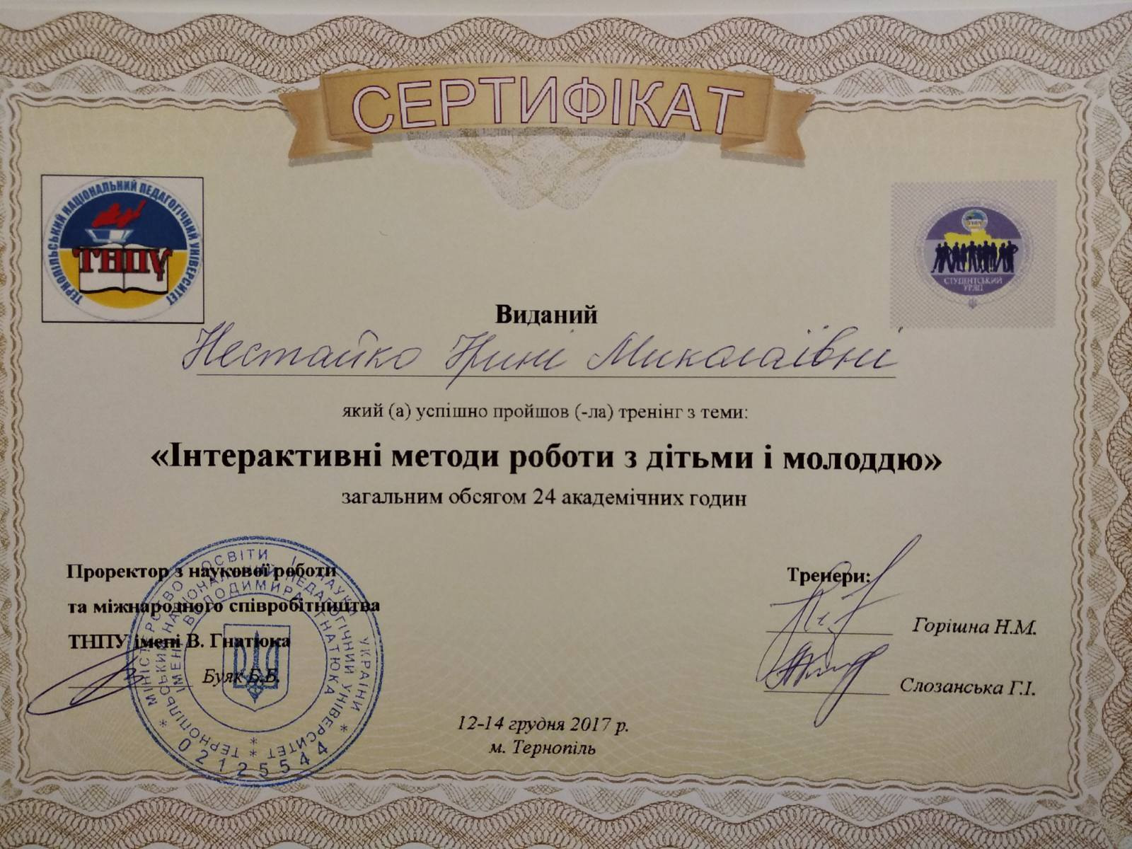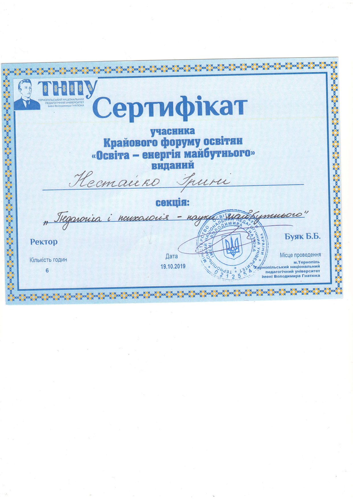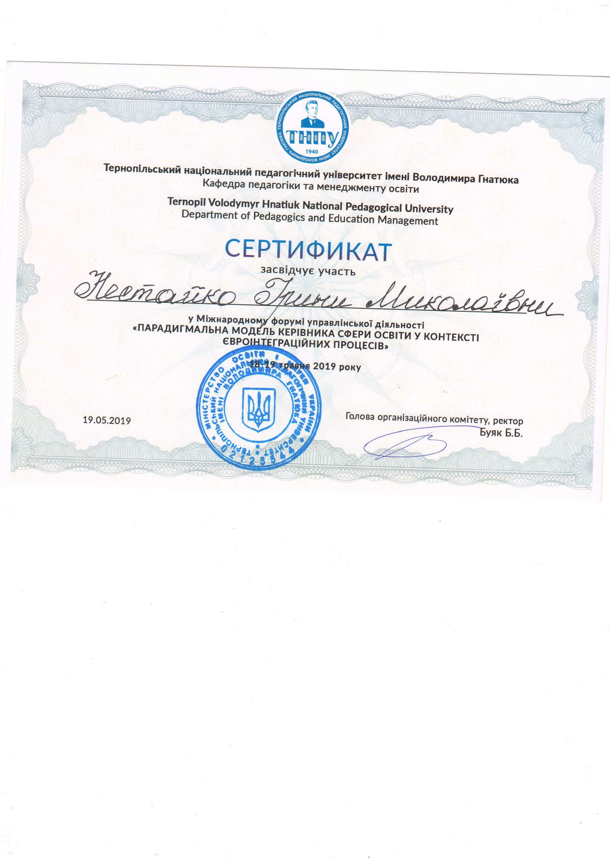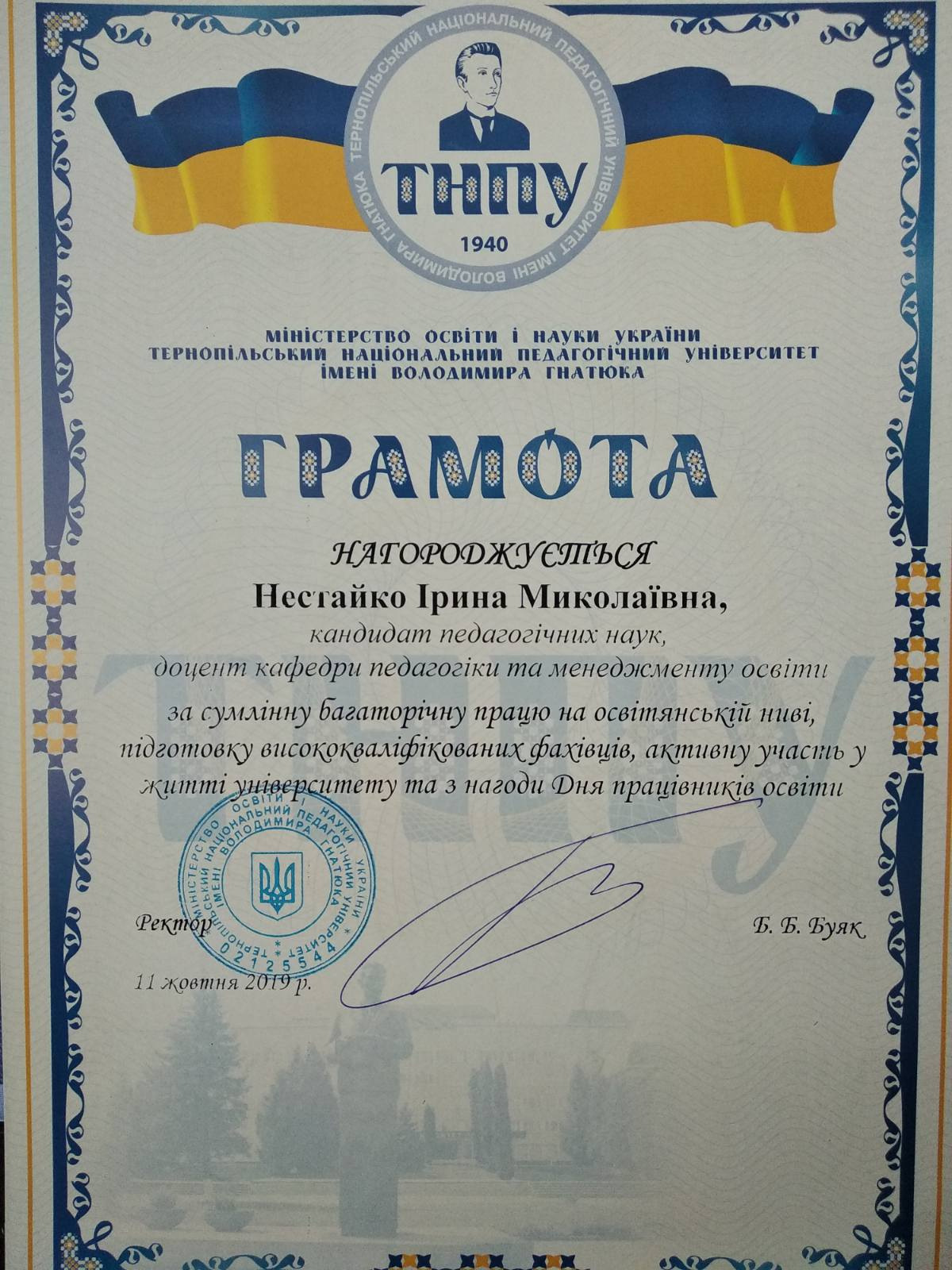 2019р. – Грамота ТНПУ
