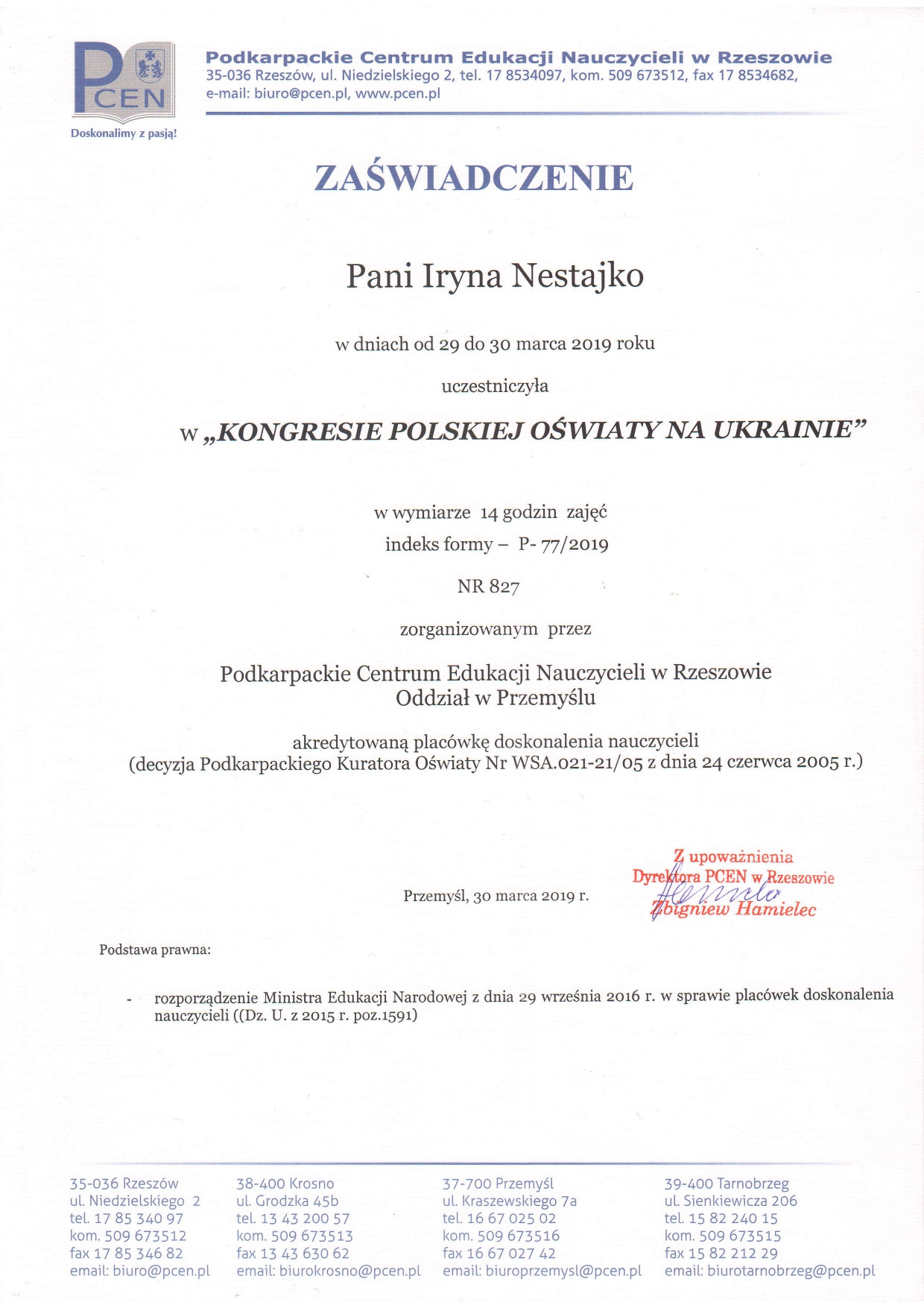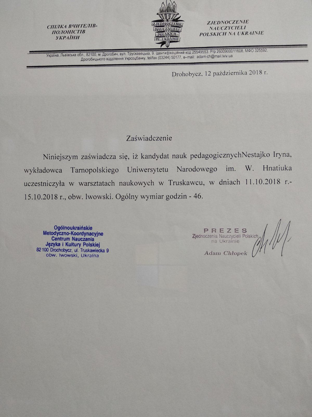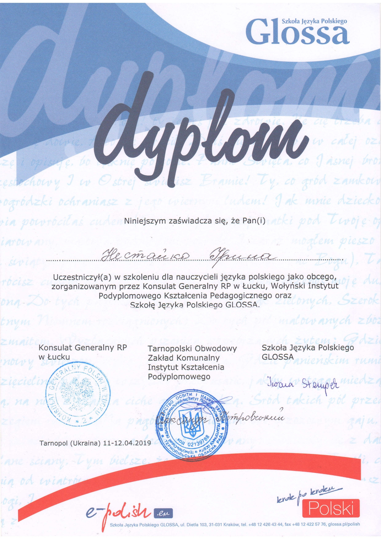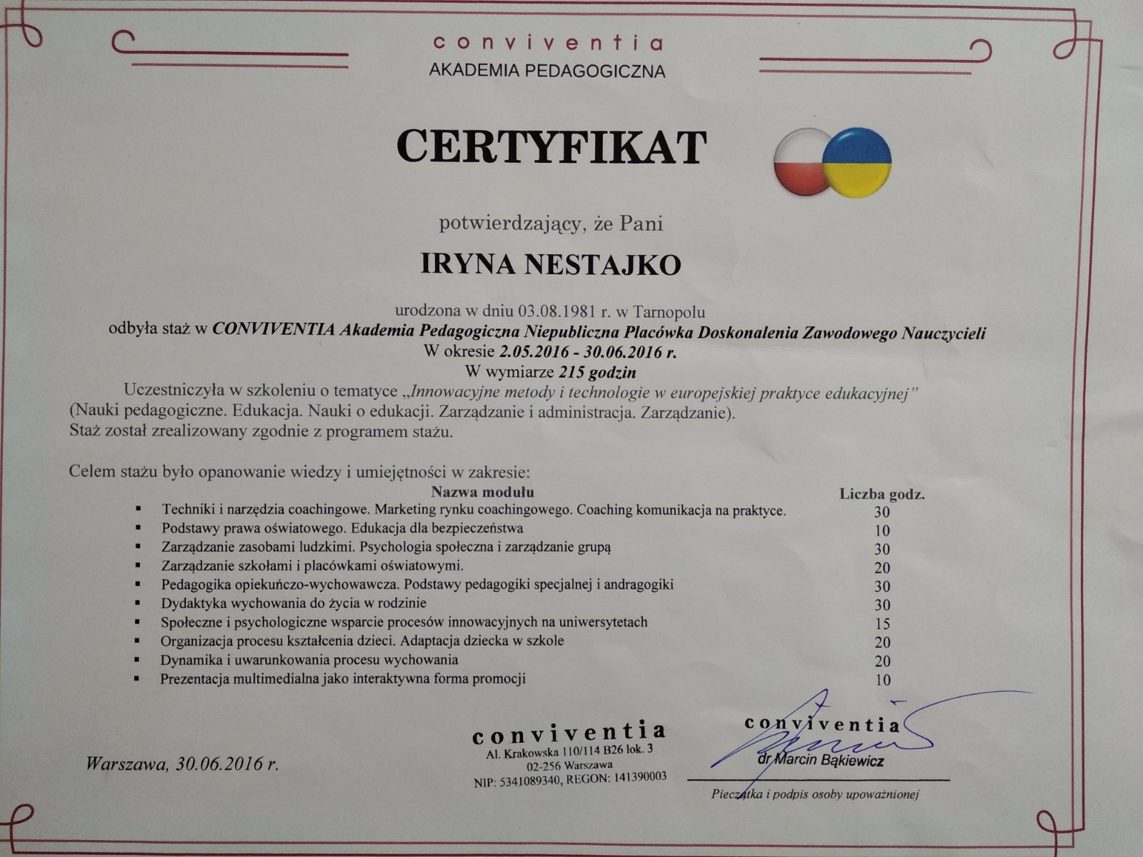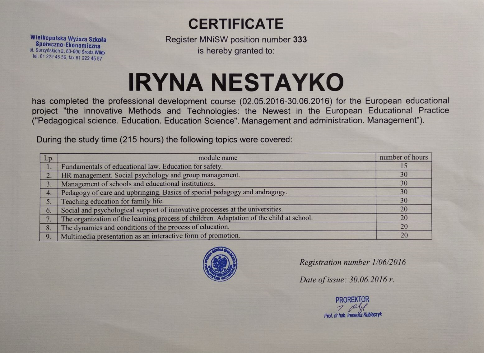 - Wielkopolska Wyższa Szkoła Społeczno-Ekonomiczna (m. ŚrodaWielkopolska, ul.Surzyńskich (Великопольська Вища Школа Суспільно-економічна (м. Сьрода Великопольська) (02.05.2016р.- 30.06.2016р.).