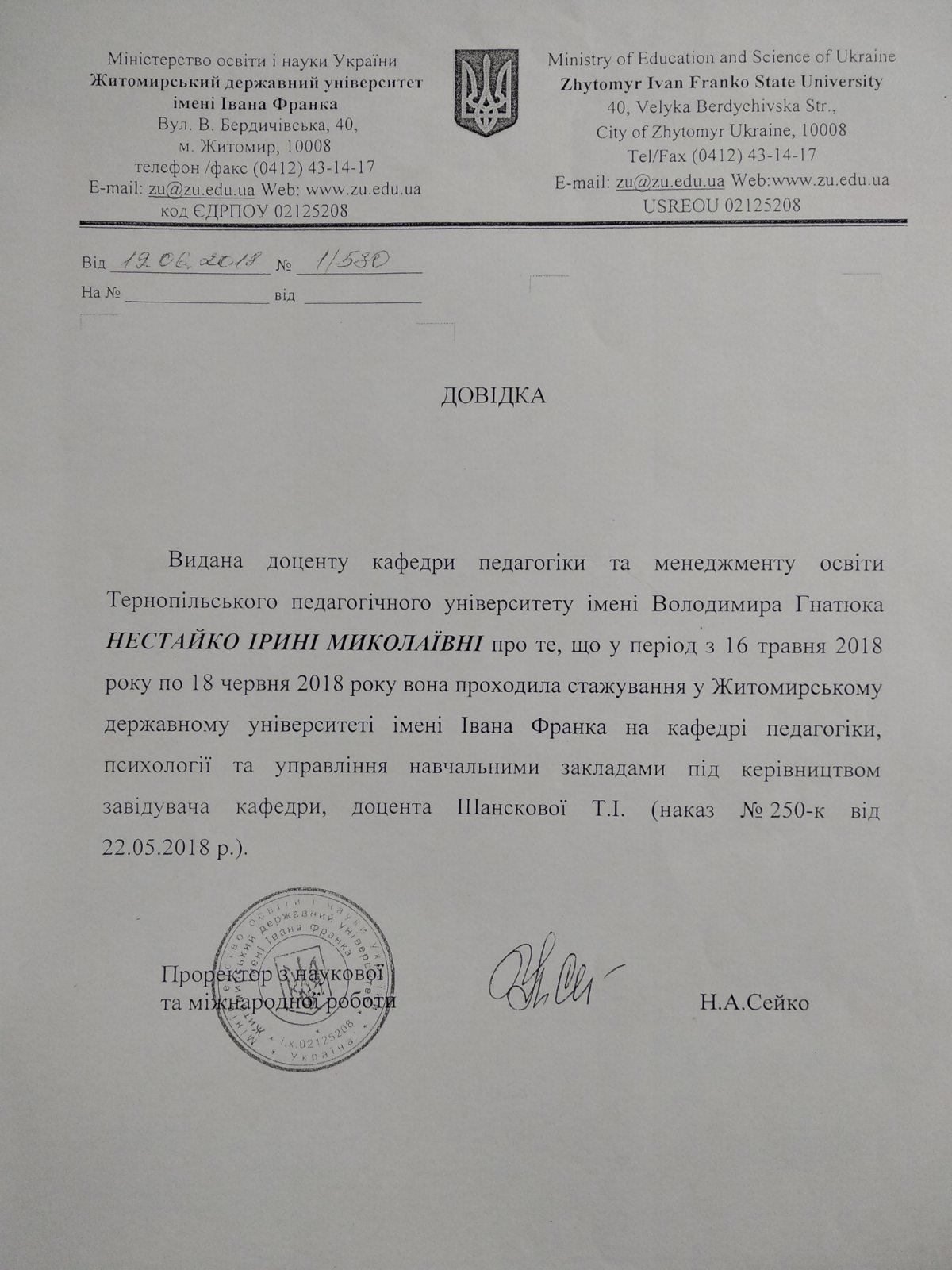 - Житомирський державний університет імені Івана Франка, кафедра педагогіки, психології та управління навчальними закладами (16.05.2018р.- 18.06.2018р.)