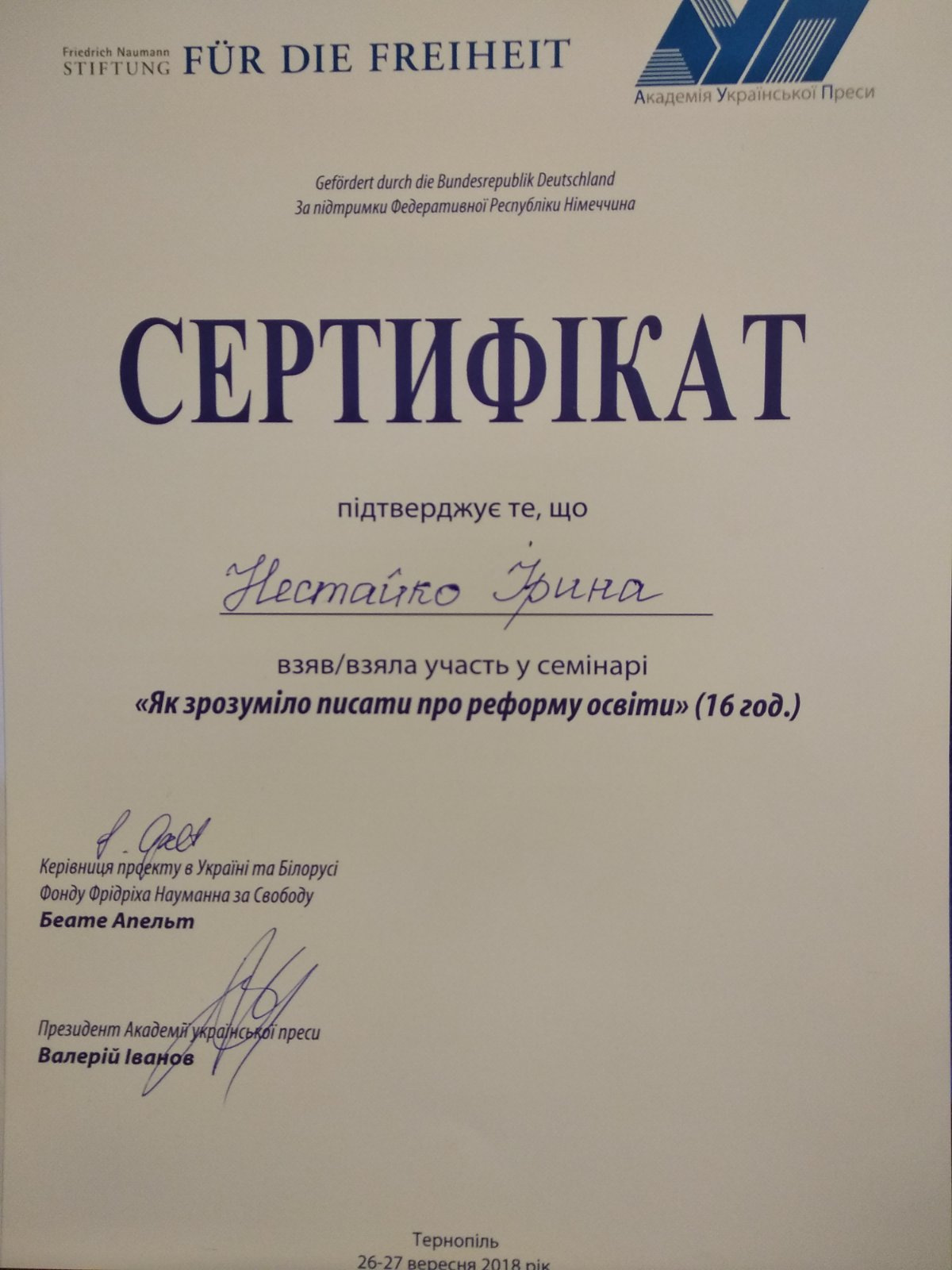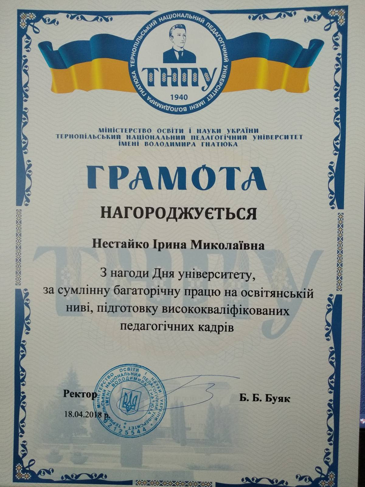 2018р. – Грамота ТНПУ