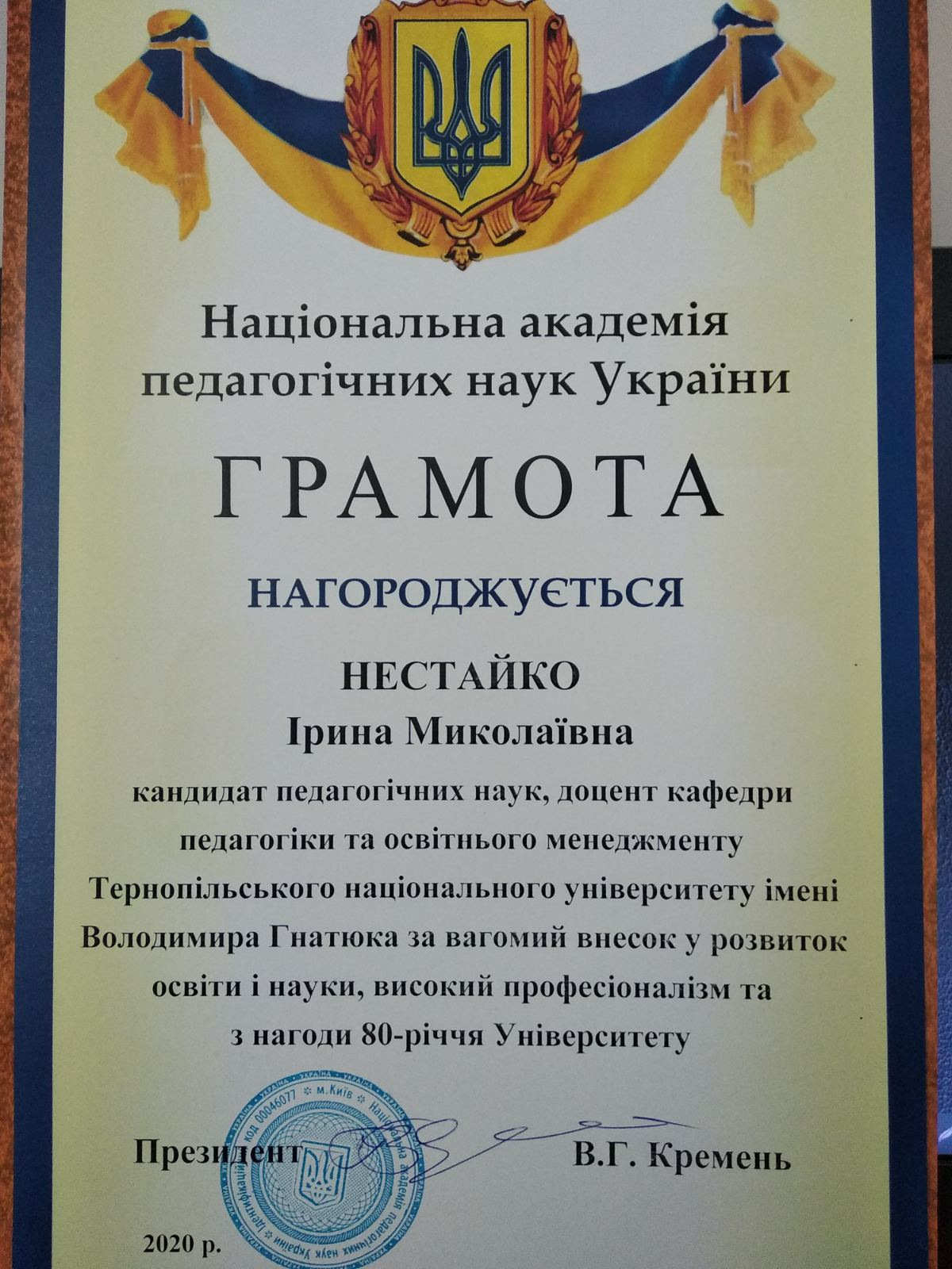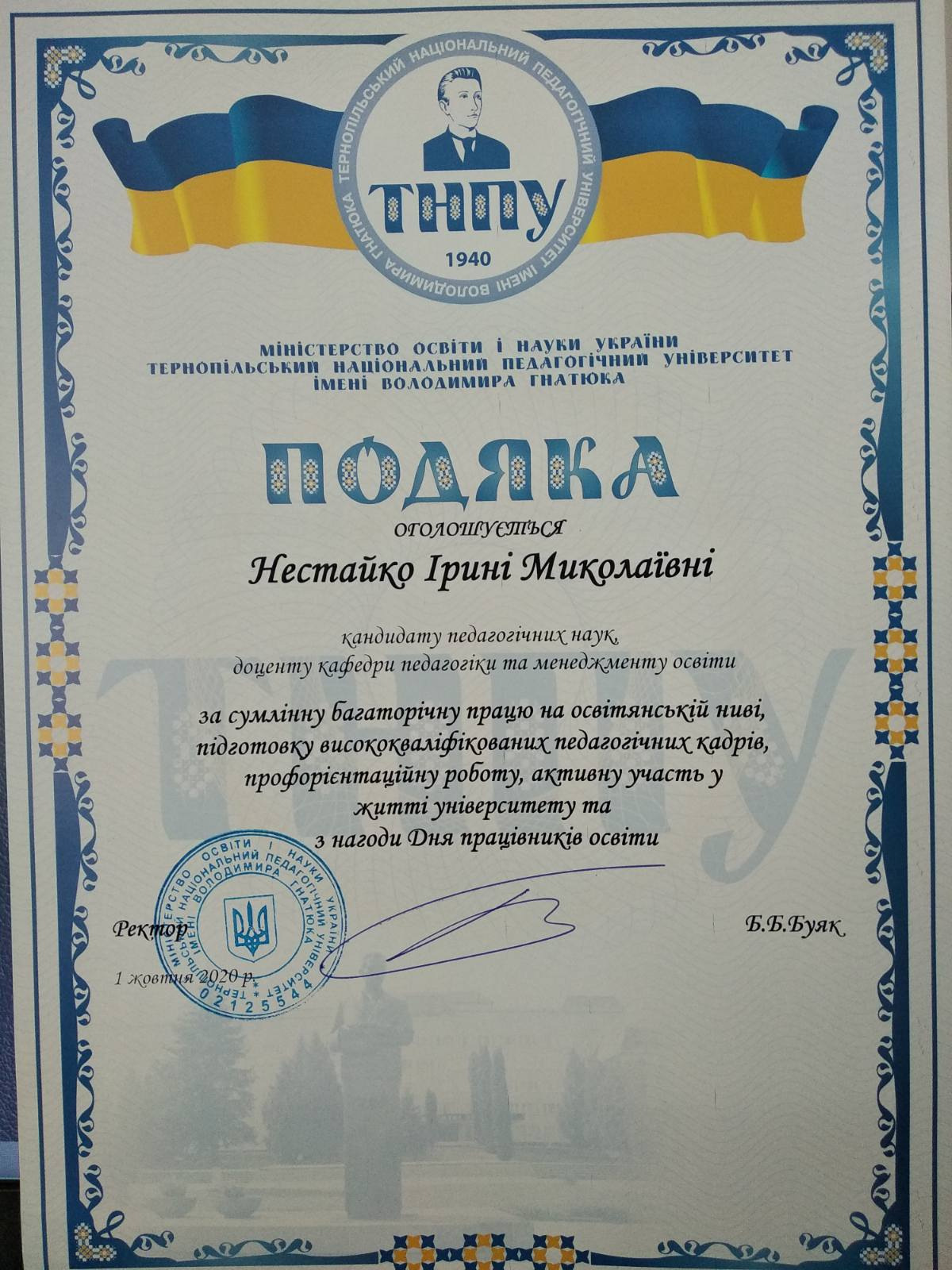 2020 р. – Подяка ТНПУ