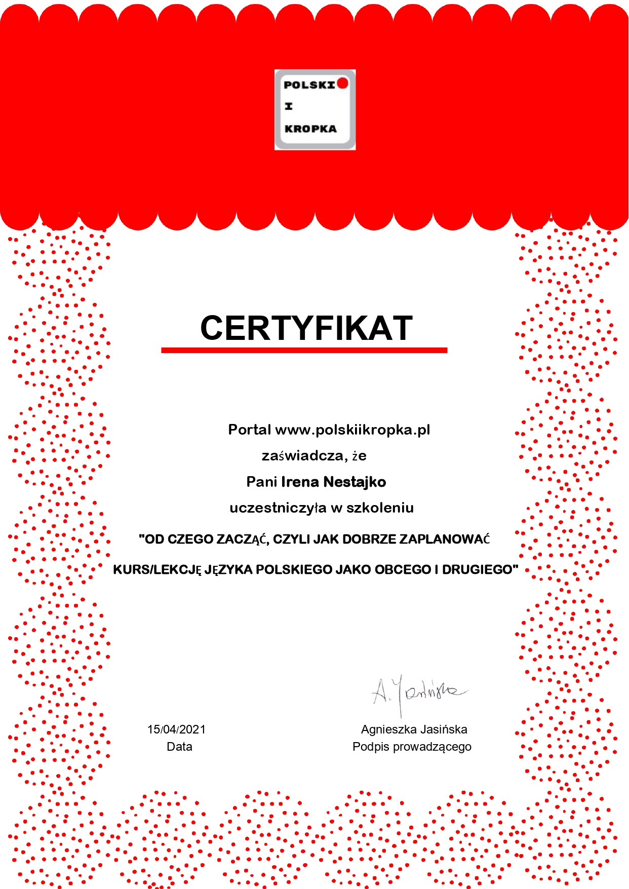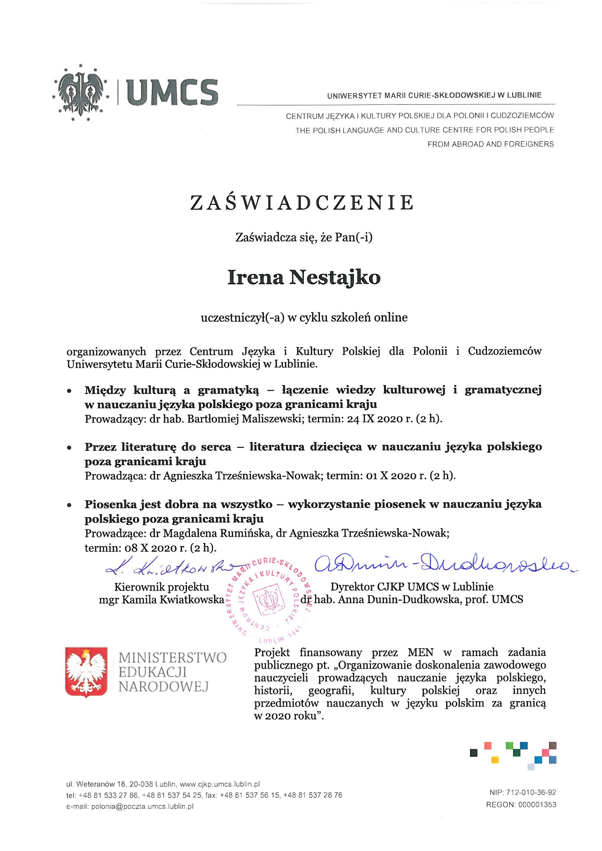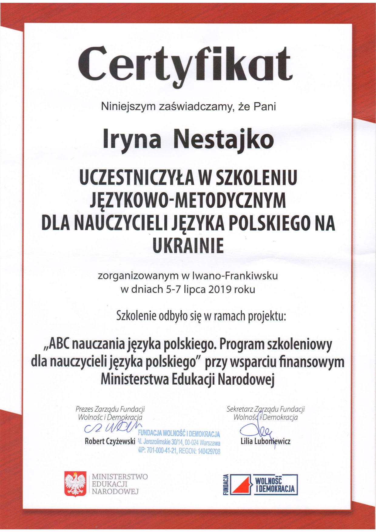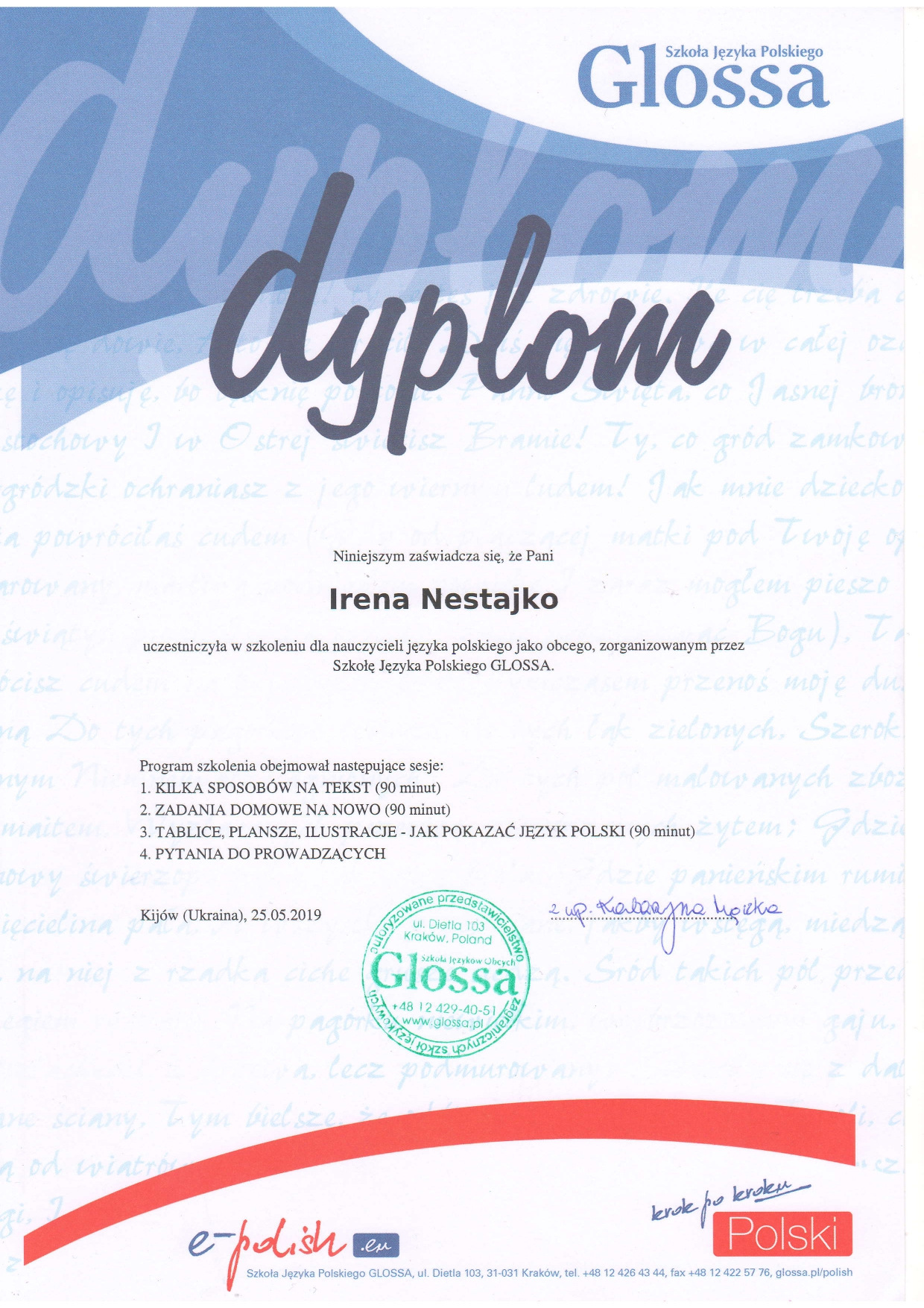 У 2001 р. за рекомендацією університету навчалася на курсах польської мови та культури для іноземців в м. Жешові (Польща).