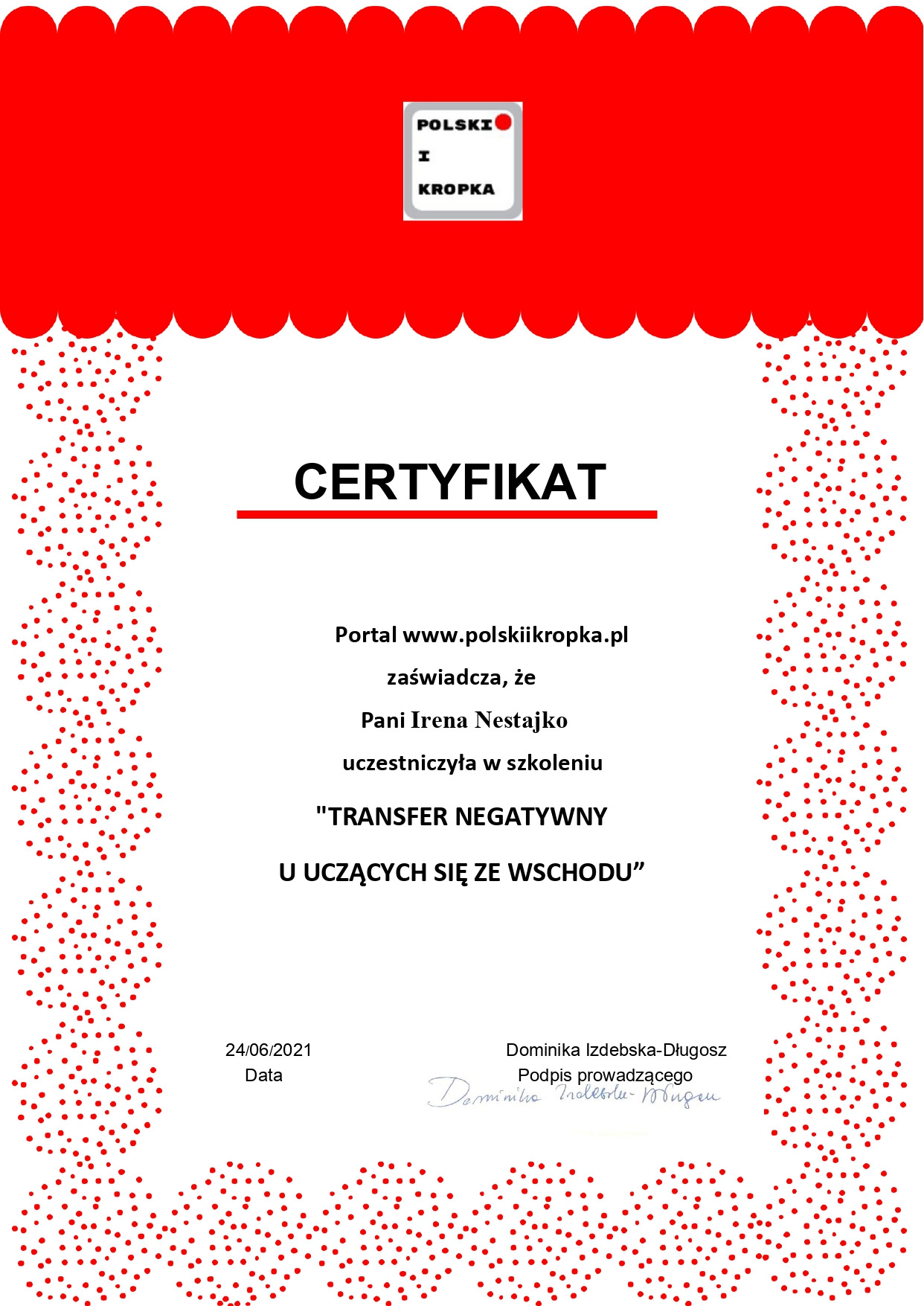 У 2008 р. успішно захистила кандидатську дисертацію на тему: «Підготовка учнівської молоді до життя в сім’ї у Республіці Польща».