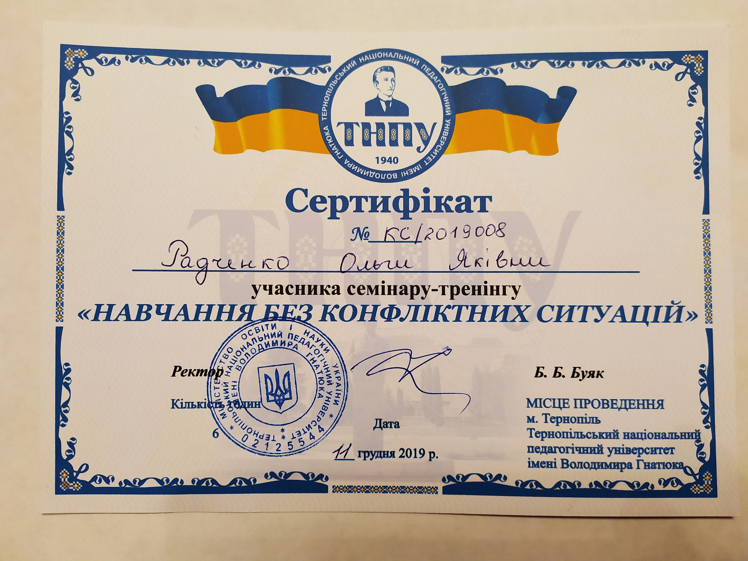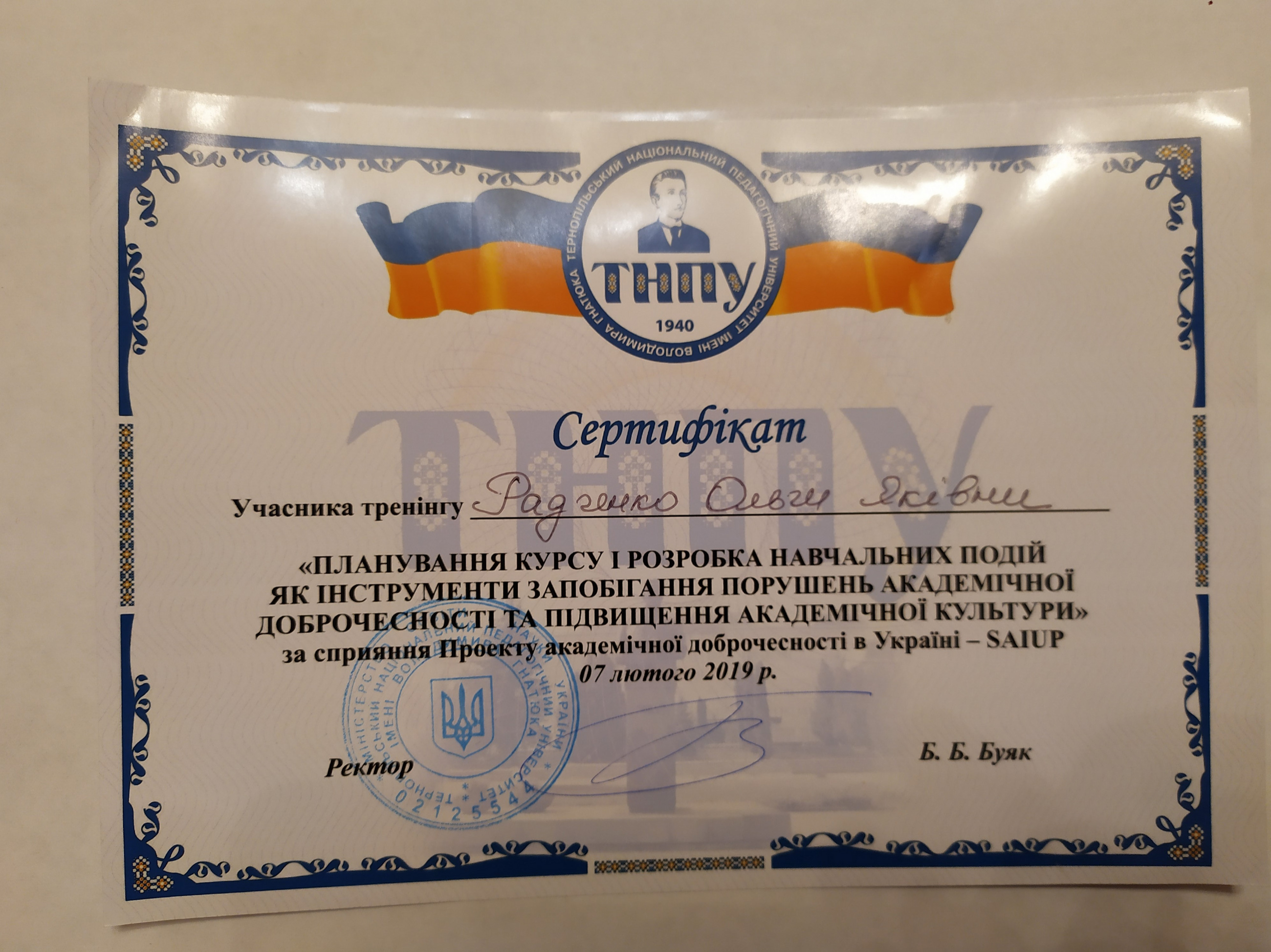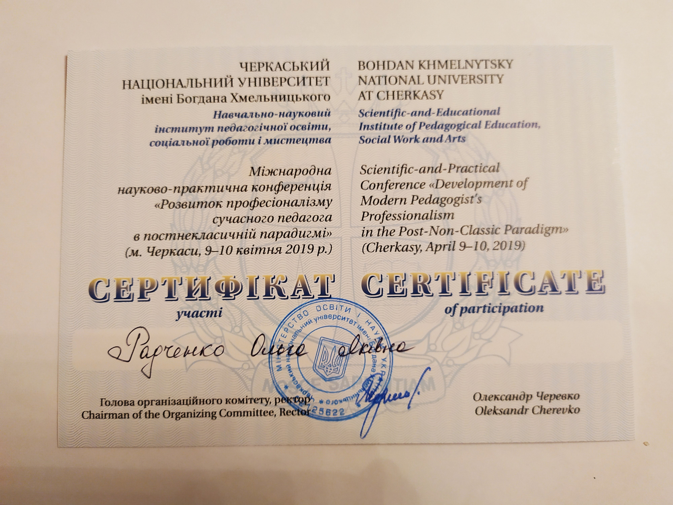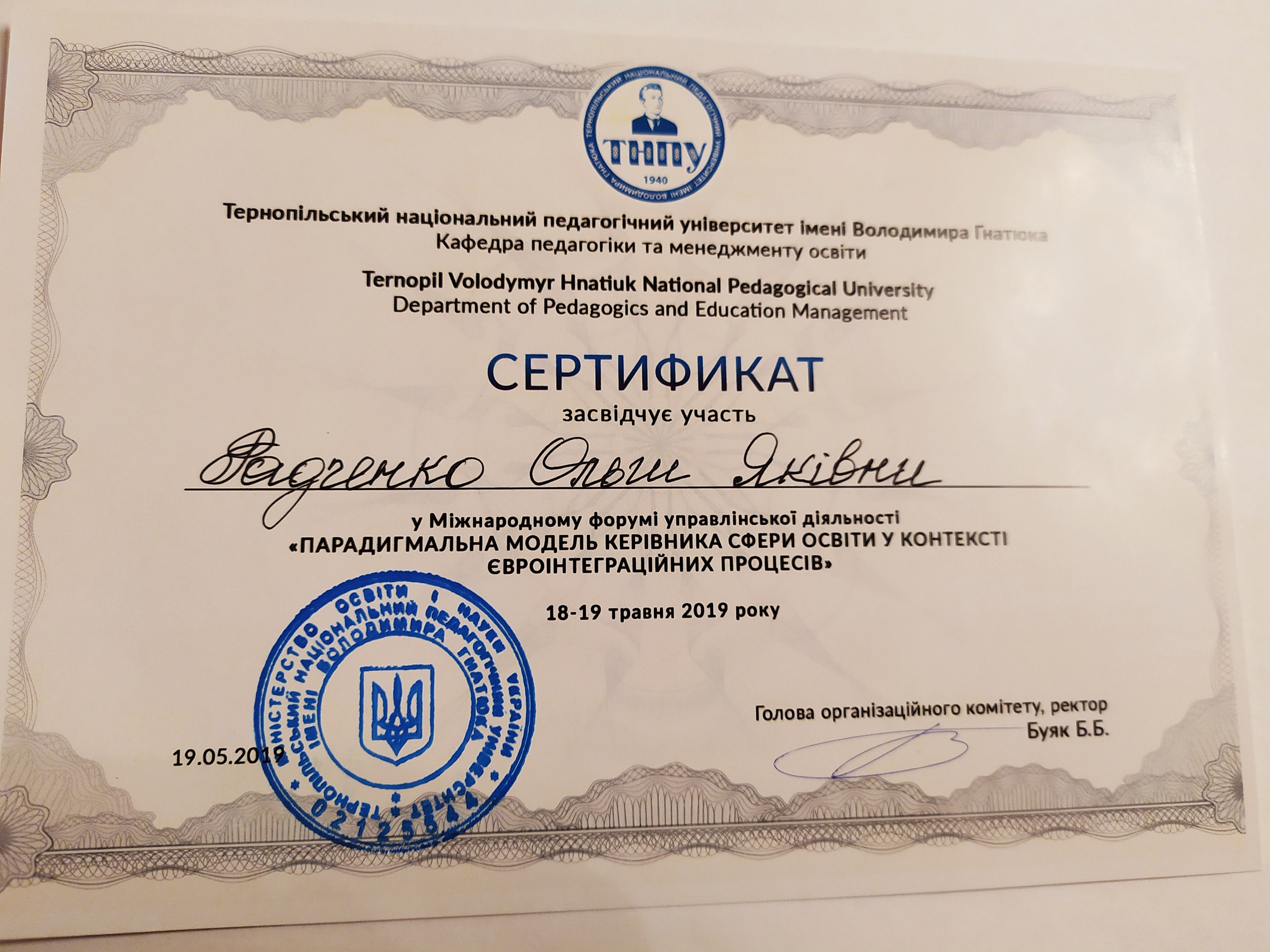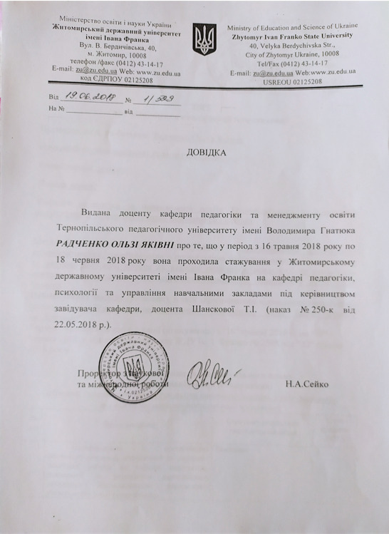 Стажування у Житомирському державному університеті імені Івана Франка (2018 рік). Тема стажування: «Підвищення ефективності викладання педагогічних дисциплін».