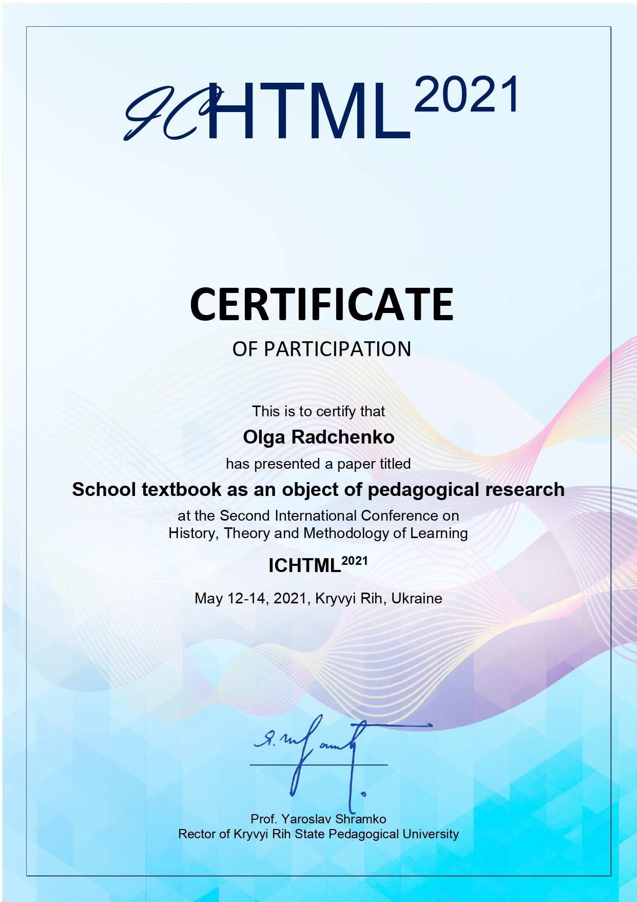 - Yaroslava Kodliuk, Nadiya Bibik, Ihor Kodliuk, Liubov Kodliuk, Olha Radchenko. School textbook as an object of pedagogical research SHS Web of Conferences 104, 02009 (2021)