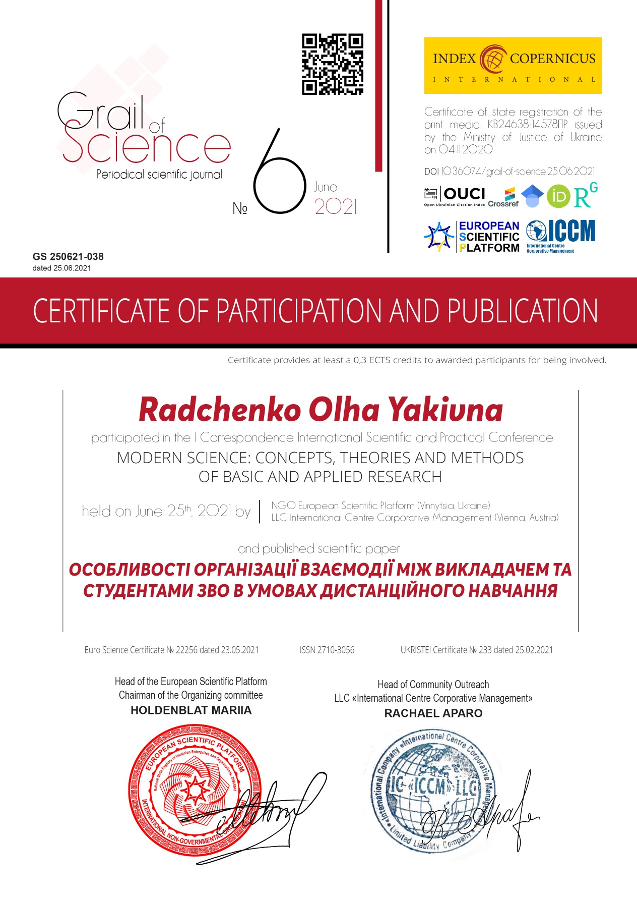 - Researcher ID https://publons.com/researcher/1472816/olha-radchenko/