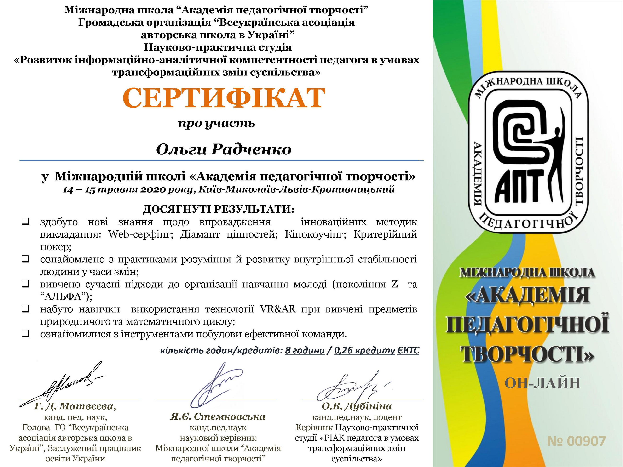 - Радченко О. Я. Інноваційні технології як складова освітнього середовища сучасного закладу освіти. Актуальні проблеми управління закладами освіти в контексті стратегії модернізації освітньої галузі: колективна монографія / за загальною редакцією В. П. Кравця, Г. М. Мешко. Тернопіль: ТНПУ ім. В. Гнатюка, 2020. С. 70-83.