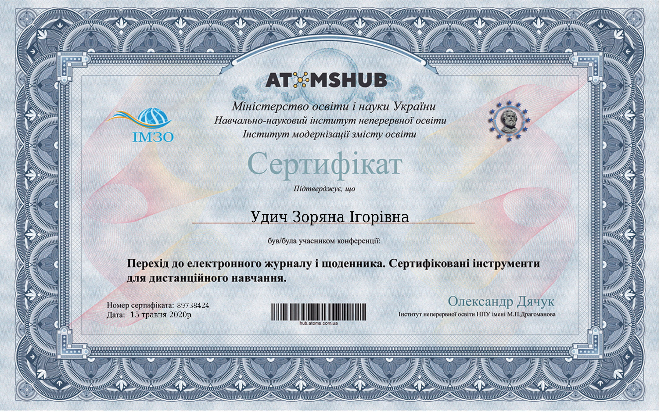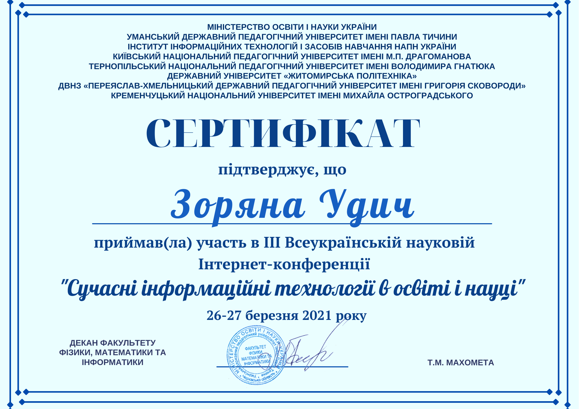 Удич З.І. Нова українська школа: виклик у підготовці сучасного учителя. Вища школа і ринок праці: інтеграція модернізація, інтернаціоналізація: збірник тез доповідей Всеукраїнської науково-практичної конференції 19-21 жовтня 2016 р., Мукачево / Ред кол.: Т. Д. Щербан (гол.ред.) та ін. Мукачево: Вид.-во МДУ. С. 231-233.