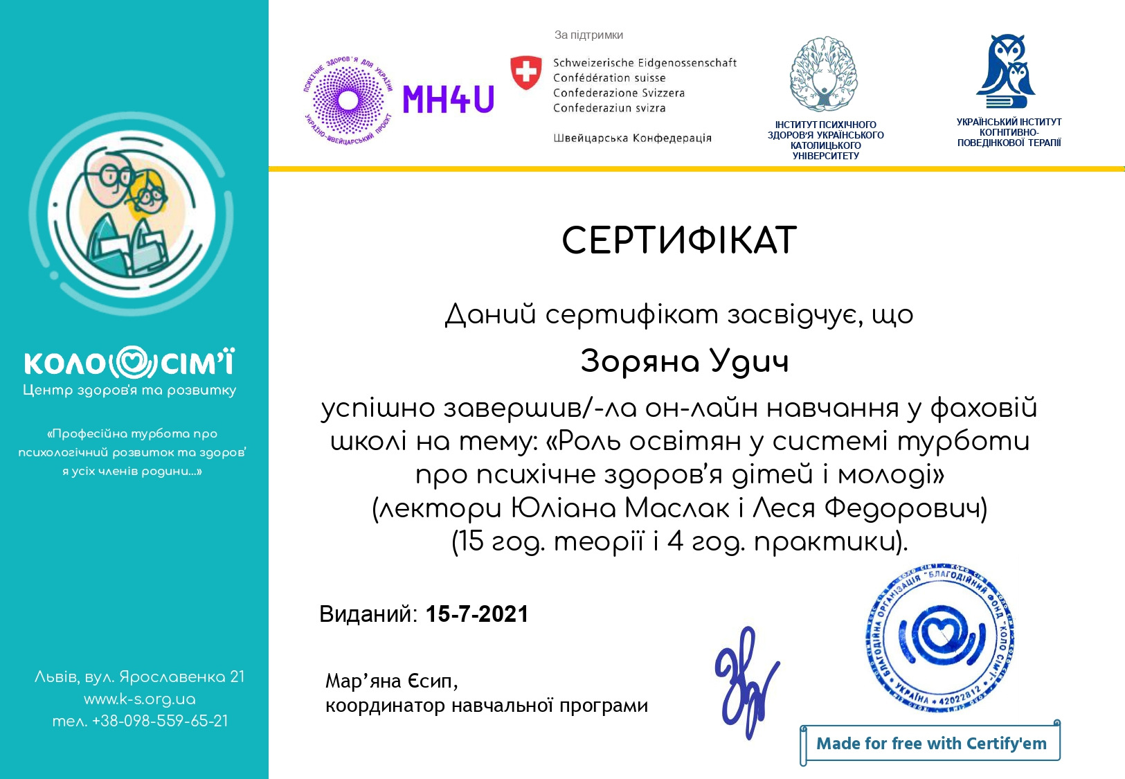 - для батьків/опікунів та родичів дітей з інвалідністю: «Виховна система сім'ї, у якій зростає дитина із порушенням у розвитку».