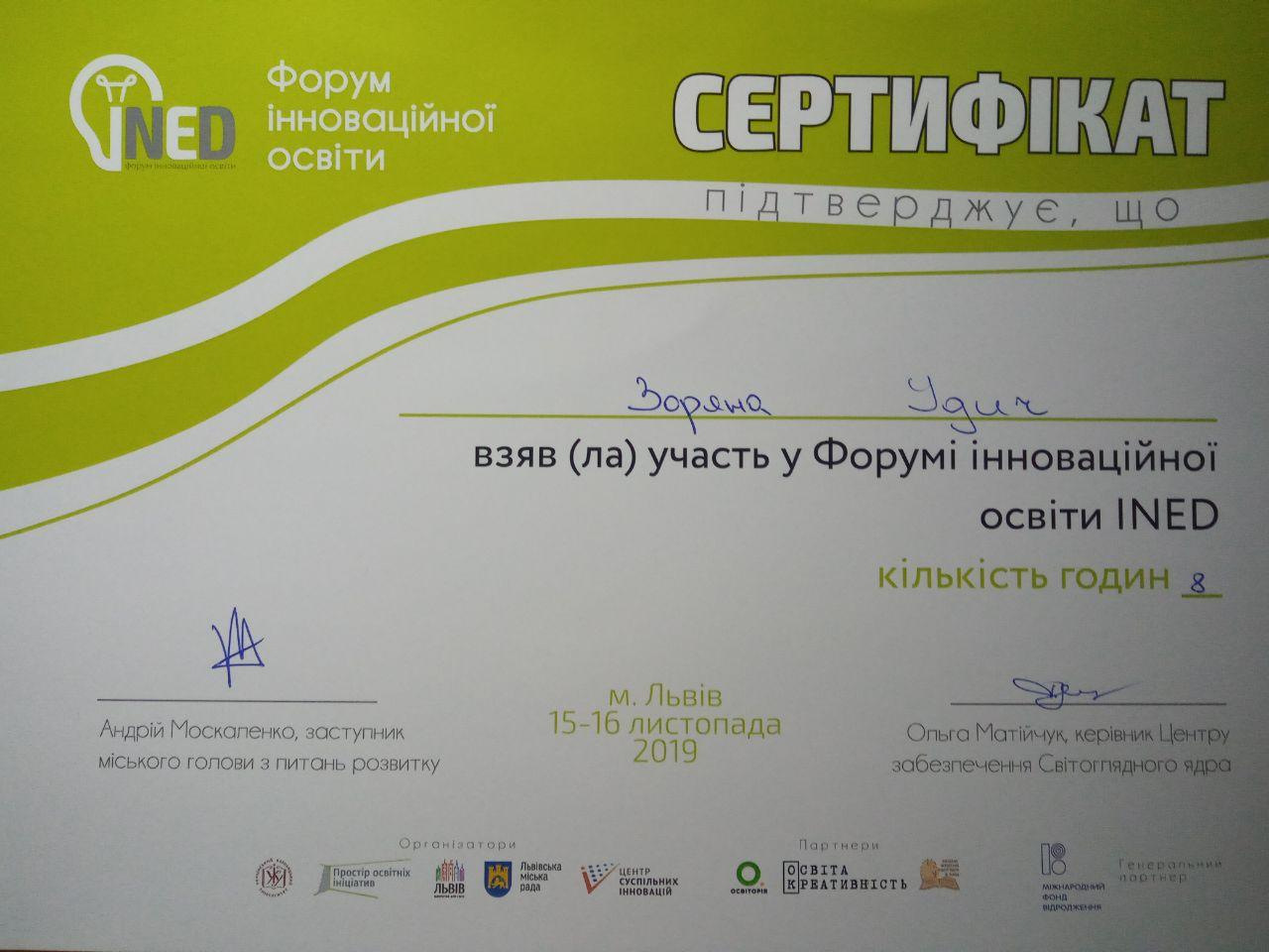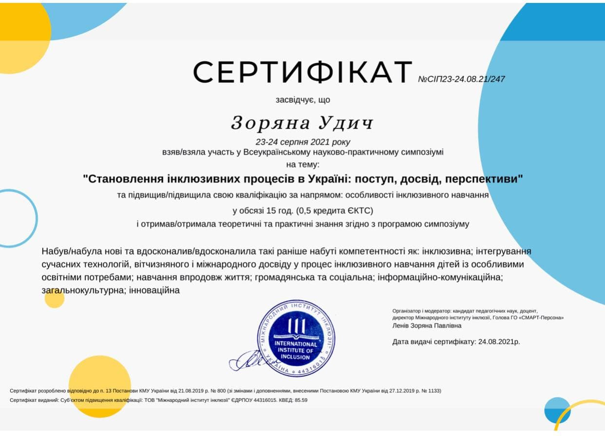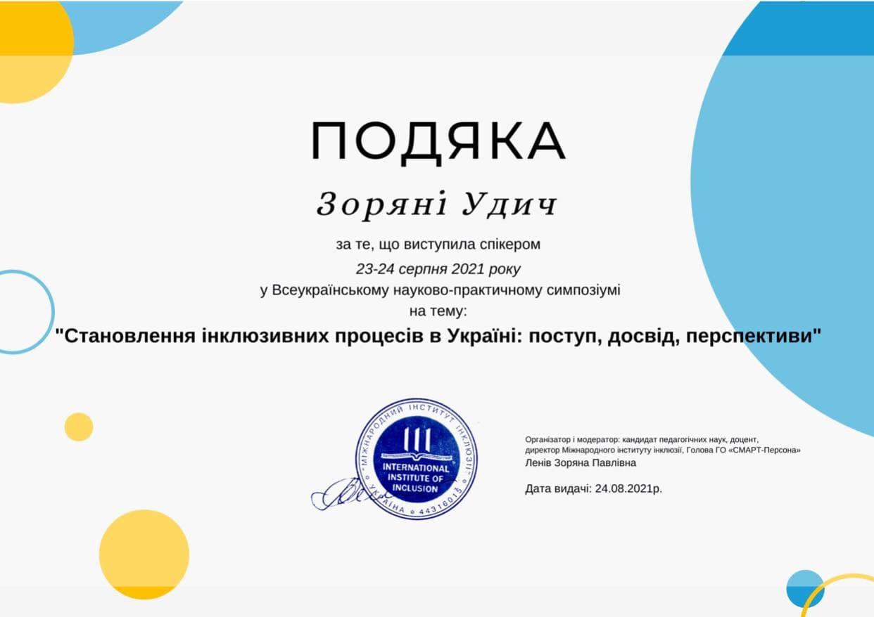 Удич З.І. Інклюзивне середовище загальноосвітнього закладу: ресурсний аспект.Освітні інновації: філософія, психологія, педагогіка: збірник наукових статей у 2-х частинах / За заг. ред. О.В. Засименко. Суми: ОП Цьома С.П. 2017. Ч.1. С. 88-92.