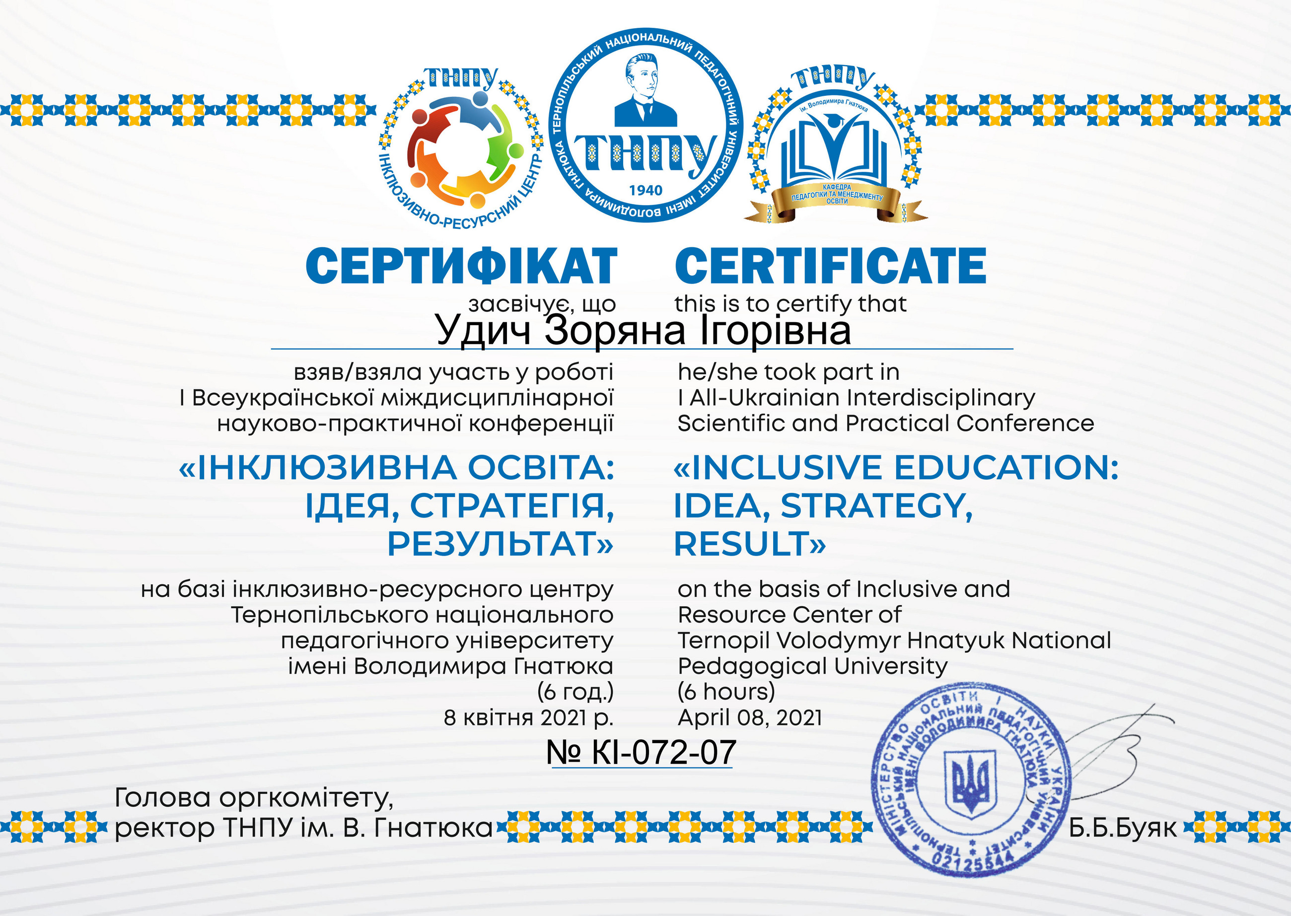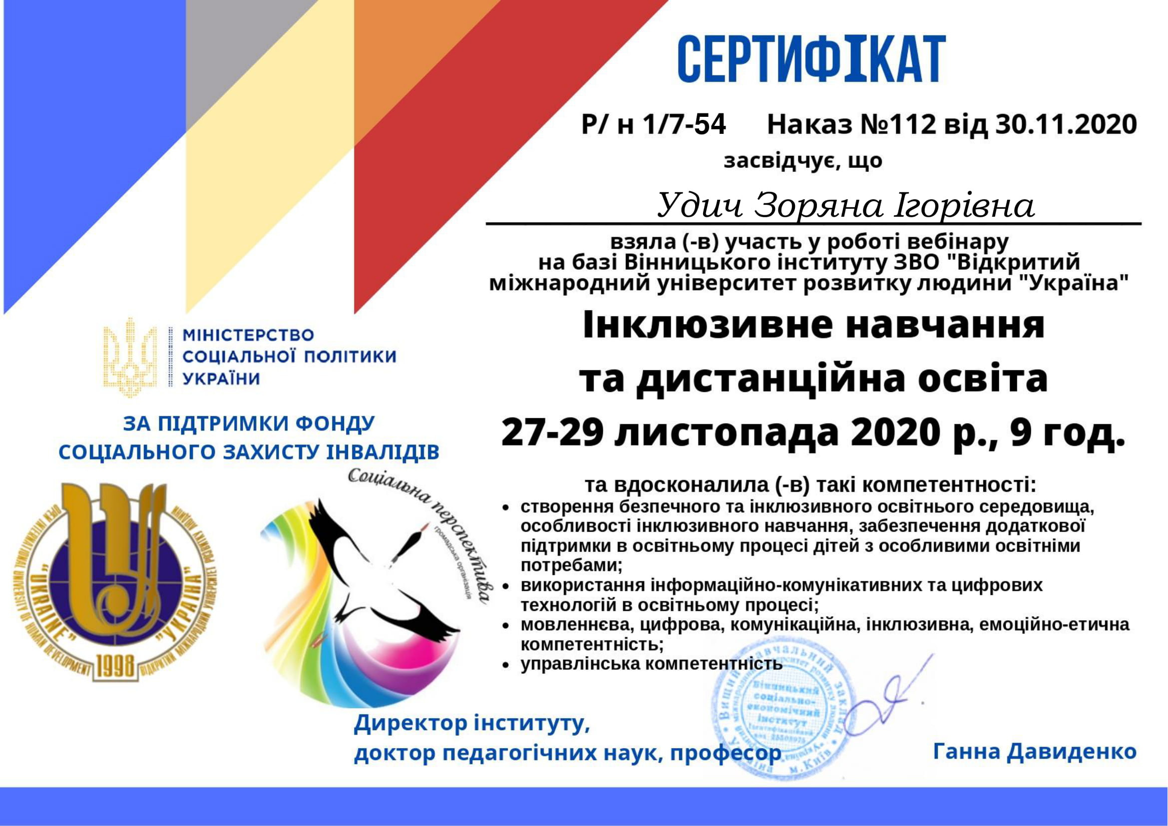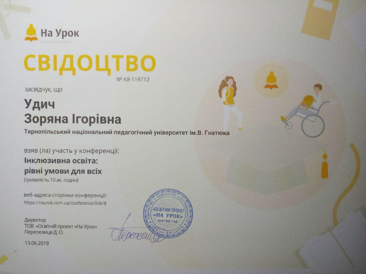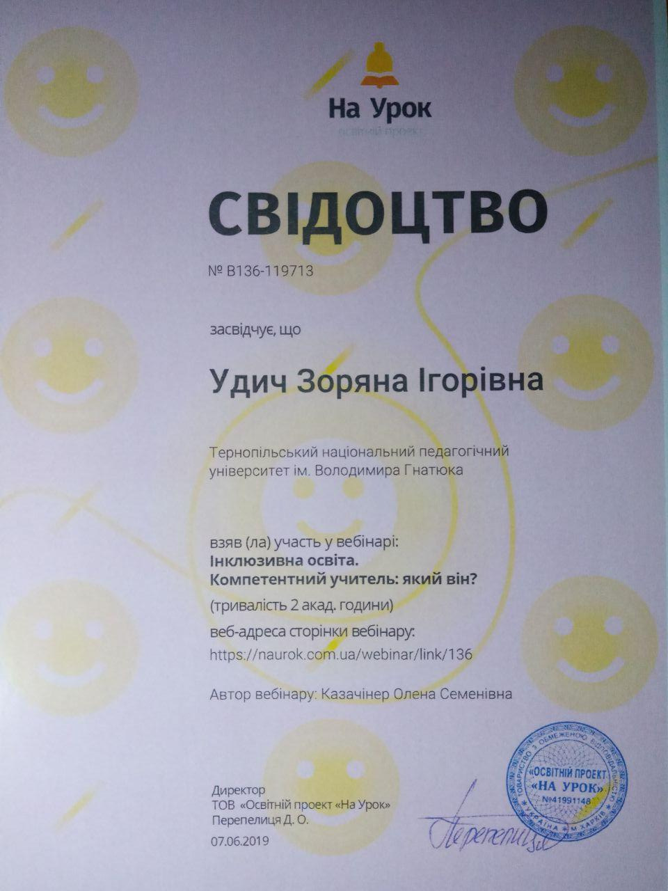 Удич З.І. Самоорганізація учителя як складова його інклюзивної компетентності. Міжнародний науковий журнал «ОСВІТА І НАУКА» / ред. кол.: Т.Д. Щербан (гол. ред.); заст. гол. ред.: Jerzy Piwowarski; В.В. Гоблик. Мукачево-Ченстохова: РВВ МДУ; Гуманістично-природничий університет ім. Яна Длугоша в місті Ченстохові. 2019. Вип. 1(26). С. 192-199.