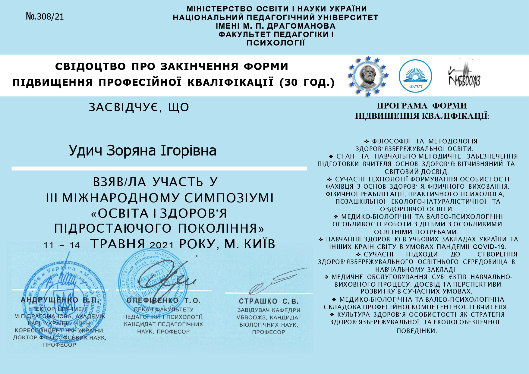 Удич З.І. Медико-біологічні основи інклюзивної компетентності педагогів закладів середньої загальної освіти. Педагогіка здоров’я : збірник наукових праць VIII Всеукраїнської науково-практичної конференції / за заг.ред. акад. І.Ф. Прокопенка. Харків : ХНПУ ім. Г.С. Cковороди. 2018. С. 767-770.