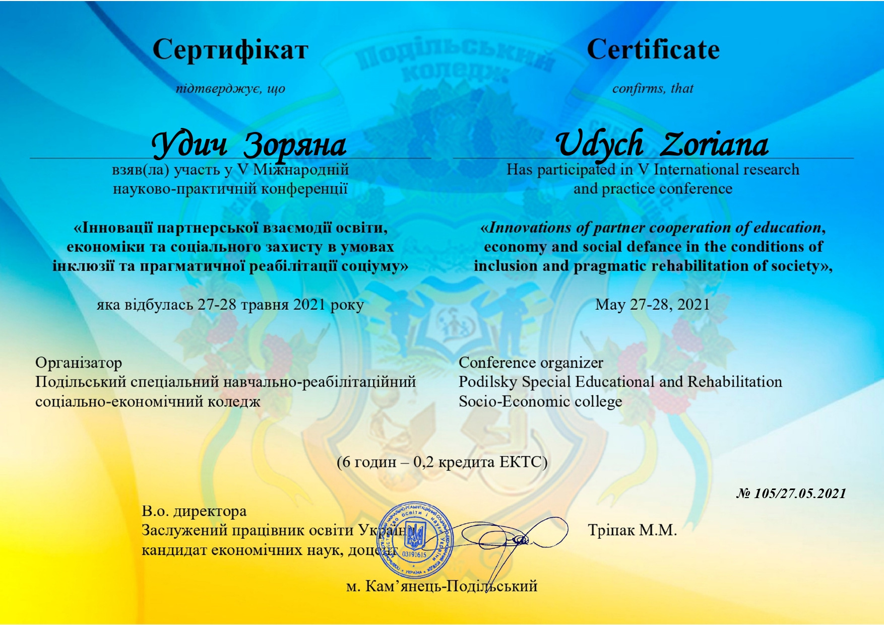 Удич З.І. Адаптація абітурієнтів з інвалідністю в середовищі закладу вищої освіти. Сучасні стратегії ґендерної освіти в умовах євроінтеграції : збірник матеріалів Міжнародної науково-практичної конференції, 10–11 вересня 2020 р. / за заг. ред. В. П. Кравця, О. М. Кікінежді. Тернопіль : ТНПУ ім. В. Гнатюка, 2020. С. 261-263.