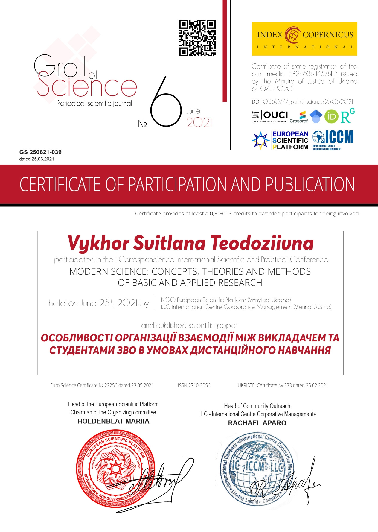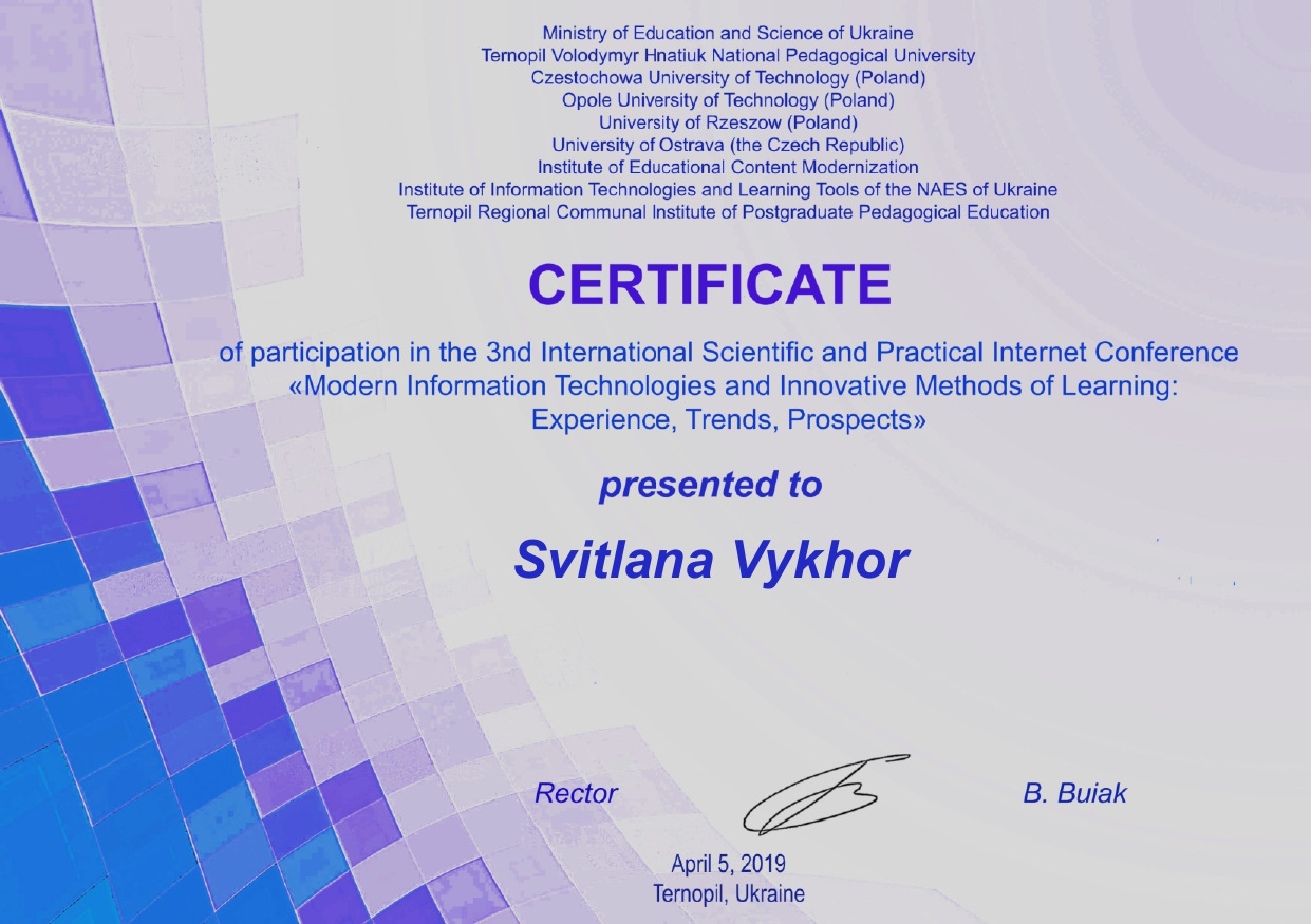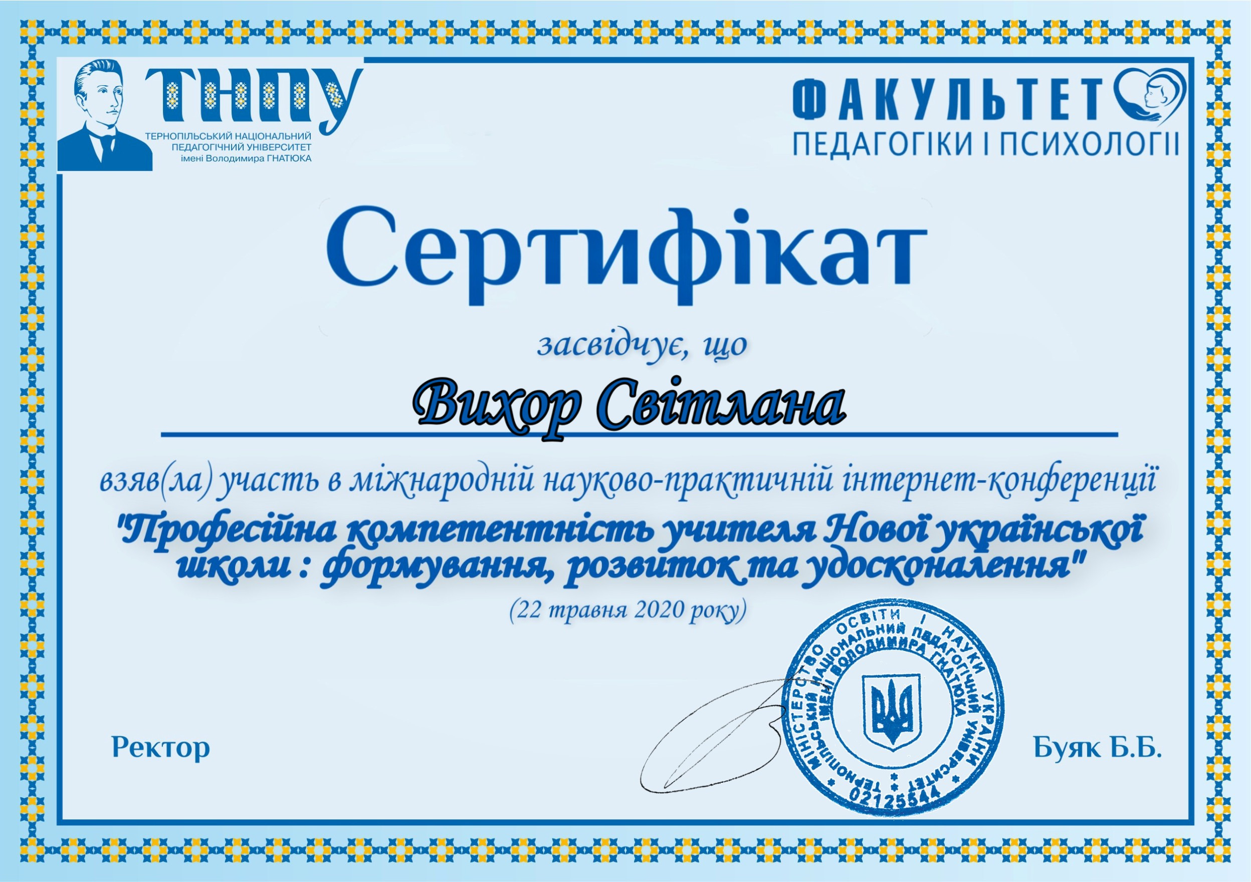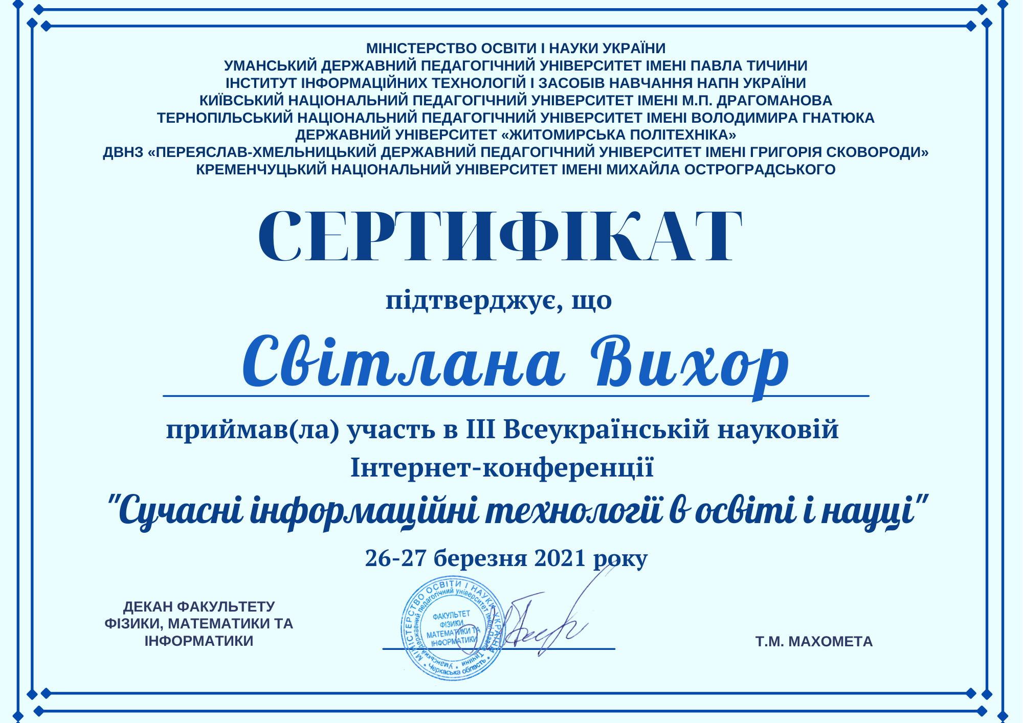 - Радченко О. Я., Вихор С. Т. Підготовка вчителя до використання електронного підручника в навчальному процесі. Матеріали міжнародної науково-практичної інтернет-конференції «Професійна компетентність учителя Нової української школи: формування, розвиток та удосконалення». Тернопіль: ТНПУ. 2020. С. 72-75.