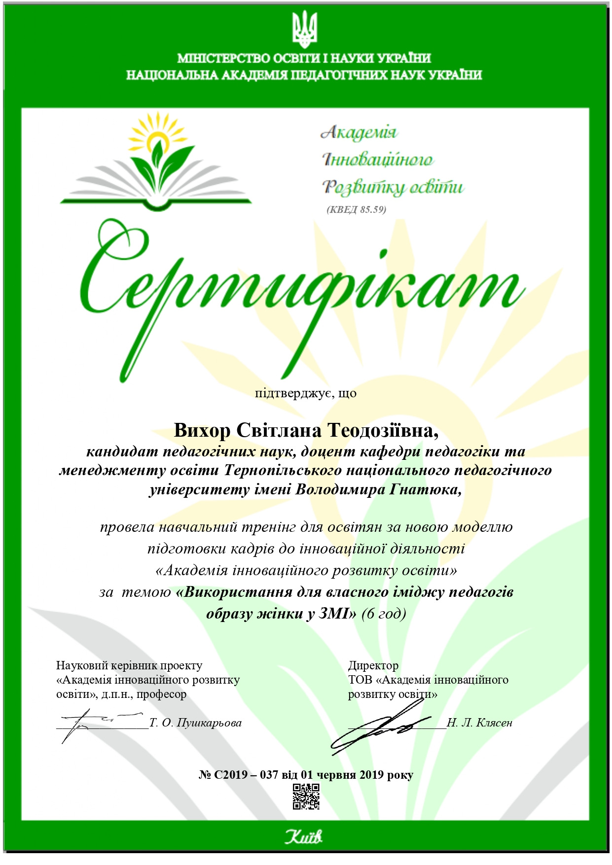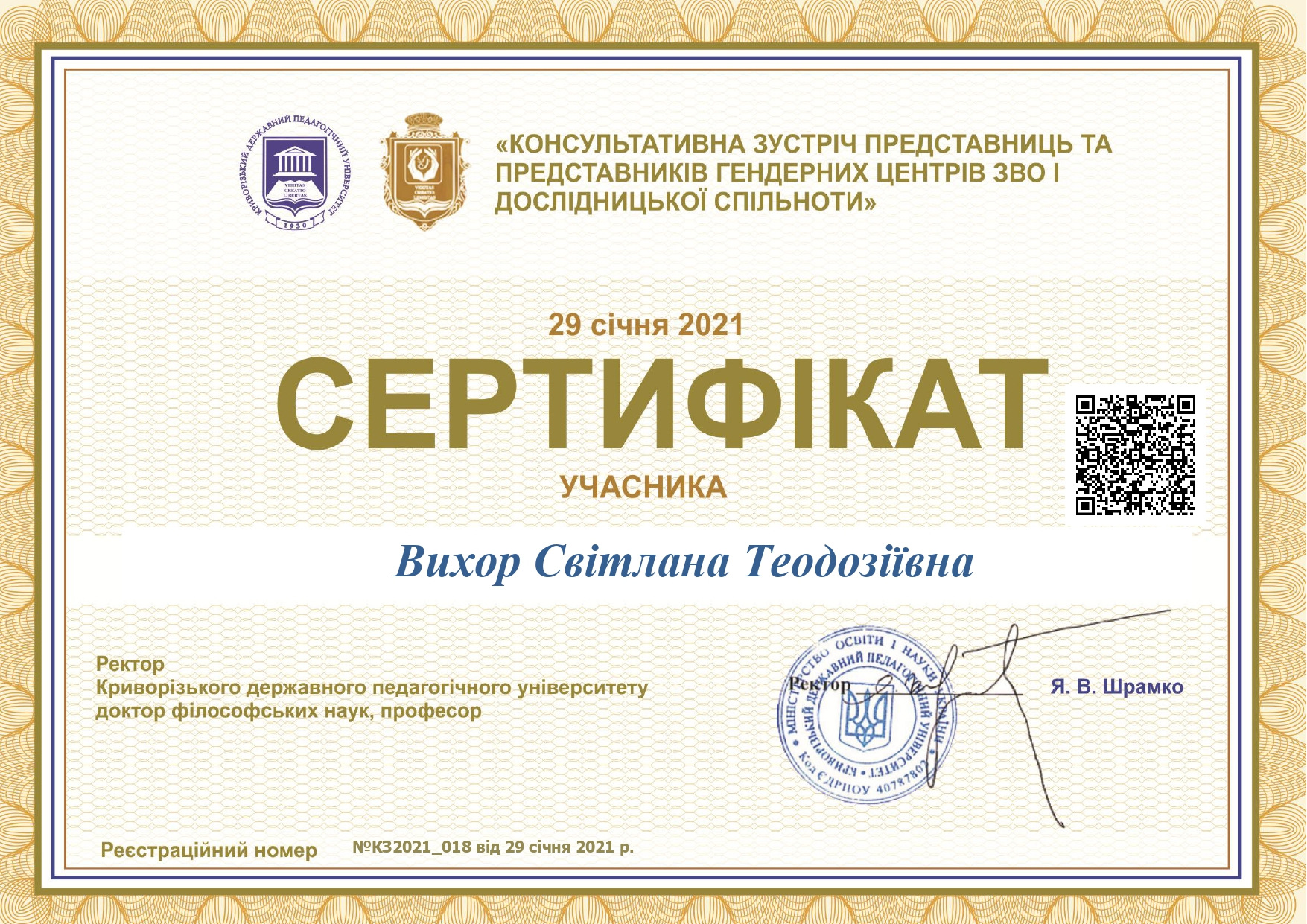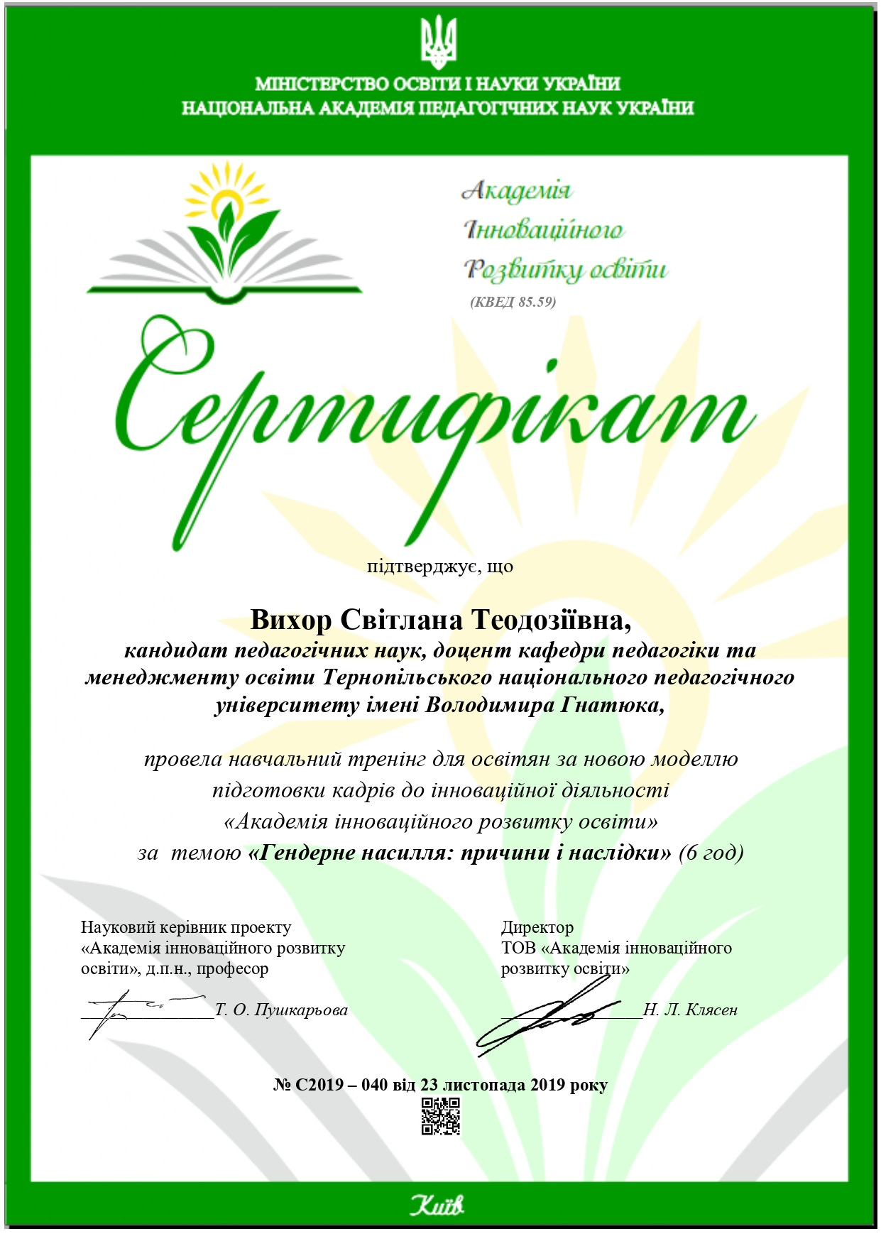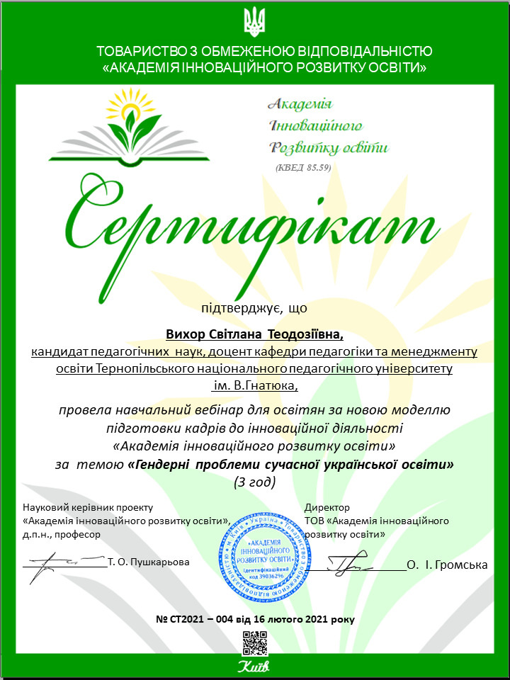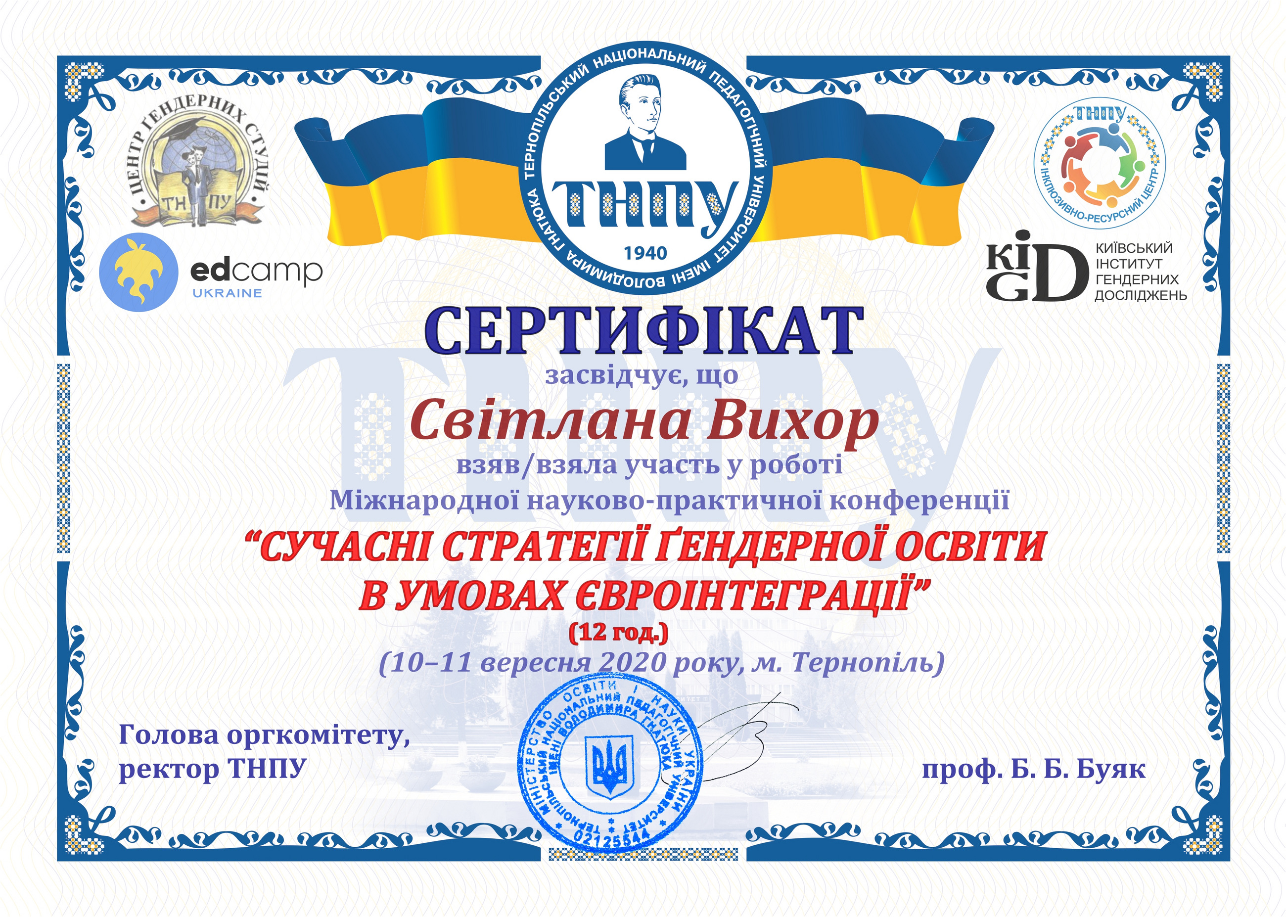 - Вихор С. Законодавче забезпечення ґендерної рівності в освітньому просторі України. Сучасні стратегії ґендерної освіти в умовах євроінтеграції: збірник матеріалів Міжнародної науково-практичної конференції, 10–11 вересня 2020 р./Тернопільський національний педагогічний університет імені Володимира Гнатюка ; за заг. ред. В. П. Кравця, О. М. Кікінежді. Тернопіль : ТНПУ ім. В. Гнатюка, 2020. С. 10-13.