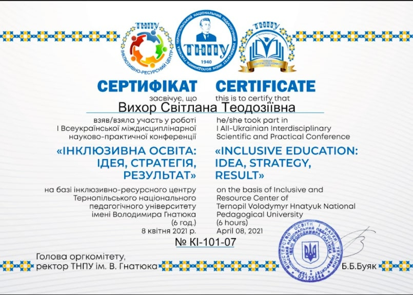 - Талюш Т. М., Вихор С.Т. Використання інтерактивних технологій у діяльності групи продовженого дня. Сучасні інформаційні технології та інноваційні методики навчання: досвід, тенденції, перспективи. Матеріали ІІІ Міжнародної науково-практичної інтернет-конференції (м. Тернопіль, 5 квітня, 2019) — 172 с. / С. 158-159.