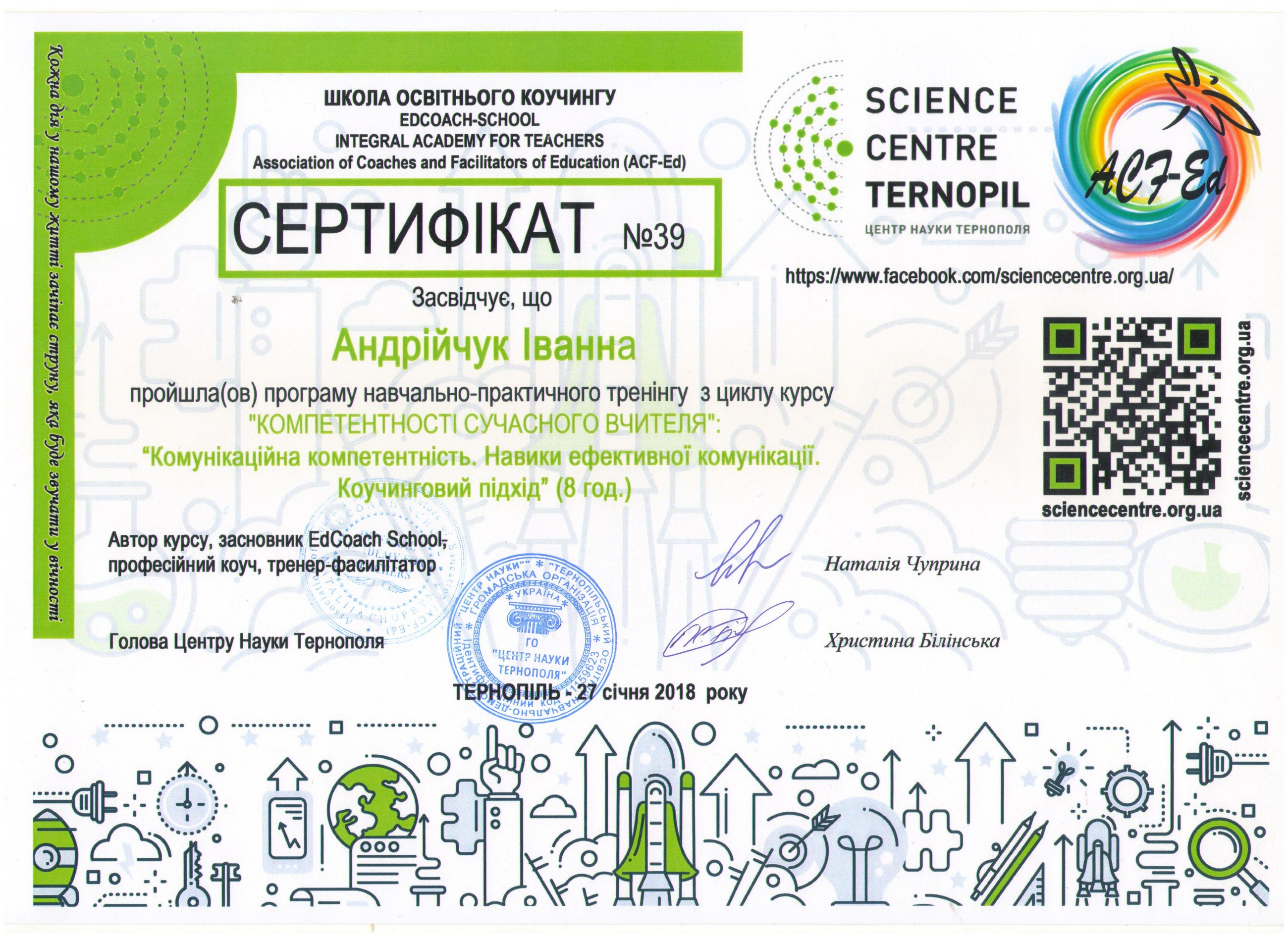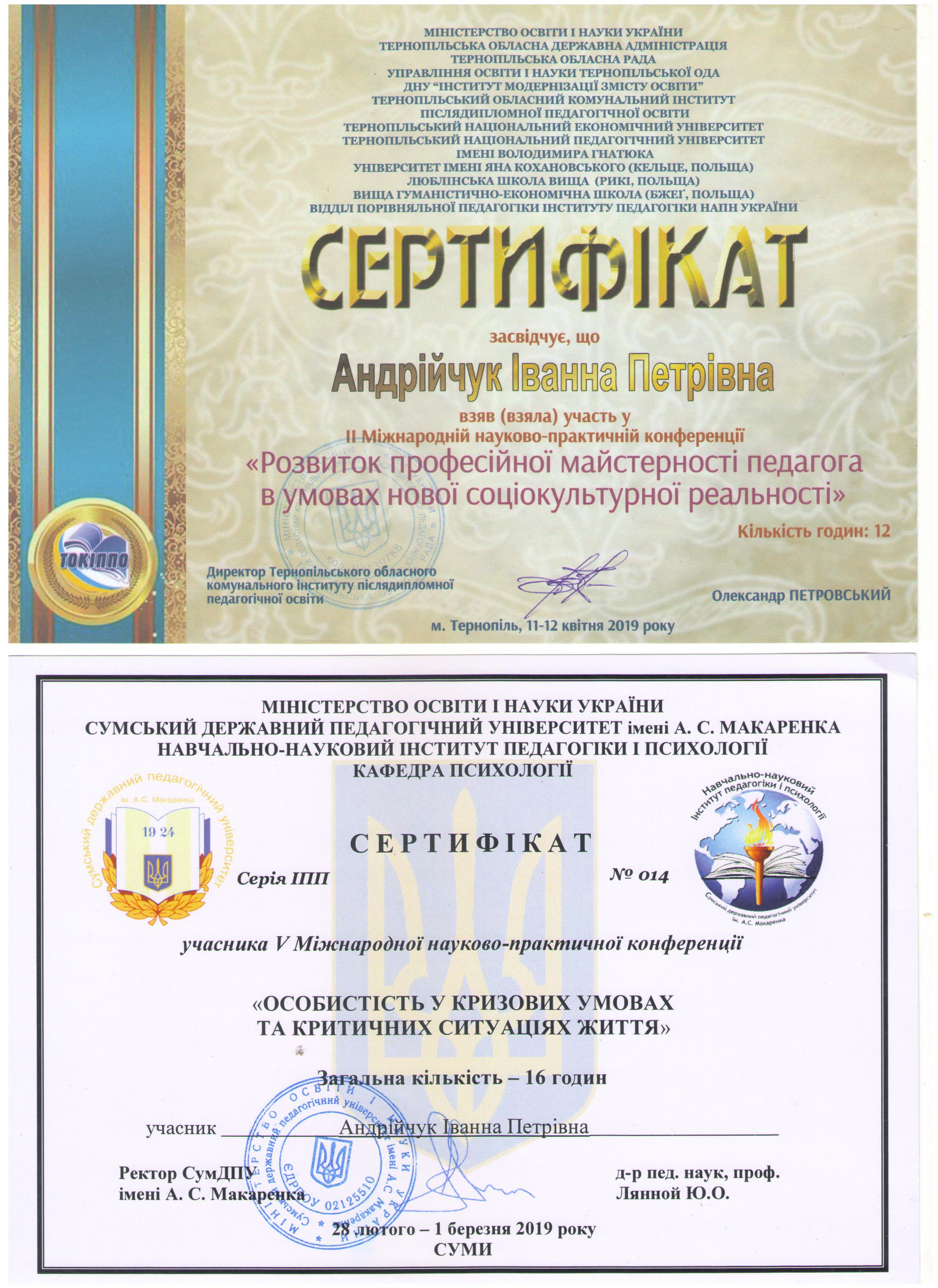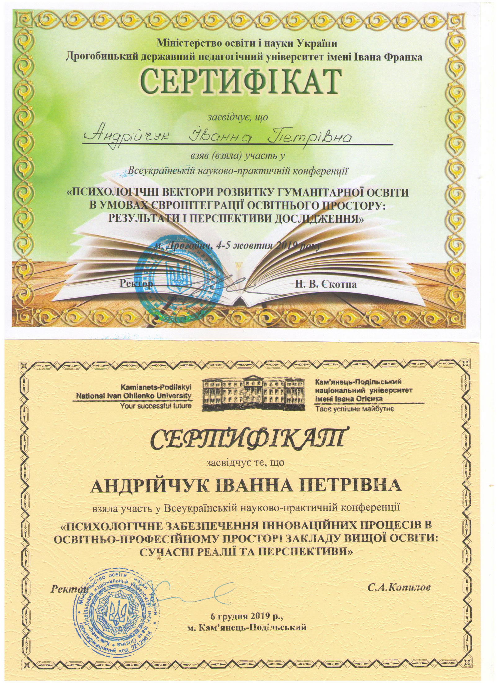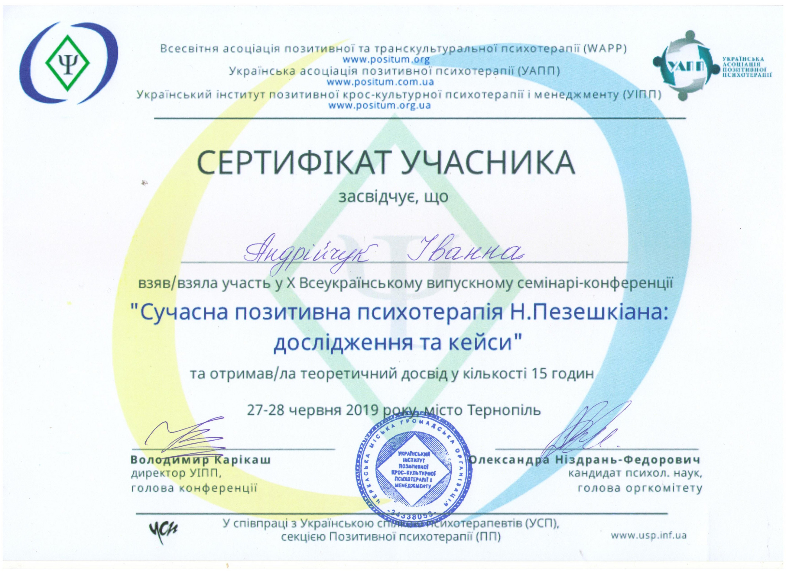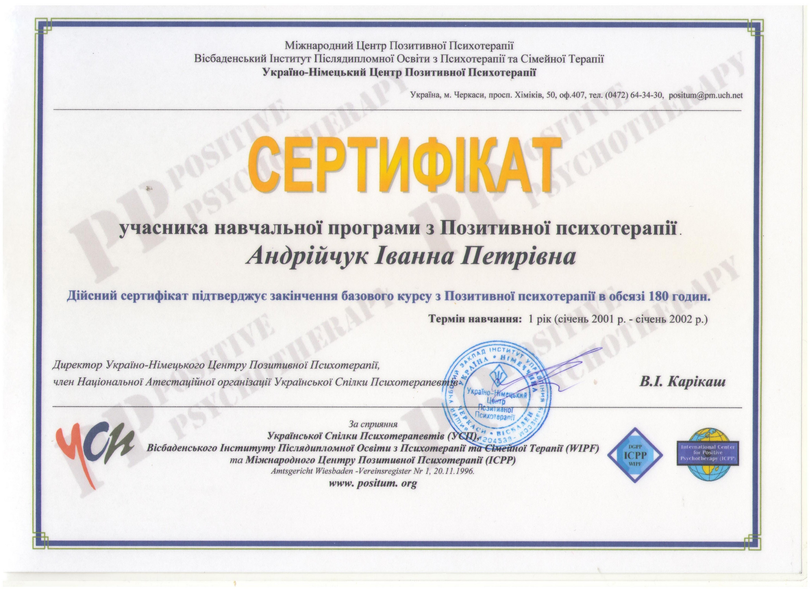 У 2001 – 2002 рр. закінчила базовий курс з Позитивної психотерапії та отримала сертифікат консультанта в напрямку позитивної психотерапії.