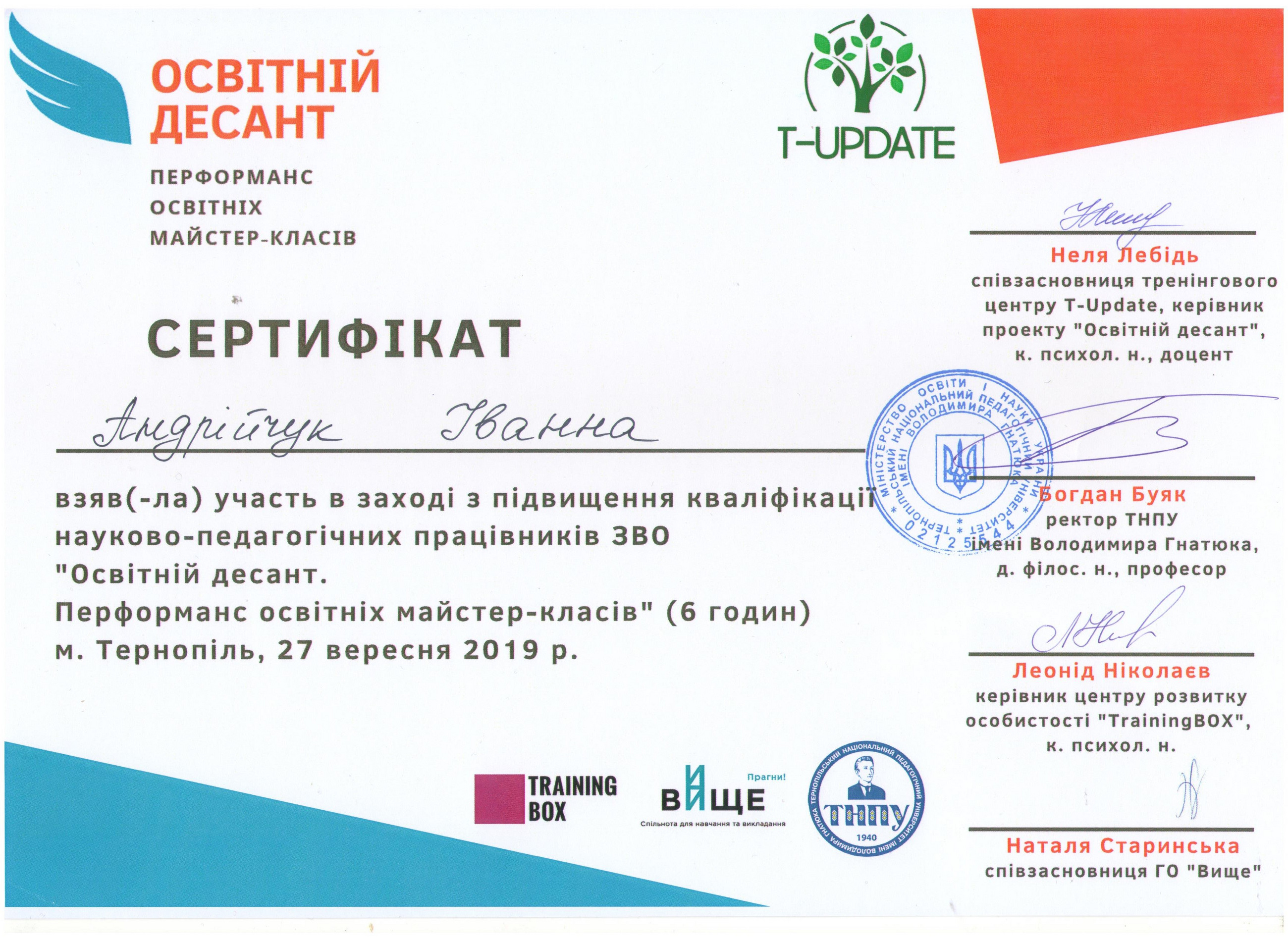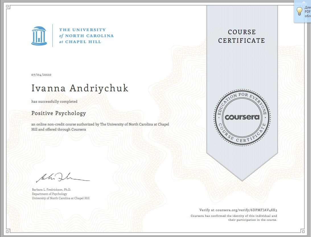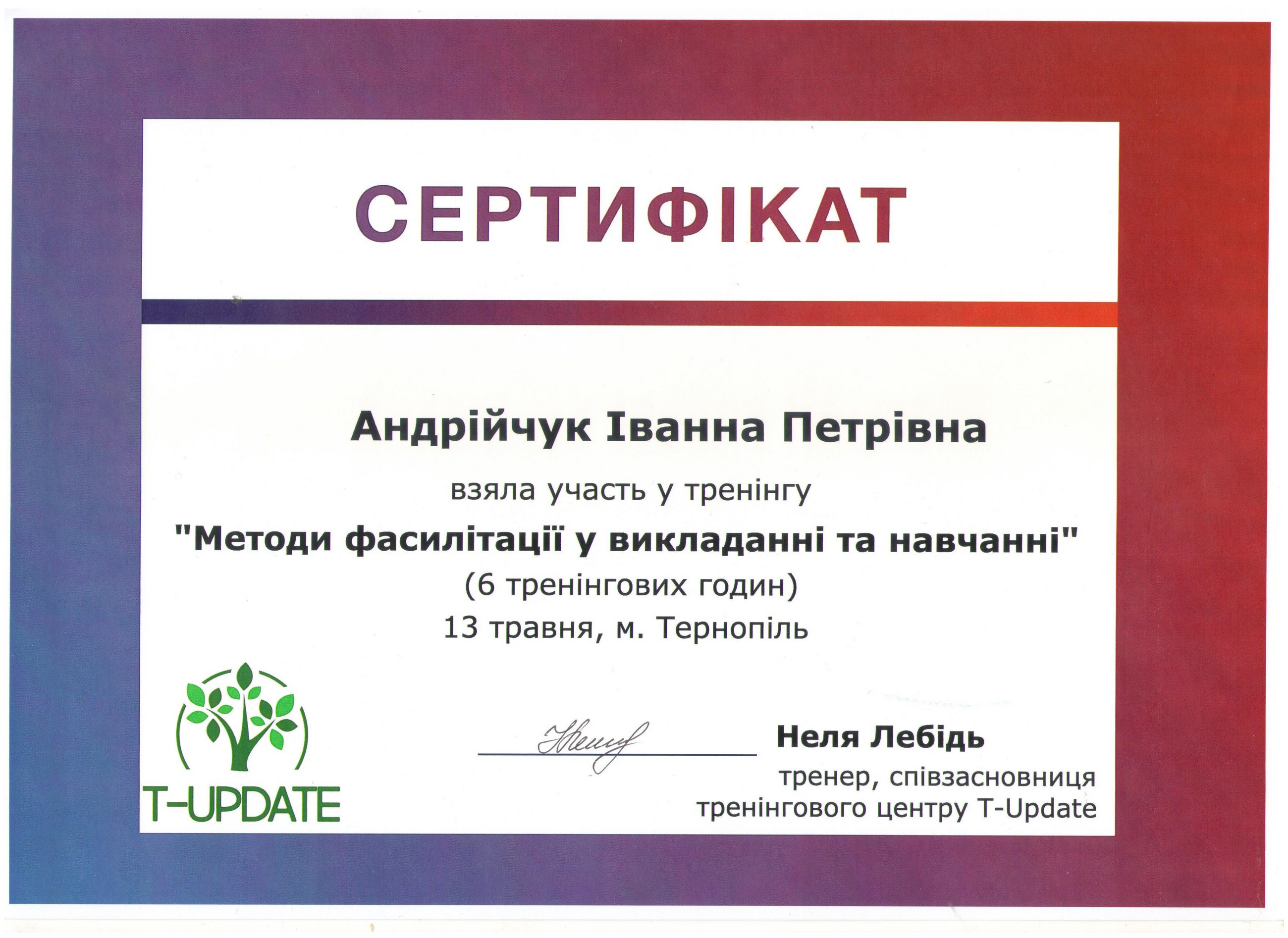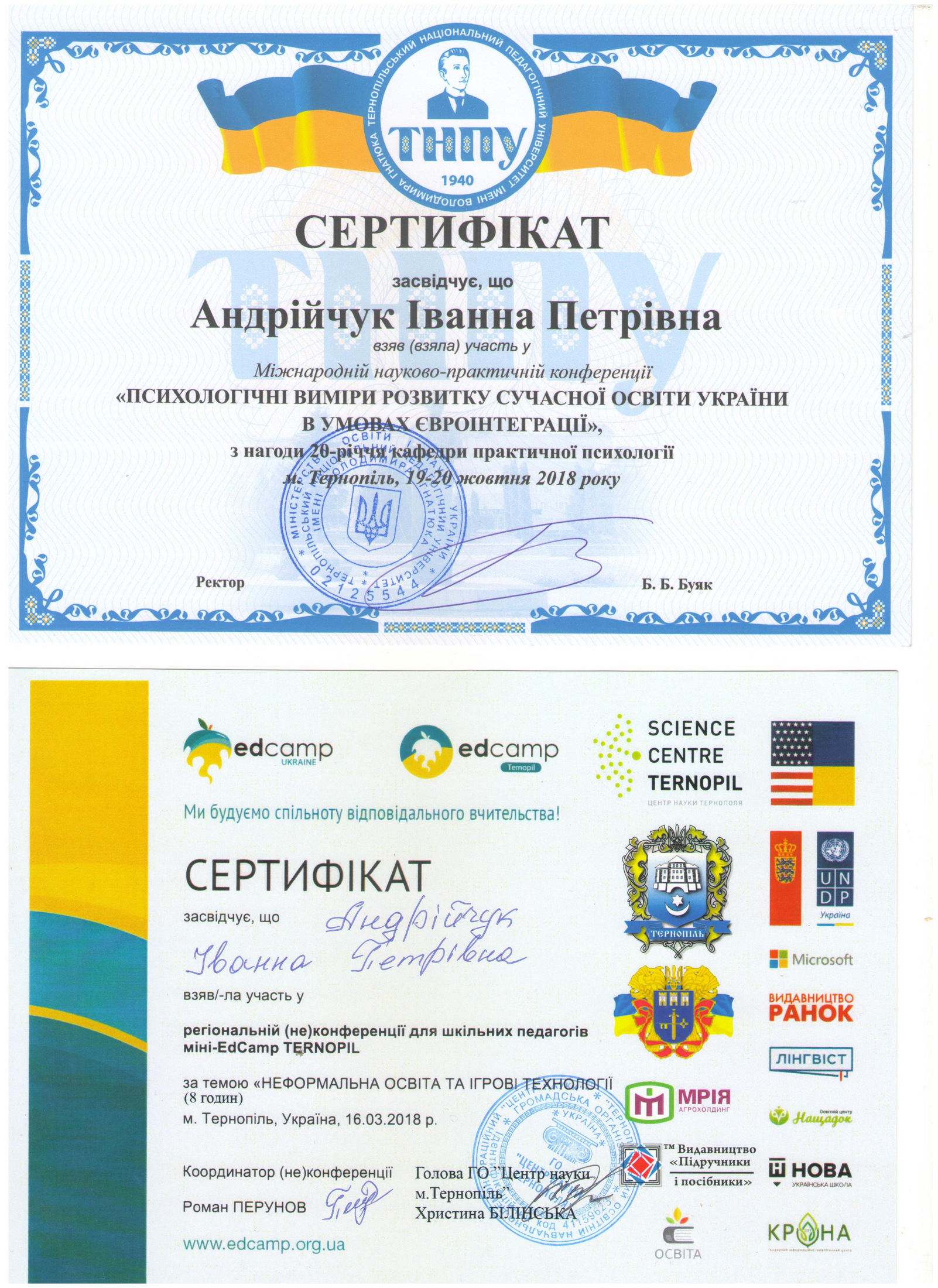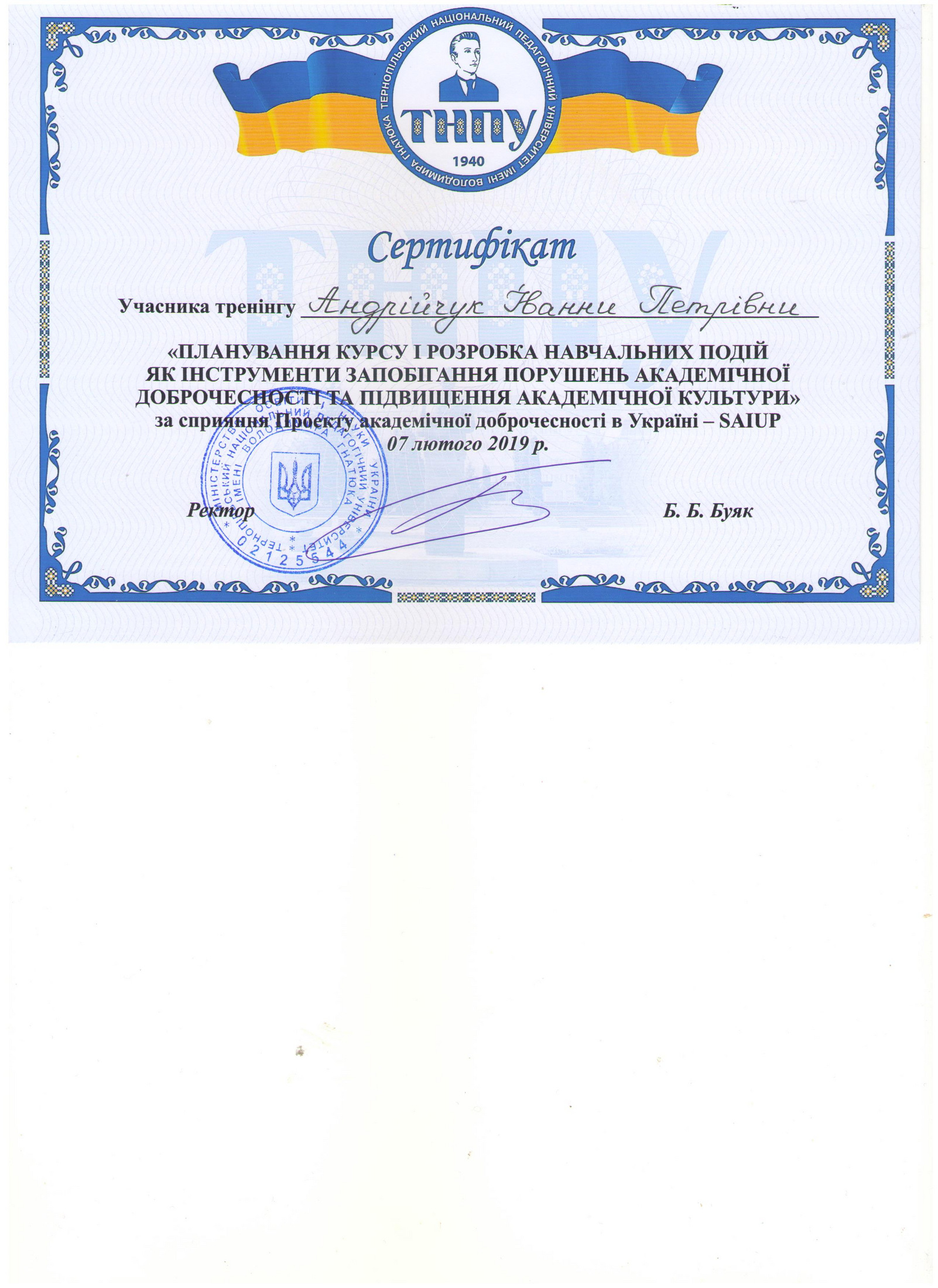 У 2001 – 2002 рр. закінчила базовий курс з Позитивної психотерапії та отримала сертифікат консультанта в напрямку позитивної психотерапії.